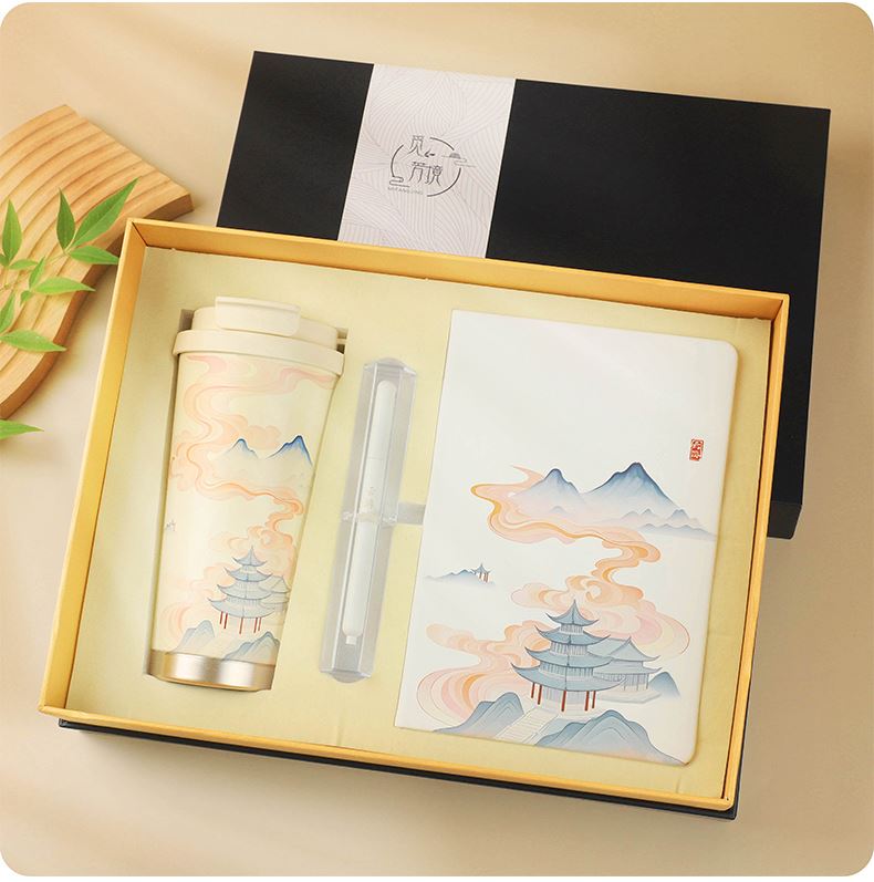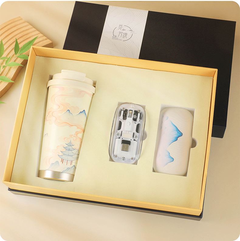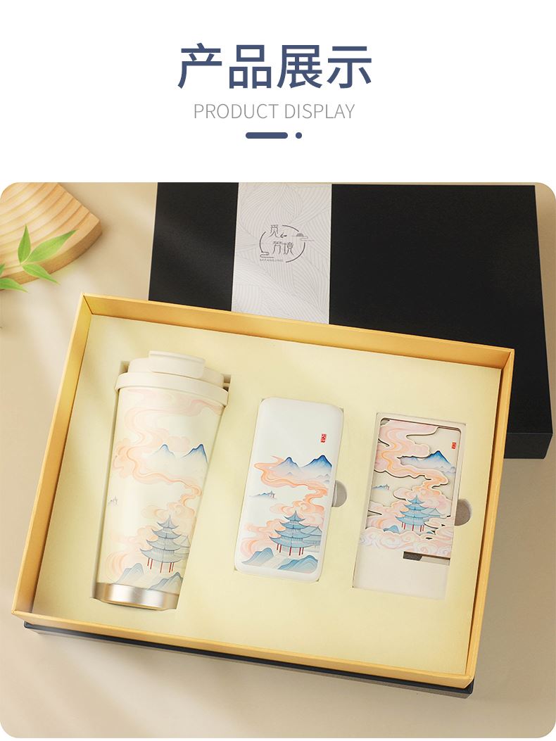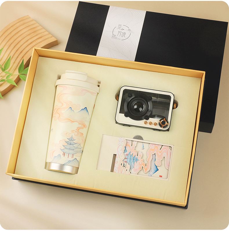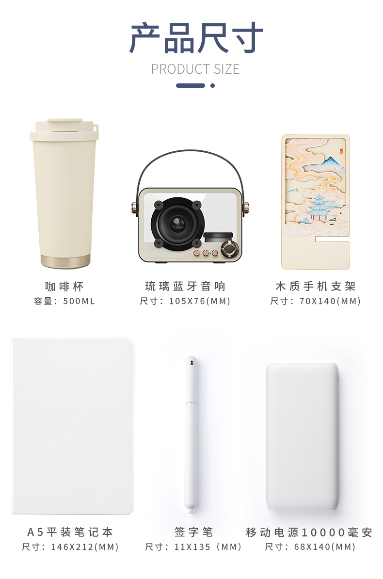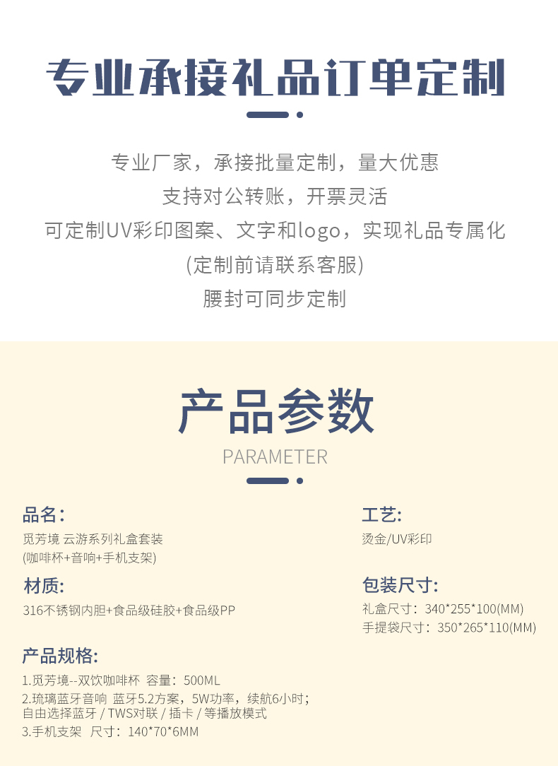 1.觅芳境--双饮咖啡杯 容量:500ml 内胆:316 外壳:304 杯盖:食品级PP 吸管:食品级硅胶 吸嘴:食品级PP 密封圈:食品级硅胶 2.琉璃蓝牙音响 蓝牙5.2方案,5W功率,续航6小时; 自由选择蓝牙 / TWS对联 / 插卡 / 等播放模式 3.手机支架 140*70*6MM 礼盒尺寸:34*25.5*10cm 手提袋尺寸:35*26.5*11cm
