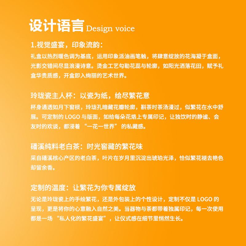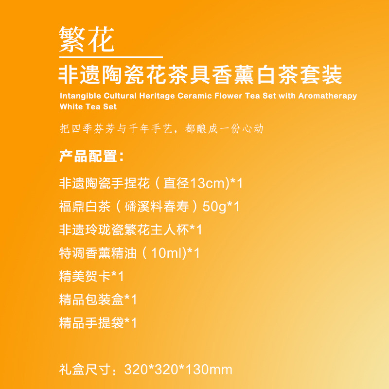 【产品配置】 福鼎白茶(50g)*1 菱烟非遗玲珑杯*1 非遗手捏花摆件(直径130mm)*1 特调香薰精油*1 贺卡*1 礼盒*1 礼袋*1 【产品说明】 陶瓷手捏花+玲珑瓷杯,非遗工艺打造; 花瓣玲珑杯设,茶汤流动如花绽放,视觉与味觉盛宴; 支持LOGO定制,从包装到茶具皆可烙印专属心意; 福鼎老白茶陈香醇厚,搭配特调香薰,品茶时沉浸式放松; 礼赠优选,商务、节日赠礼彰显仪式感。