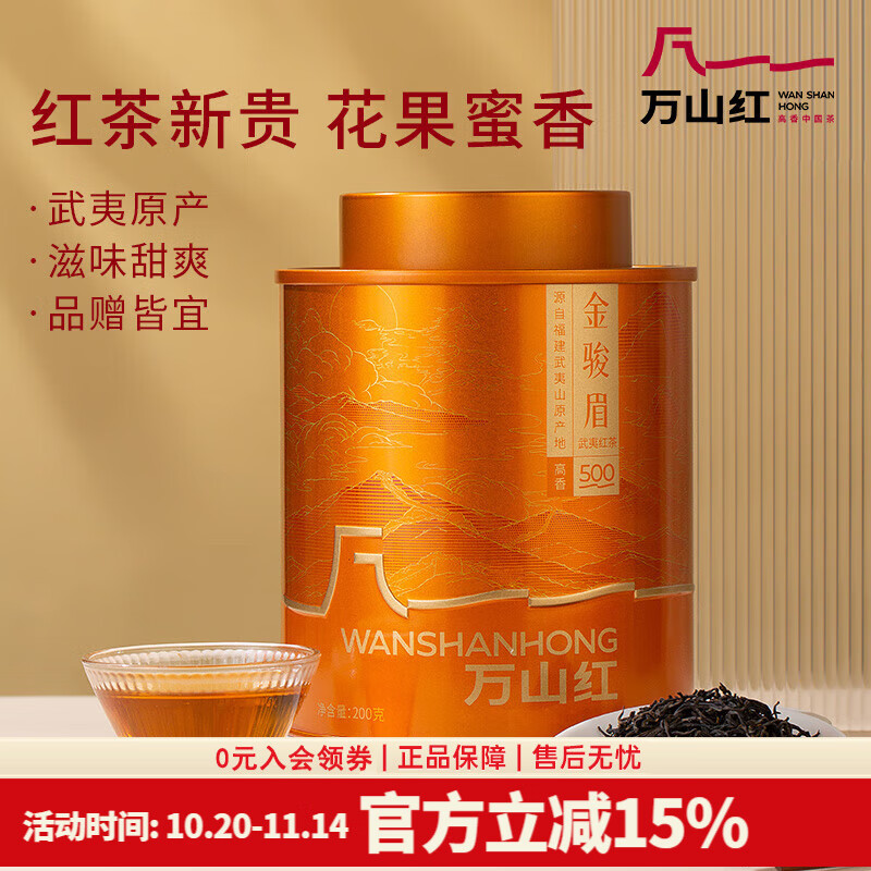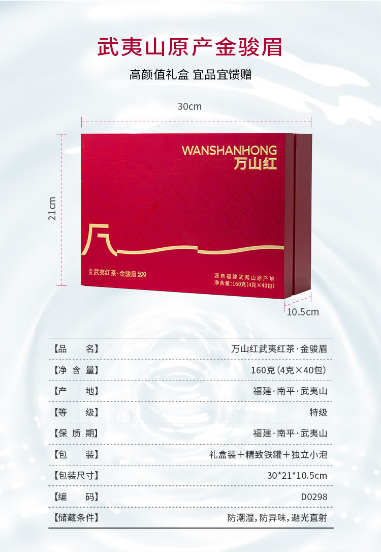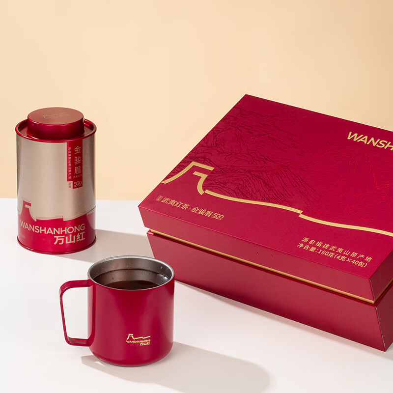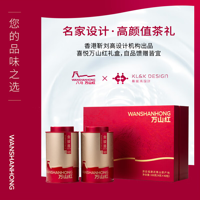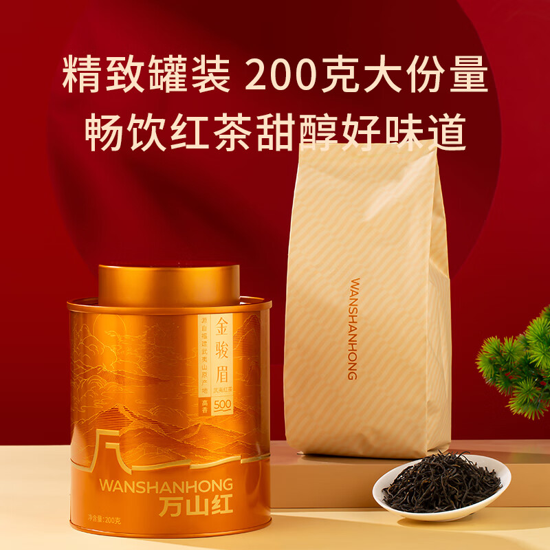 礼盒内配: 金骏眉80克*2罐 净含量:160克 单罐内配: 金骏眉200克 净含量:200g 推荐理由: 自饮一罐,送礼一盒; - 源自福建武夷山核心原产地,金骏眉属于武夷红茶中的精品品类,产地正宗性强。 - 金骏眉呈现花果蜜香,滋味甜爽醇厚,发酵充足,茶性温和健康,口感层次丰富。 - 包装分为超值罐装(200克规格)和喜庆礼盒装(搭配专属礼袋),满足“自饮一罐,送礼一盒”的多元场景,罐装实用精致,礼盒装大气有面,品赠皆适宜。