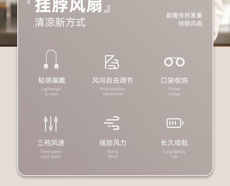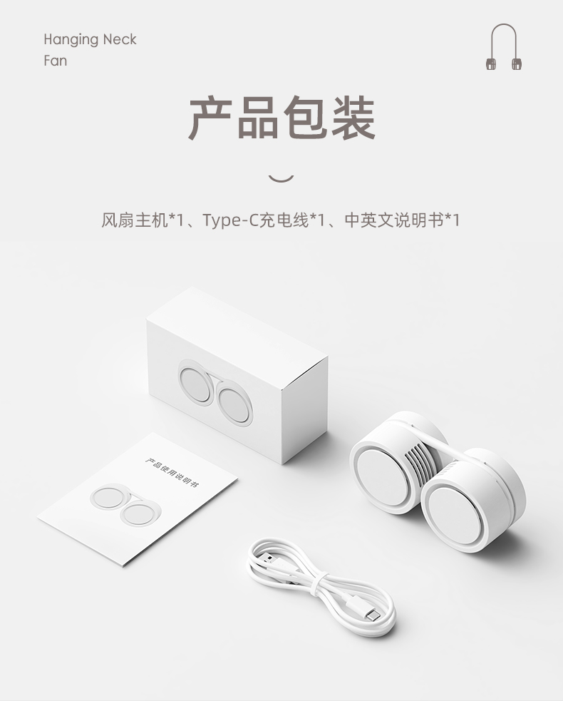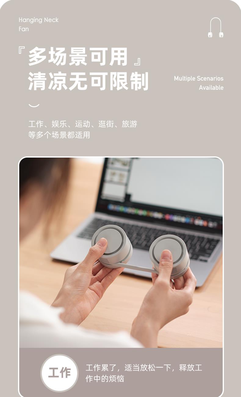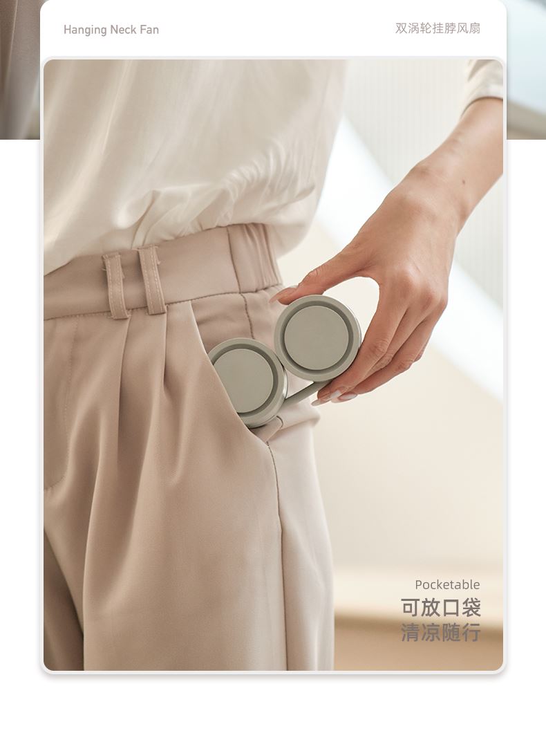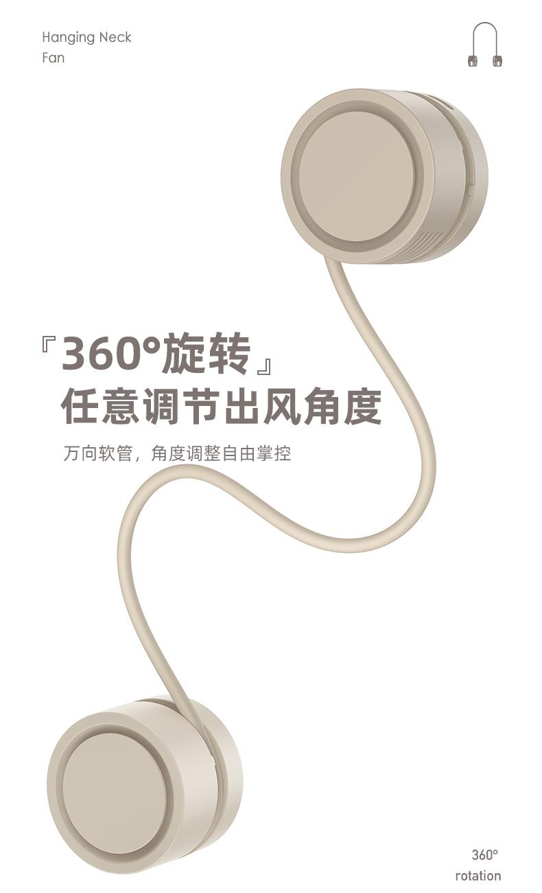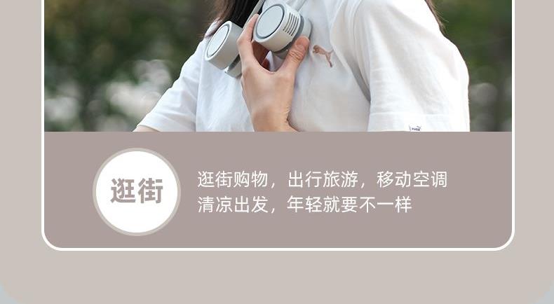 产品颜色:白色 杏色 冰绿色 产品尺寸:11.8*5.9*4.2cm 产品材质:ABS+硅胶+电子元件 输入电流:5V/1A 电池容量:1600mAh 功 率:≤4w 使用时间:1.5-6小时 产品重量:177g 特点 轻感佩戴 口袋收纳 三档风速 强劲风力 可放口袋 清凉随行 亲肤材质 舒适佩戴