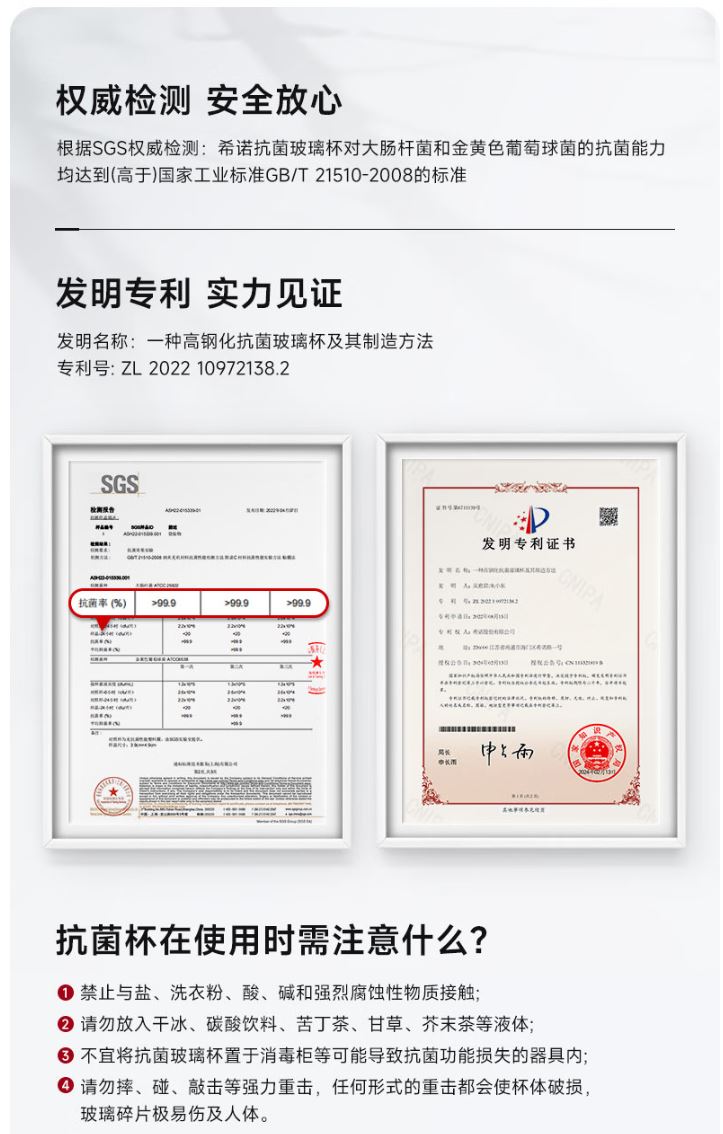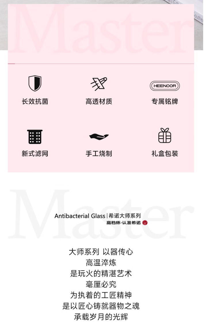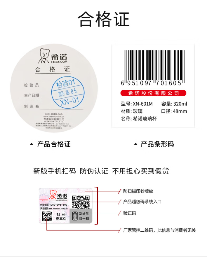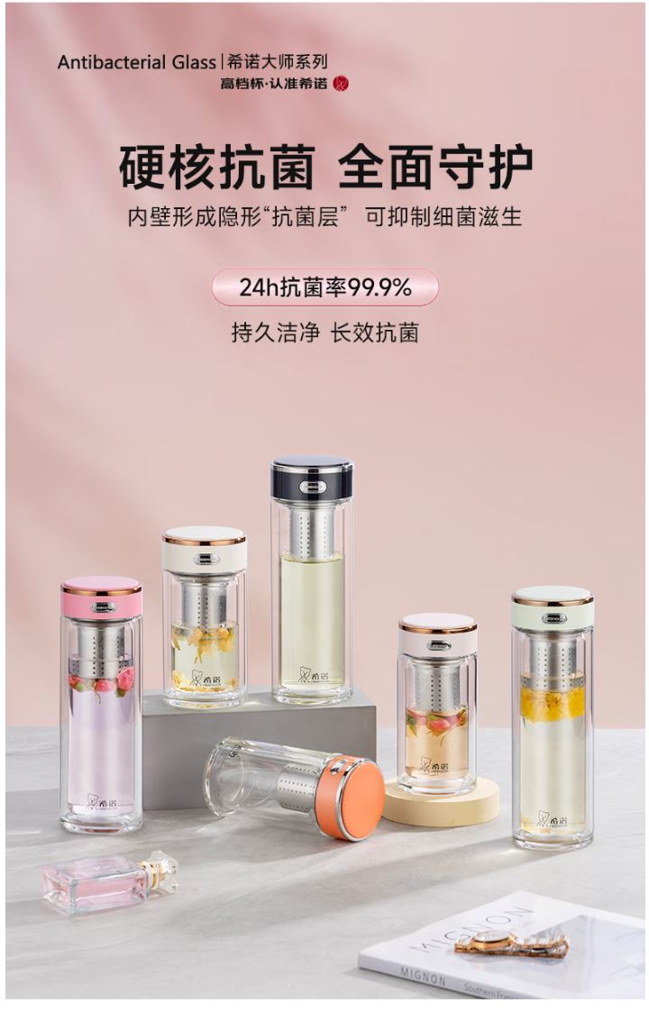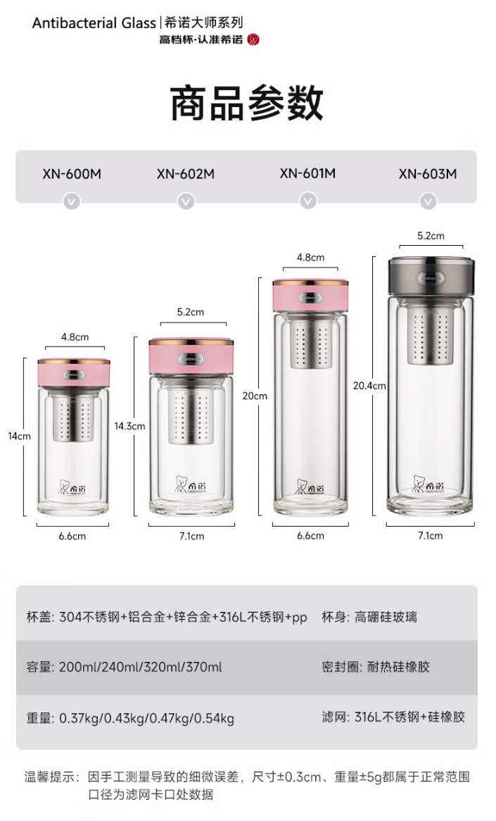 容量 XN-600M: 200ml 规格(mm) XN-600M:48(杯口直径) x66(直径) x140(高度) 杯体 铂金级高硼硅玻璃、银离子 滤网 SUS316L、食品级硅胶 密封圈 食品级硅胶 条形码 XN-600M: 6951097701599