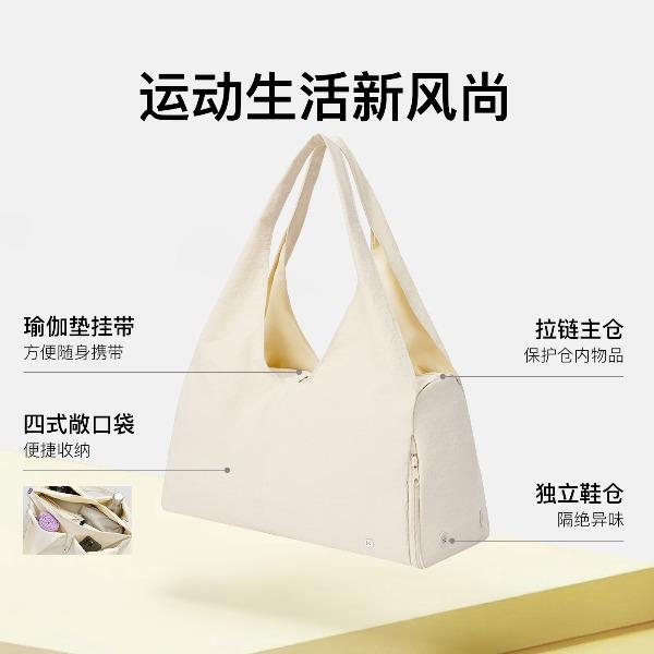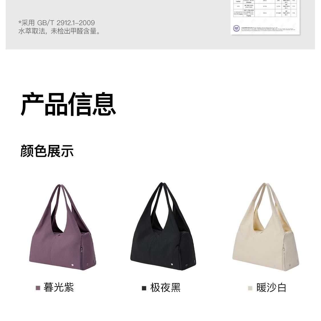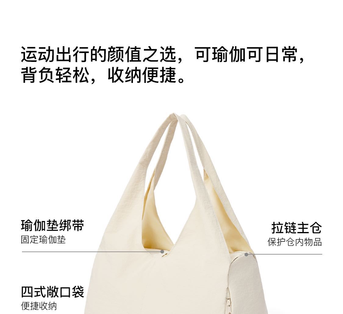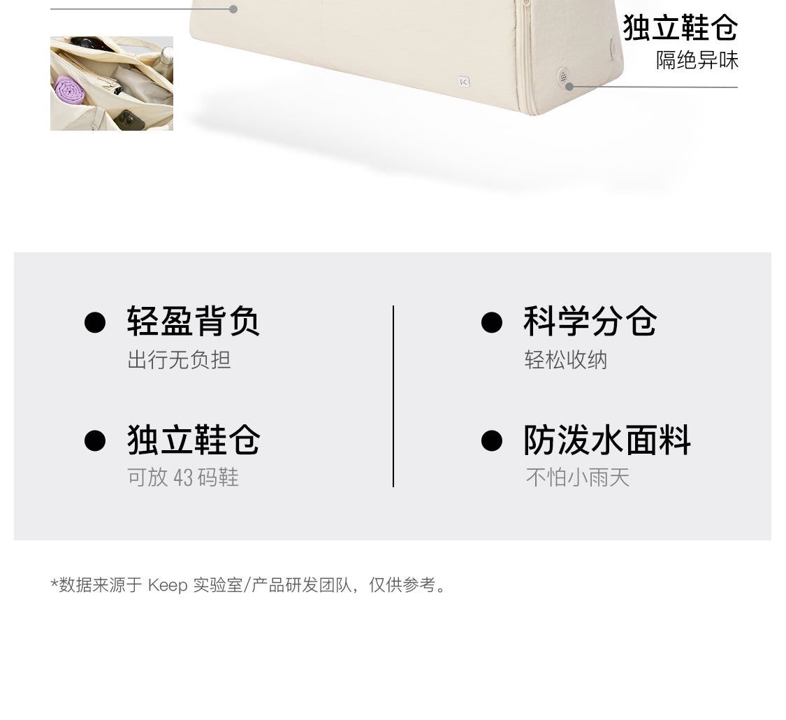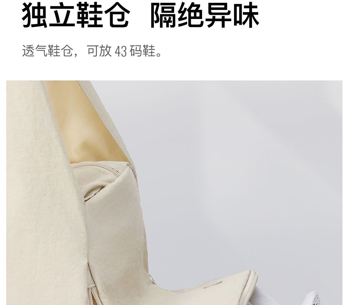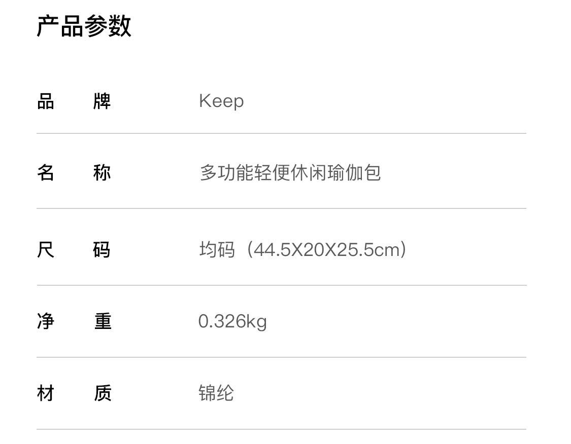 尺码:均码(44.5X20X25.5cm) 净重:0.326kg 材质:锦纶(防泼水面料) 容量:20L 顶部瑜珈垫绑带,独立鞋仓 四式敞口袋 无异味无甲醛检出