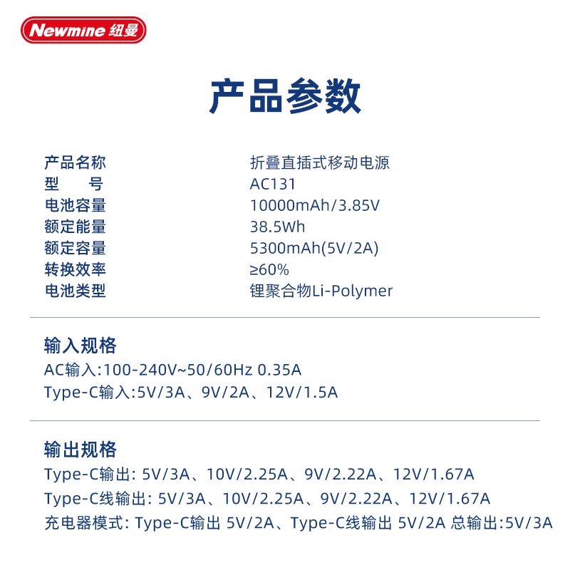 纽曼AC13110000毫安AC直插快充带线充电宝