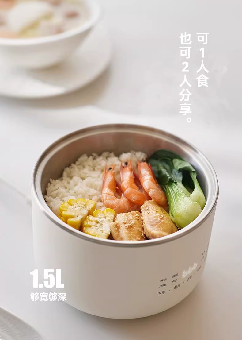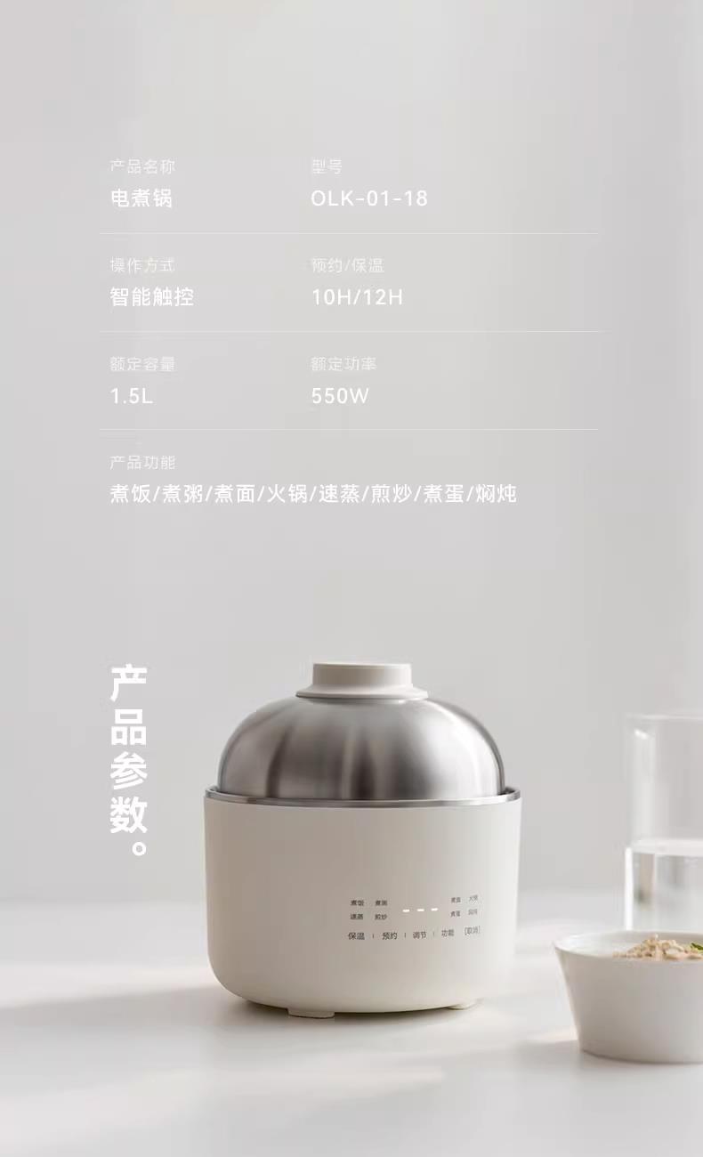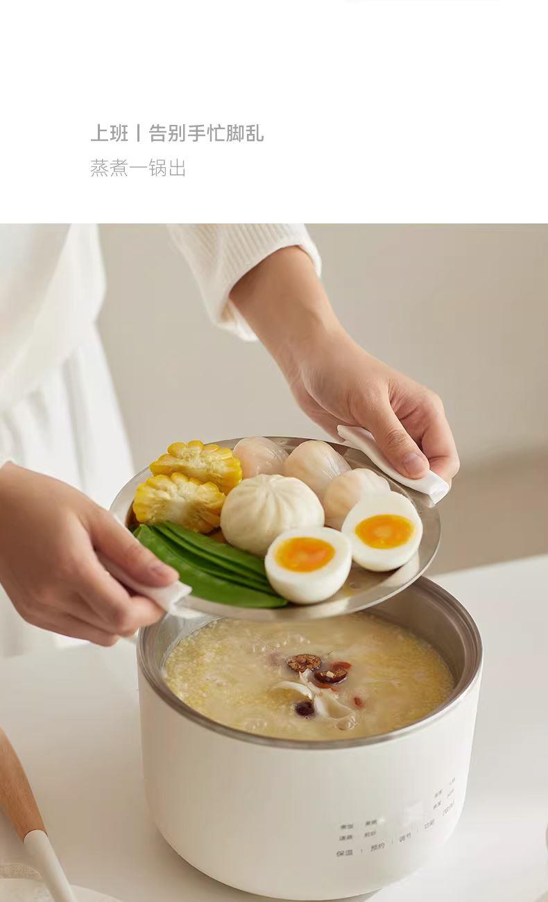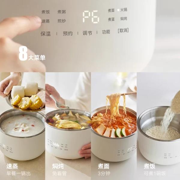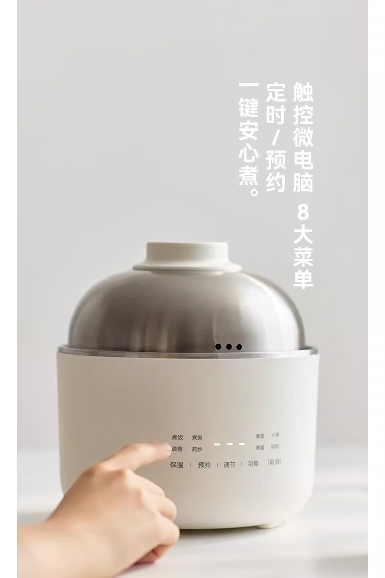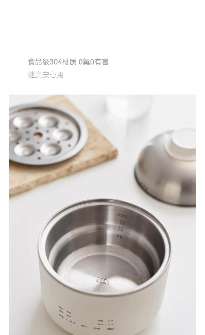 颜色:陶白色 容量:1.5L 毛量:2.3kg 额定功率:600W 产品尺寸:185*185*198mm 包装尺寸:241*241*175mm 条码 : 6977735713403 1. 食品级304不锈钢内胆/锅盖/蒸盘 2. 触控微电脑8大菜单定时/预约 一键安心煮 3. 食品接触都无涂层才是真健康