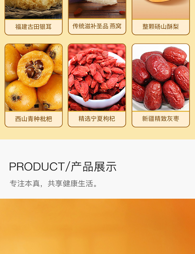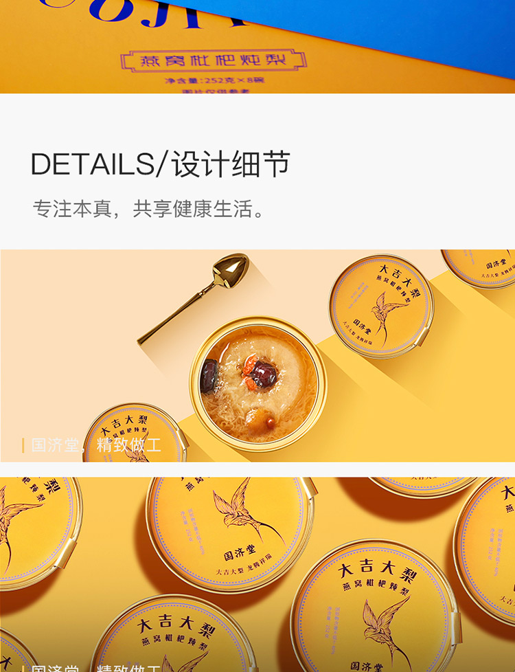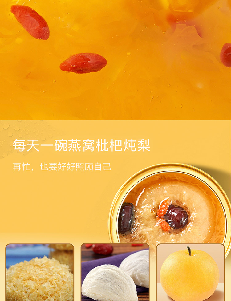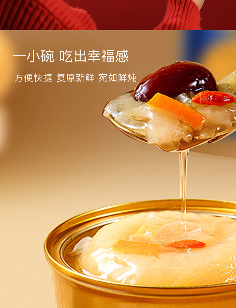 传统金黄色配色,对龙年的吉祥寓意; 炖梨甜水的新搭配, 加入燕窝、枇杷、银耳等滋补好物, 增强润燥; 口感清甜软糯,满满一碗补充能量。 一盒8碗, 配料纯净无添加,坚持纯粹品质。