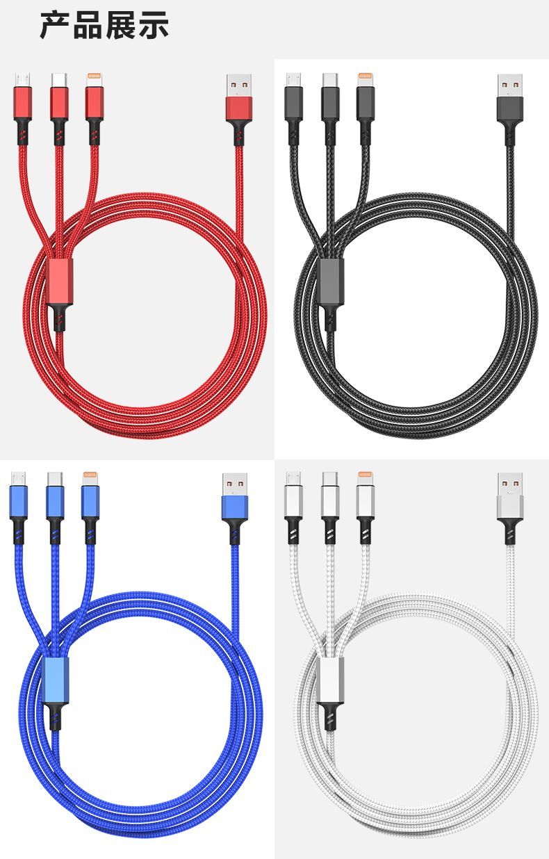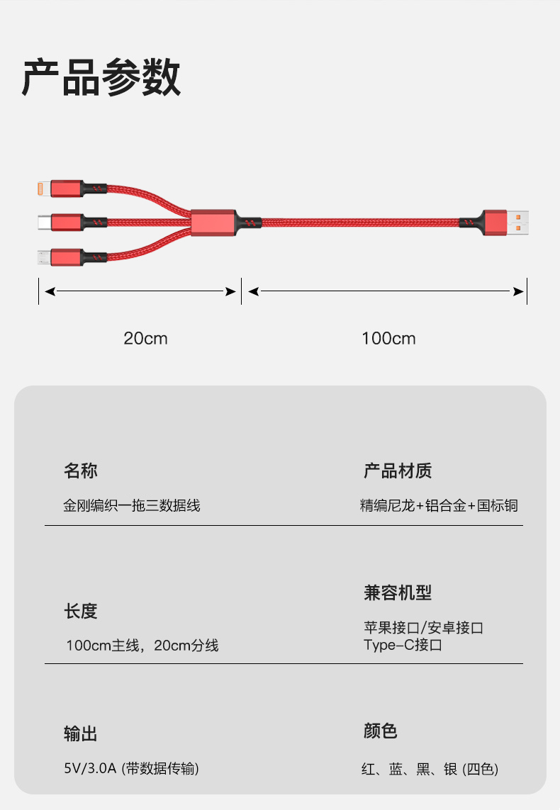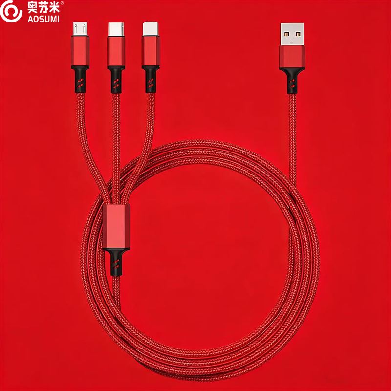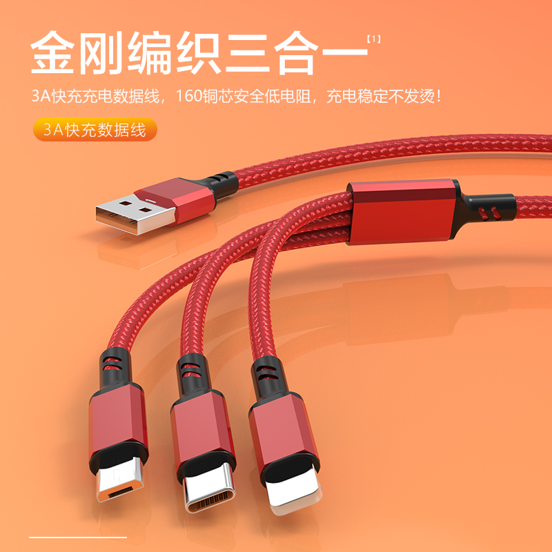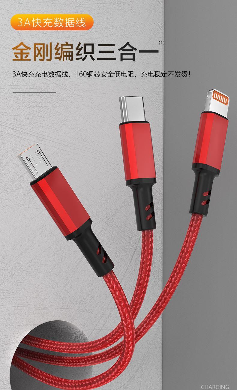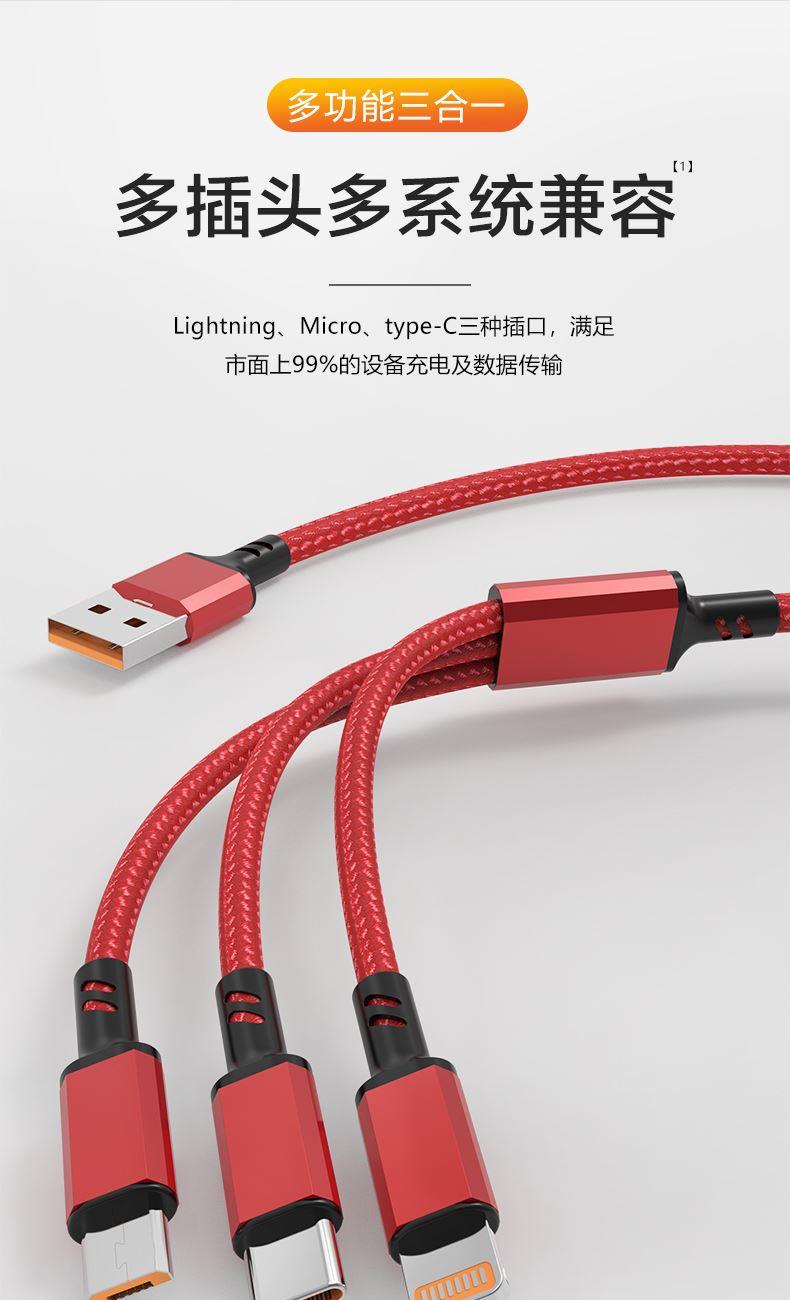 奥苏米金刚66W一拖三超级快充数据线 颜色:红色 蓝色 黑色 银色 材质:渔网硬体编织线 尺寸:1.2M 包装:彩盒包装 【功能特点】: 5A超级快充,充电更快 渔网硬体编织线,一体成型充电头 三种接口满足各种手机 1.2米长度设计,使用方便 编织线耐磨耐用,不易折断