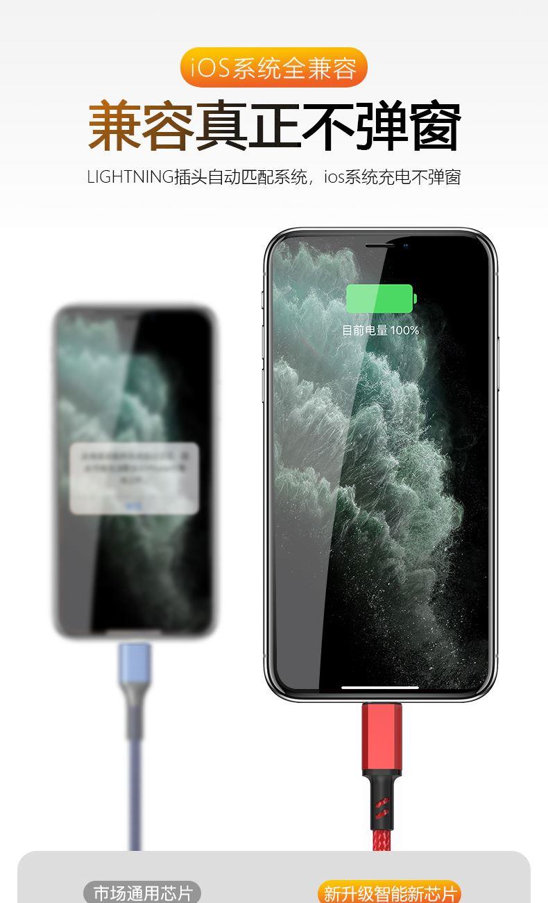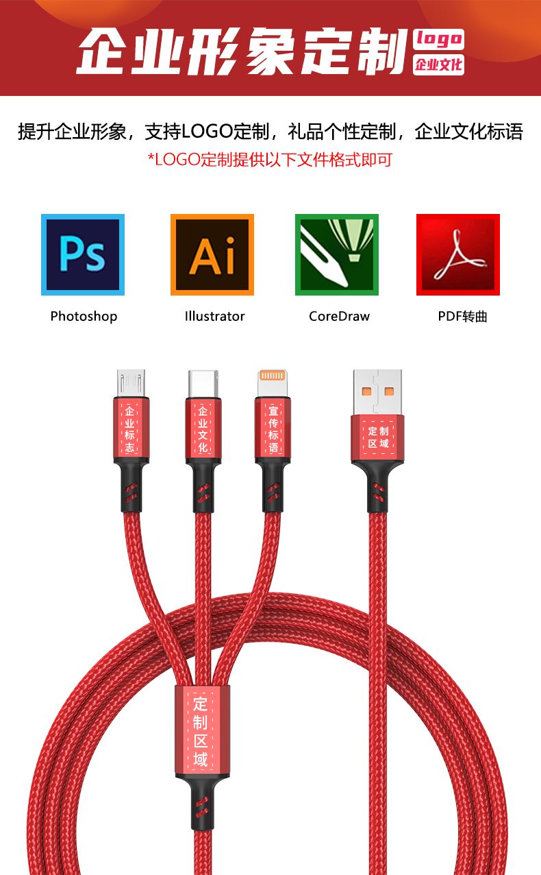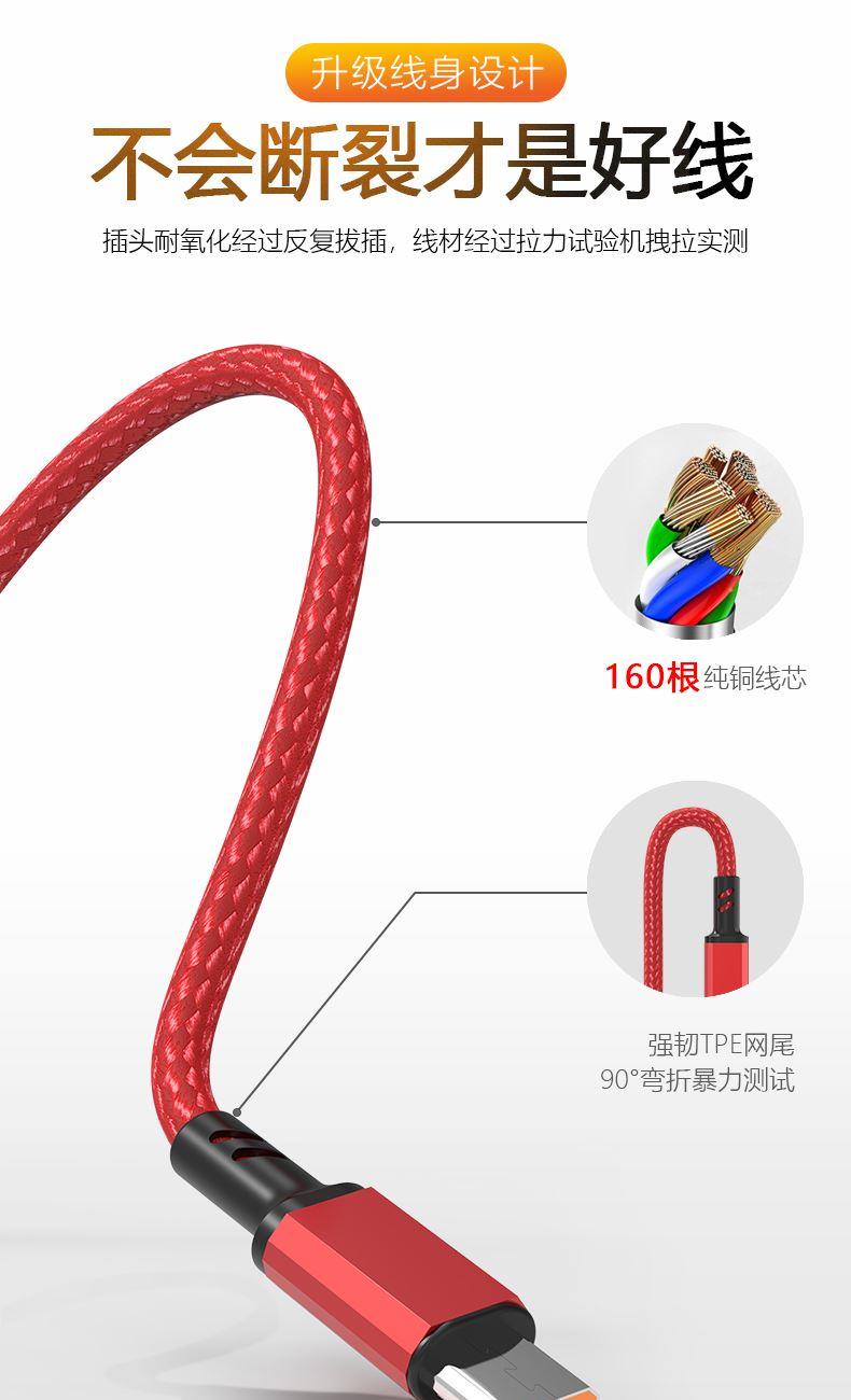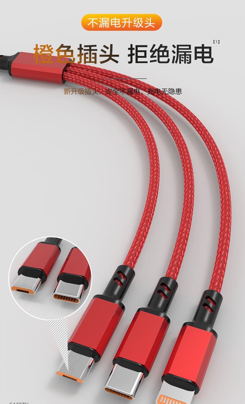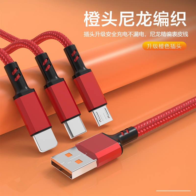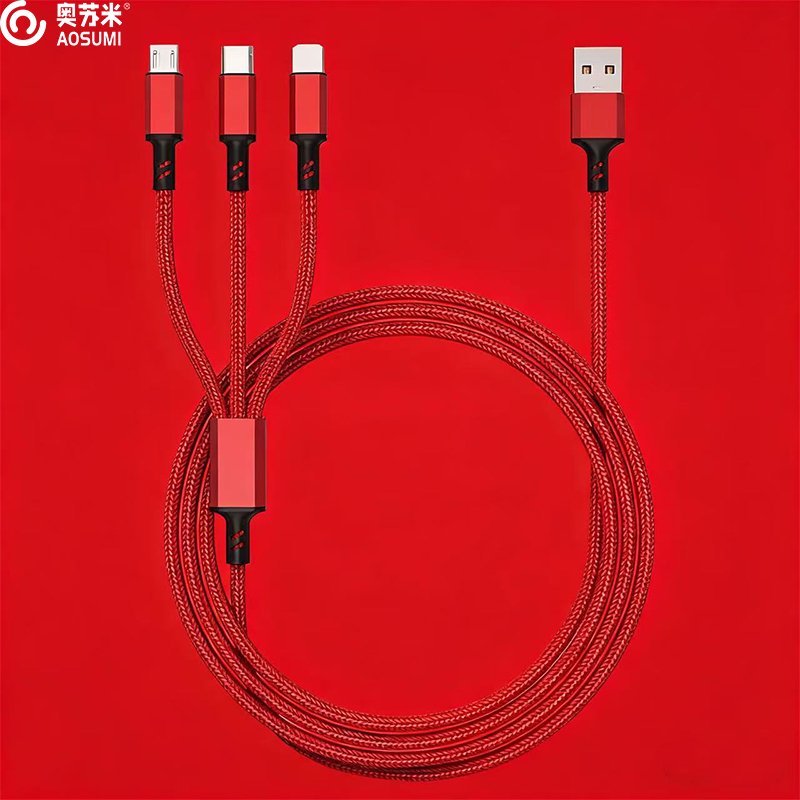 奥苏米金刚66W一拖三超级快充数据线 颜色:红色 蓝色 黑色 银色 材质:渔网硬体编织线 尺寸:1.2M 包装:彩盒包装 【功能特点】: 5A超级快充,充电更快 渔网硬体编织线,一体成型充电头 三种接口满足各种手机 1.2米长度设计,使用方便 编织线耐磨耐用,不易折断