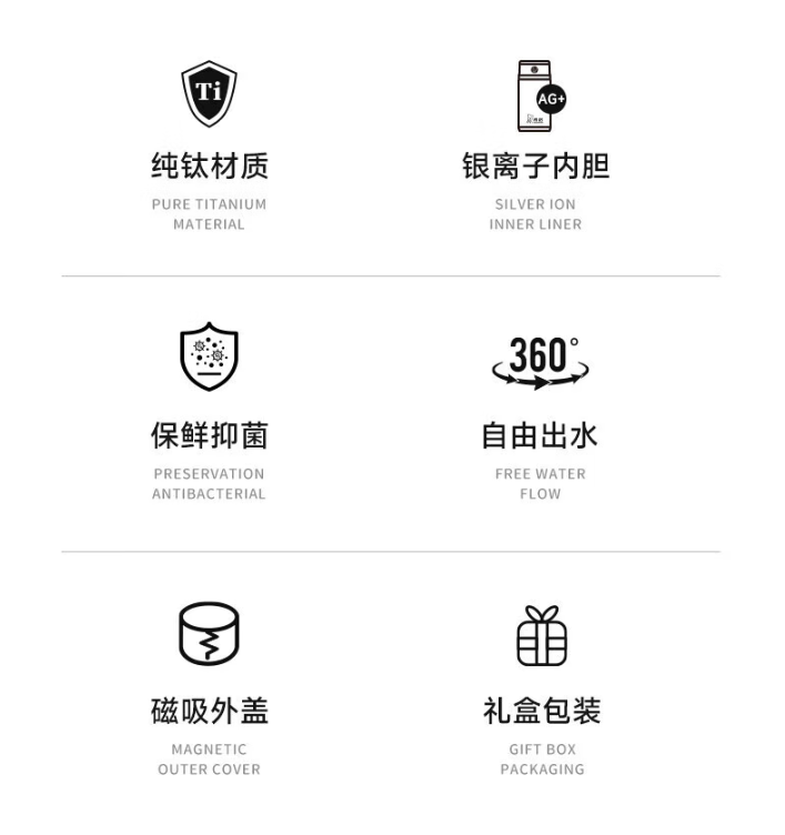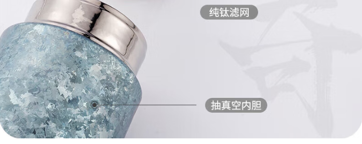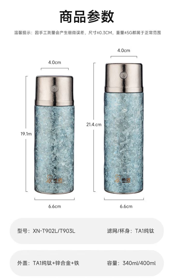 产品规格: 材质: 杯体-纯 钛/杯盖-食品级PP、纯钛TA1、食品级硅胶 规格(mm) XN-T903L:40(杯口直径)x66(直径)x214.1(高度) 颜色: 云海雾凇,银月白,远天蓝,玫洛粉,薰衣草紫 容量: XN-T903L:400ml 保温效能: XN-T903L:6小时≥50℃