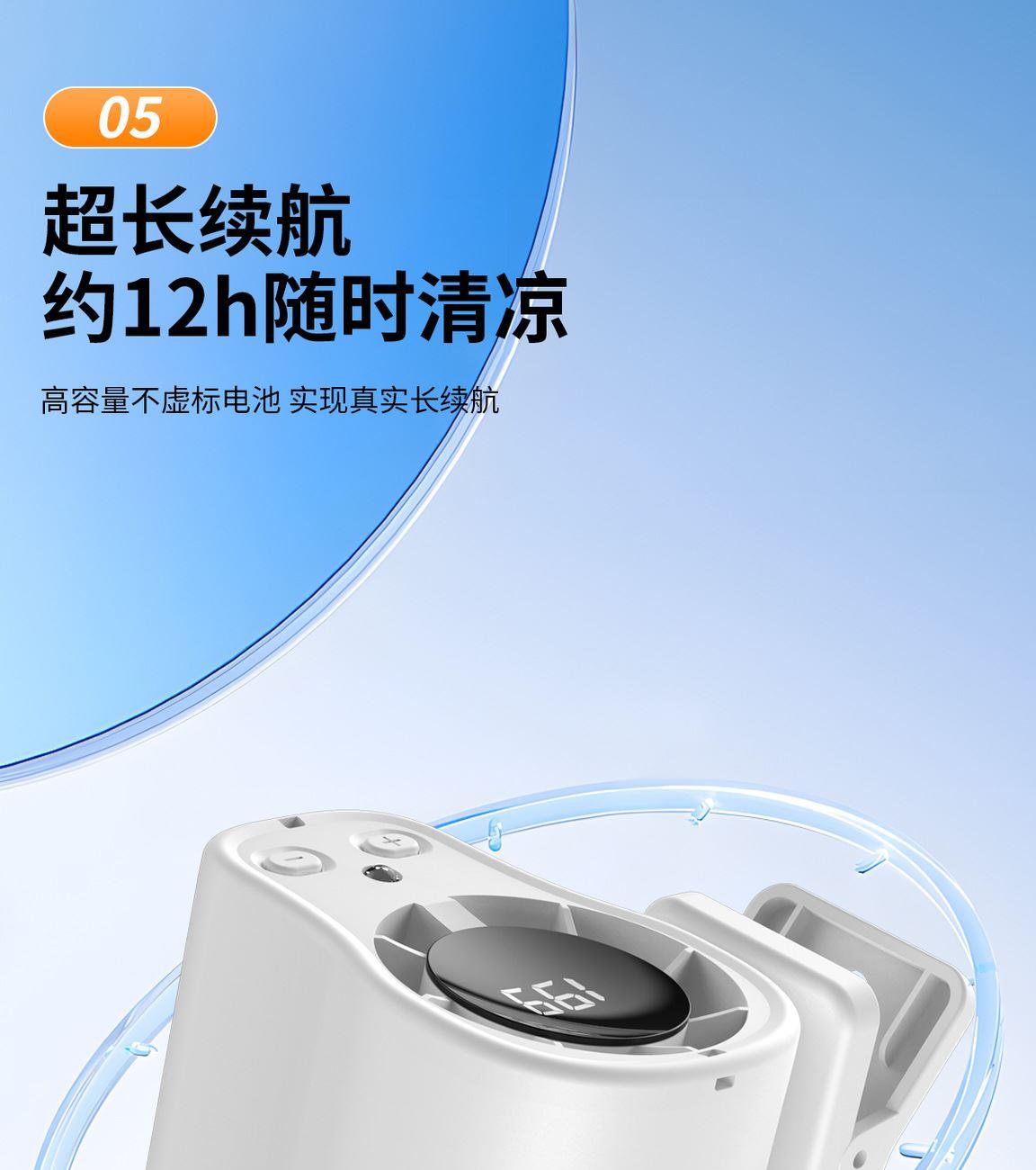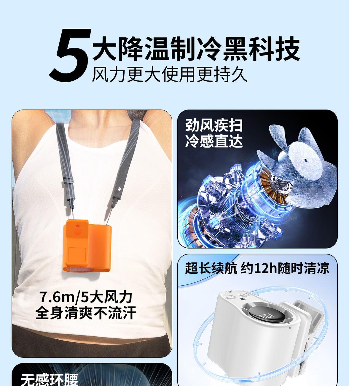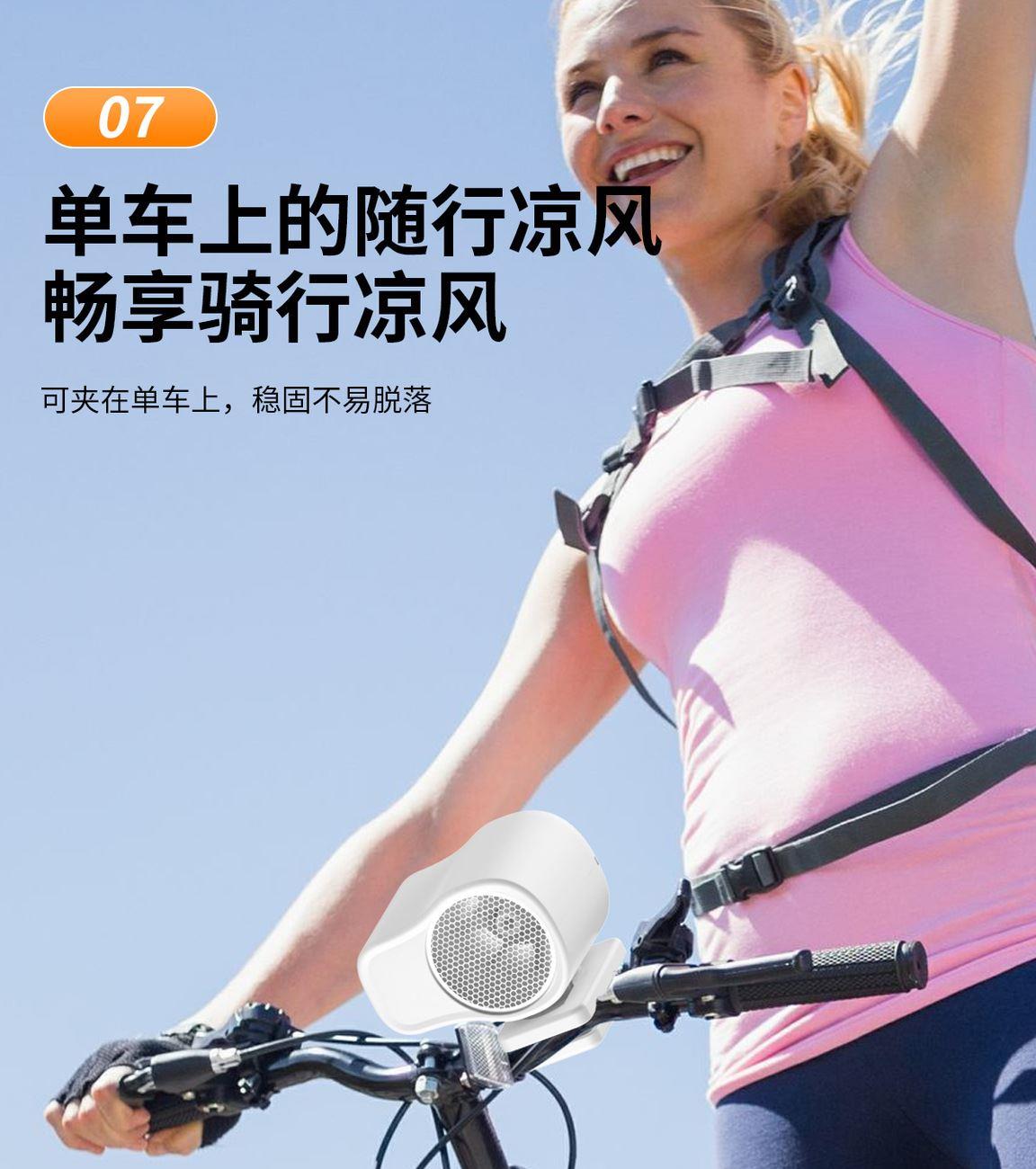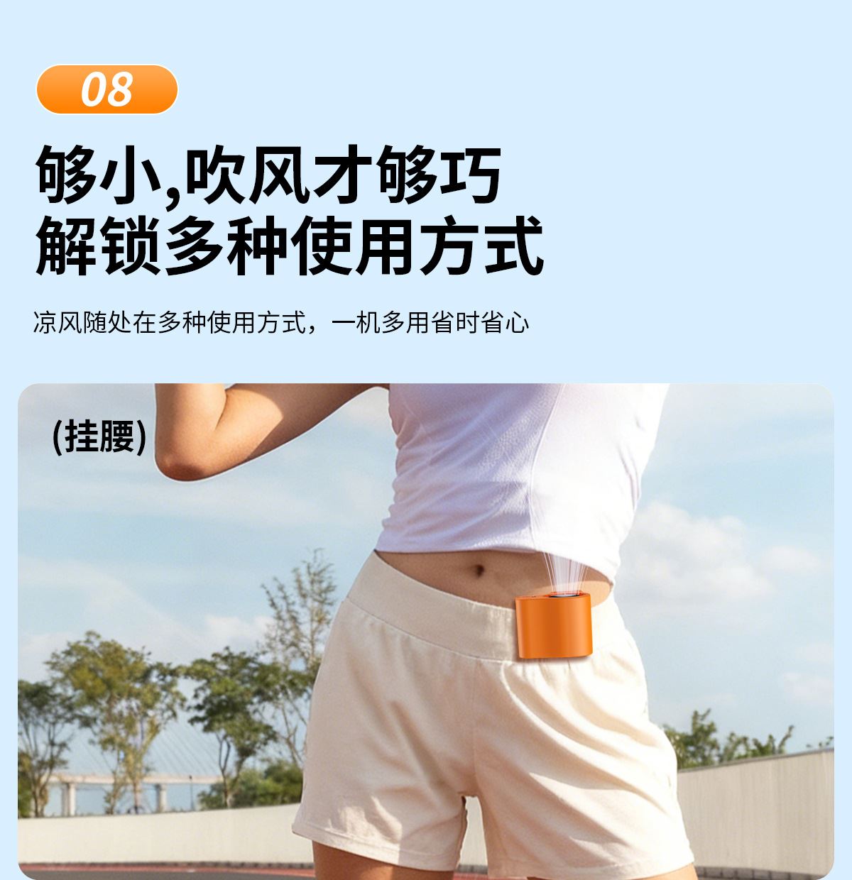 多功能夹子挂腰风扇T-511 颜色:白色 黑色 橙色 整箱数量:100PCS 外箱:41.5*38.5*38CM 单个重量:173.1g 彩盒尺寸:89*79*72mm 整箱重量:175kg 尺寸:84*74*63mm 材质:ABS材质 容量:1500mAh 包装:彩盒包装 【推荐理由】: 户外精致小巧,方便携带高速风扇 199档数显可调节高速风扇 多功能户外使用方式,解锁多种方式 1500毫安大容量电池待机更长