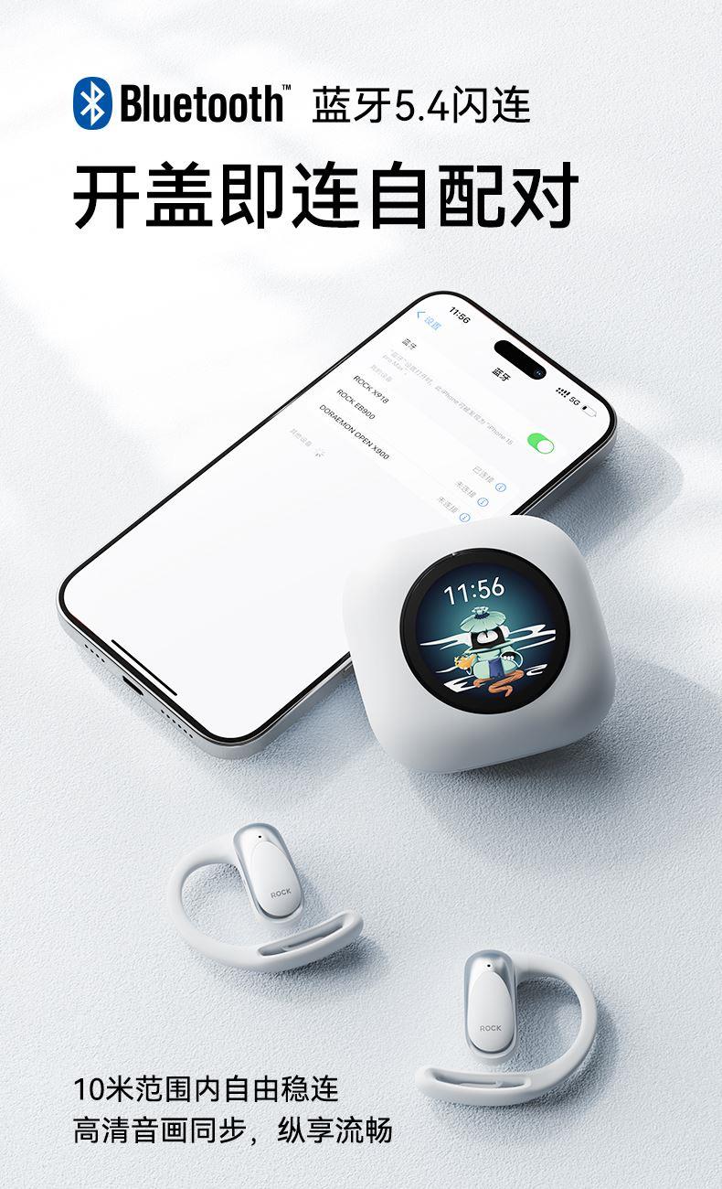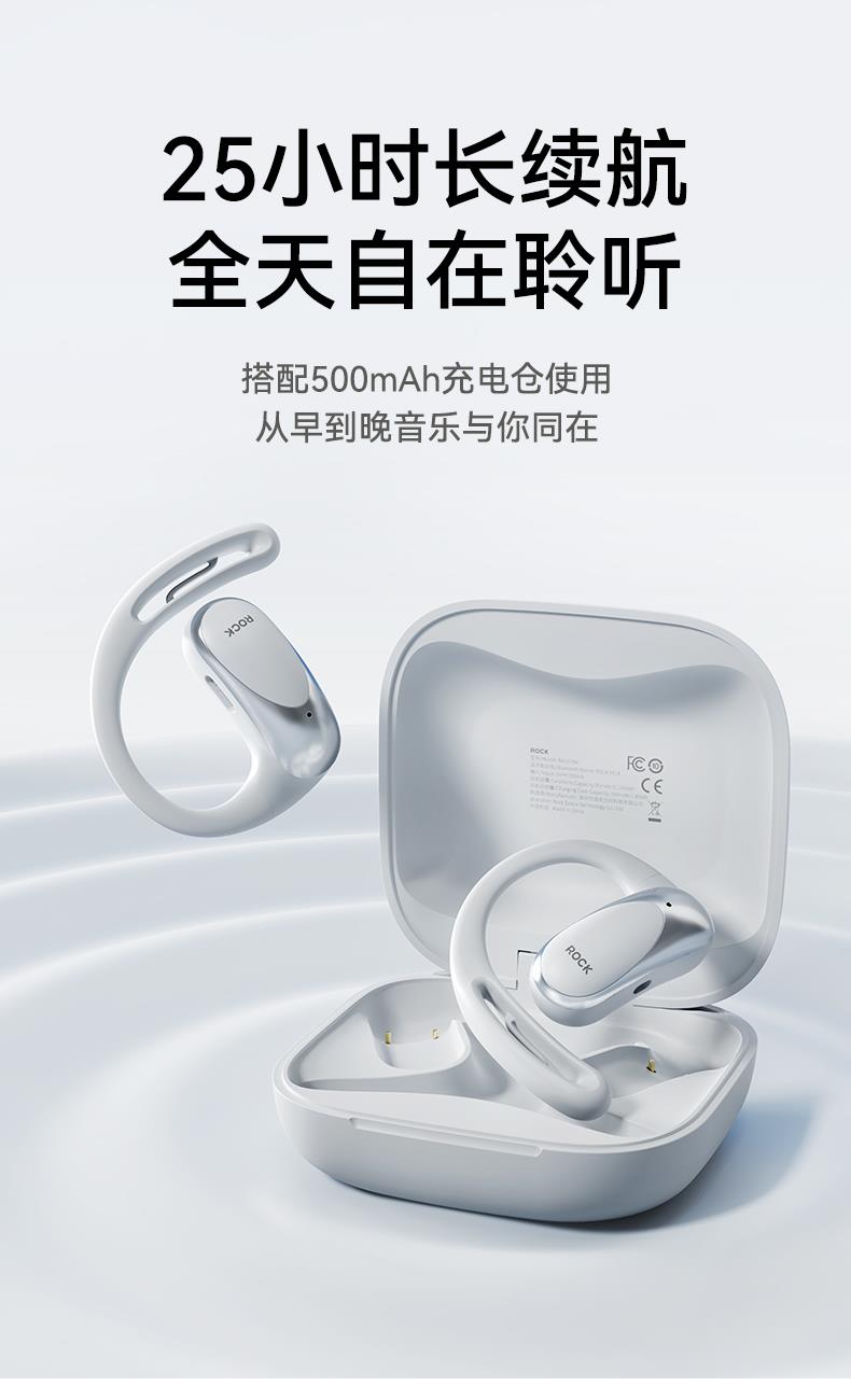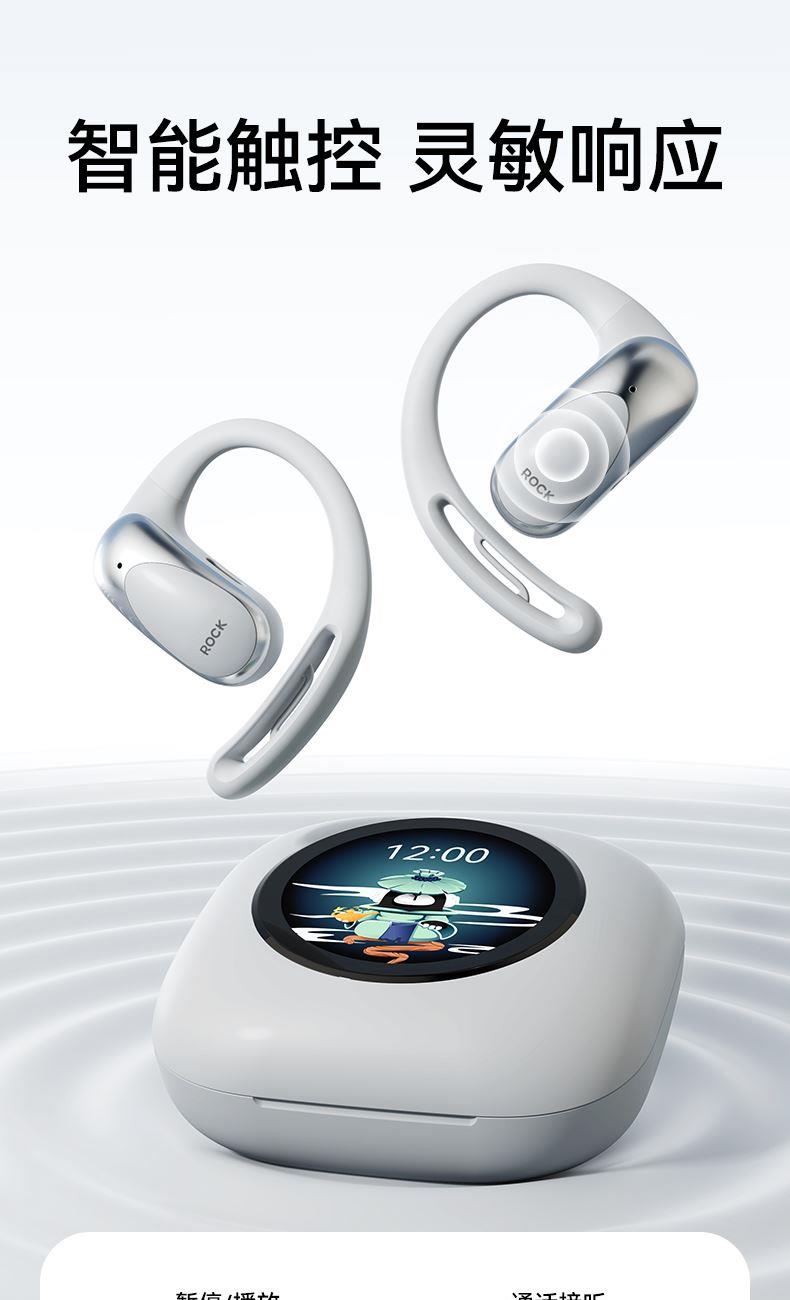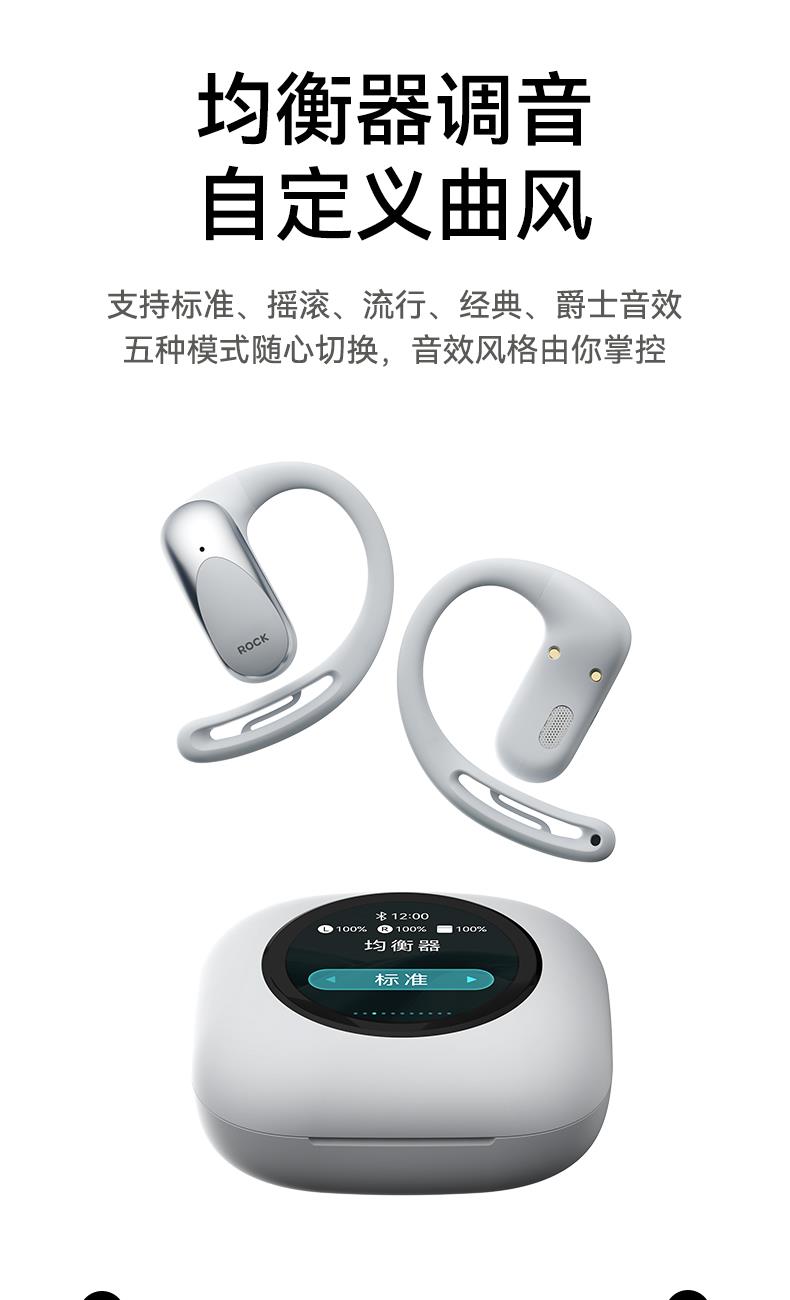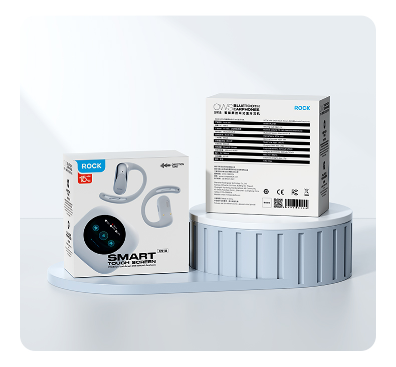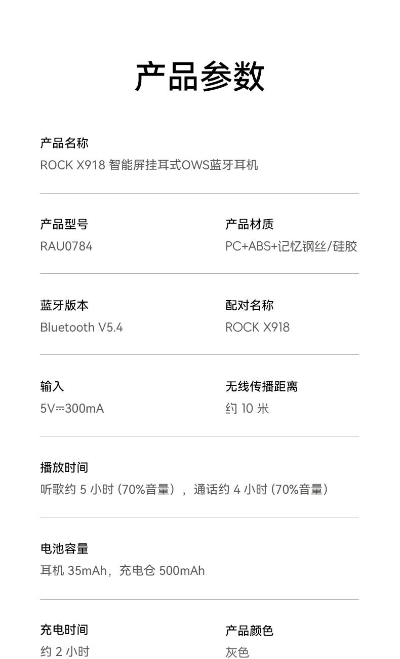 1.产品型号:RAU0784 2.蓝牙版本:Bluetooth V5.4 3.输入:5V-300mA 4.产品材质:PC+ABS+记忆钢丝/硅胶 5.配对名:ROCK X918 6.无线传播距离:约 10 米 7.播放时间:听歌约 5 小时(70%音量),通话约4小时(70%音量) 8.电池容量:耳机 35mAh,充电仓500mAh 9.充电时间:约 2 小时 LCD高清触控彩屏,一屏掌控10大功能 双模式畅玩,细腻音质,定向传音技术,有效隔除噪音 智能降噪+澎湃低音,通话更清晰 OWS低音增强技术 亲肤硅胶耳挂,开放式舒适佩戴不入耳不漏音,久戴不胀 搭配充电仓25小时超长续航,畅听无忧;