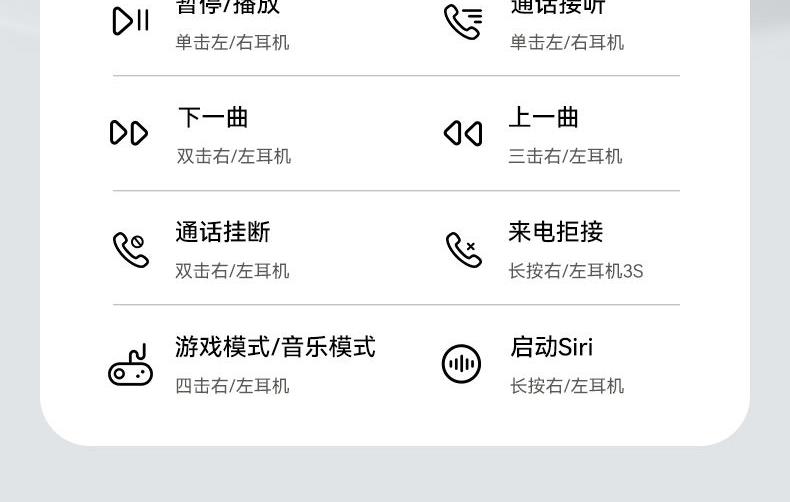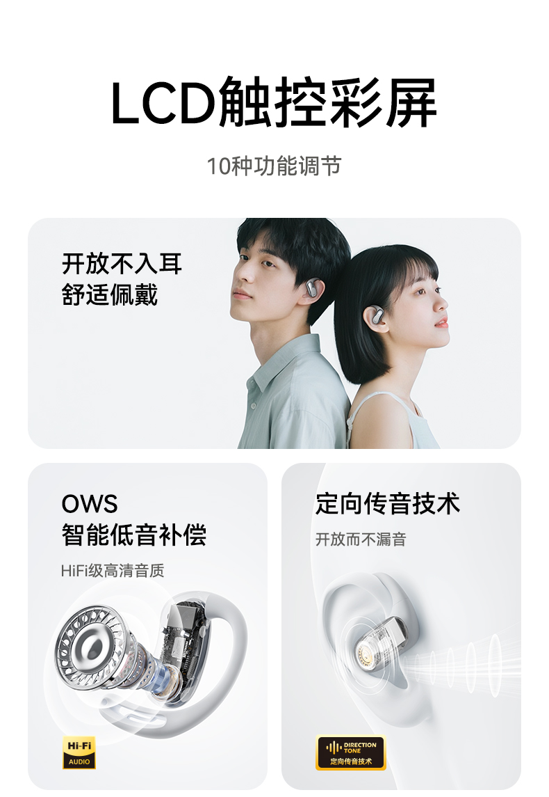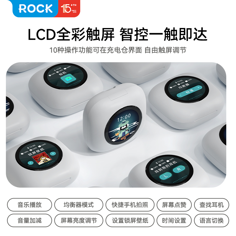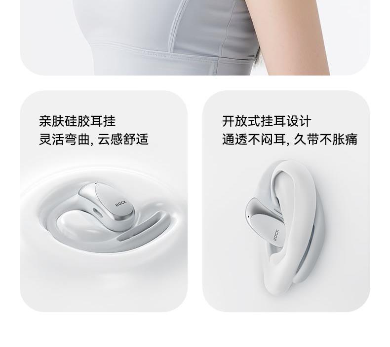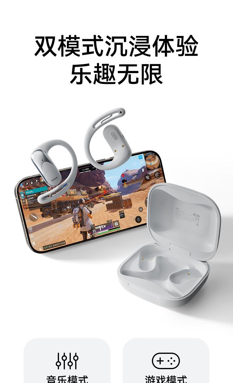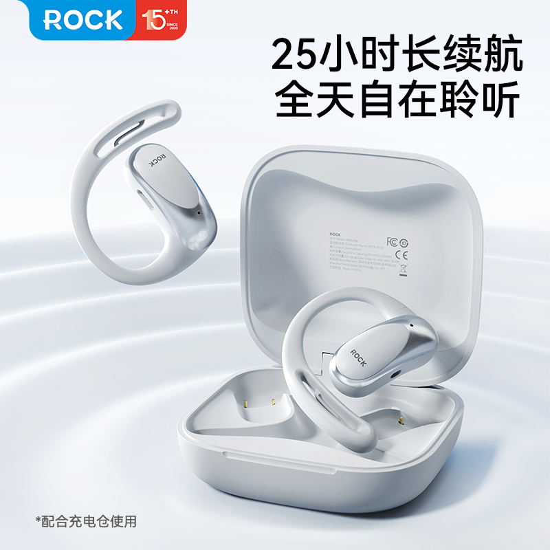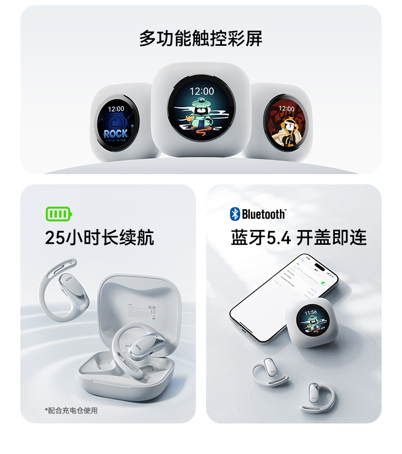 1.产品型号:RAU0784 2.蓝牙版本:Bluetooth V5.4 3.输入:5V-300mA 4.产品材质:PC+ABS+记忆钢丝/硅胶 5.配对名:ROCK X918 6.无线传播距离:约 10 米 7.播放时间:听歌约 5 小时(70%音量),通话约4小时(70%音量) 8.电池容量:耳机 35mAh,充电仓500mAh 9.充电时间:约 2 小时 LCD高清触控彩屏,一屏掌控10大功能 双模式畅玩,细腻音质,定向传音技术,有效隔除噪音 智能降噪+澎湃低音,通话更清晰 OWS低音增强技术 亲肤硅胶耳挂,开放式舒适佩戴不入耳不漏音,久戴不胀 搭配充电仓25小时超长续航,畅听无忧;