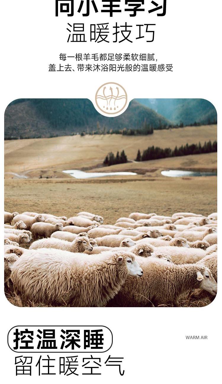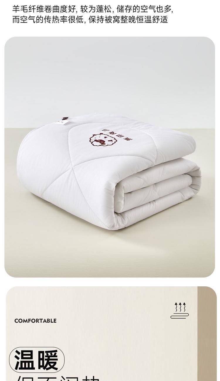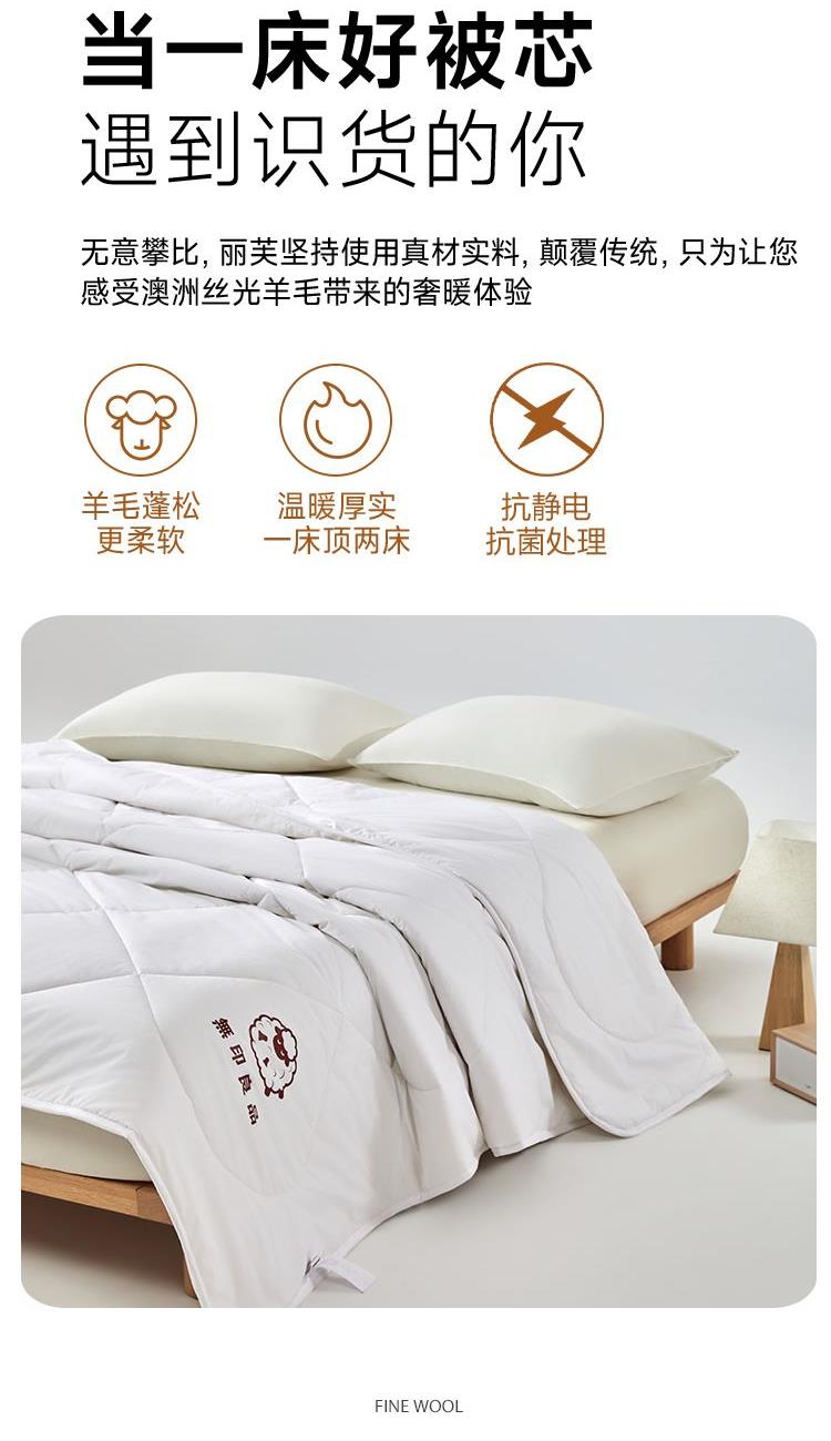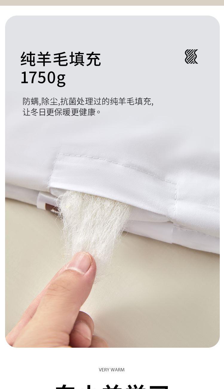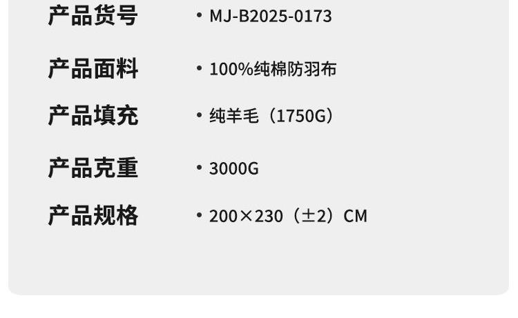 规 格:200×230(±2)cm 克 重:3000g 面 料:纯棉防羽布 填 充:纯羊毛(1750g) 高密度/防钻毛/抗静电的纯棉高密防羽布,对绒类产品的极度亲护。 防螨,除尘,处理过的纯羊毛填充,让冬日更保暖更健康。 高品质、高材质、高标准,一款对生活高度负责的产品