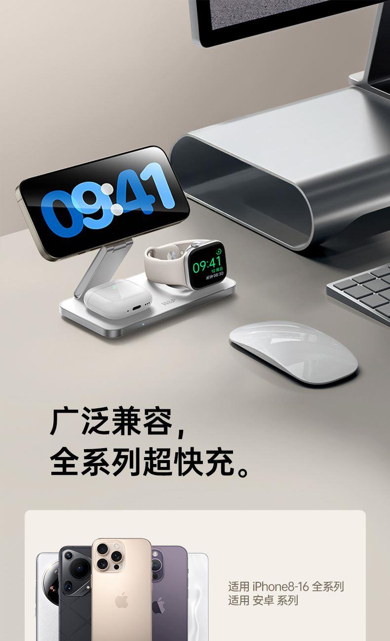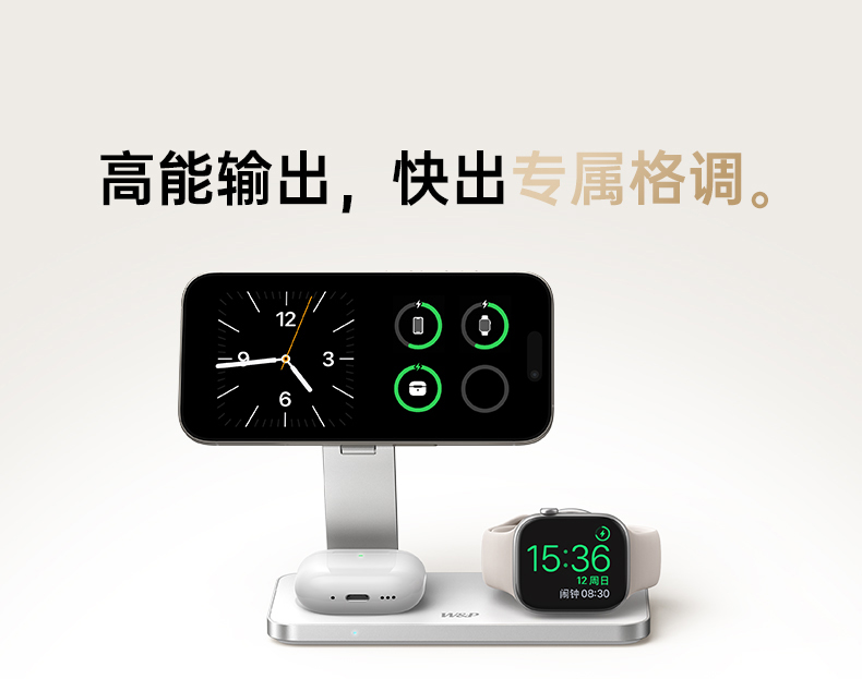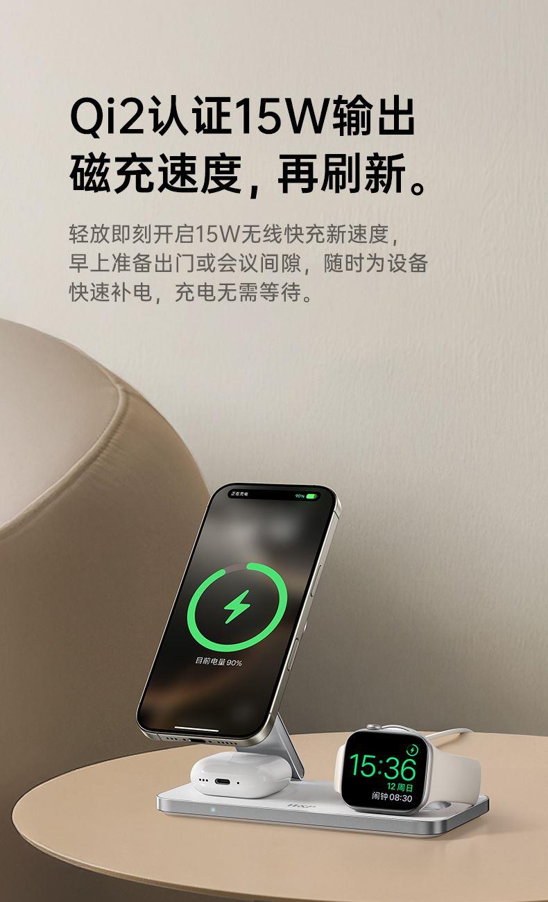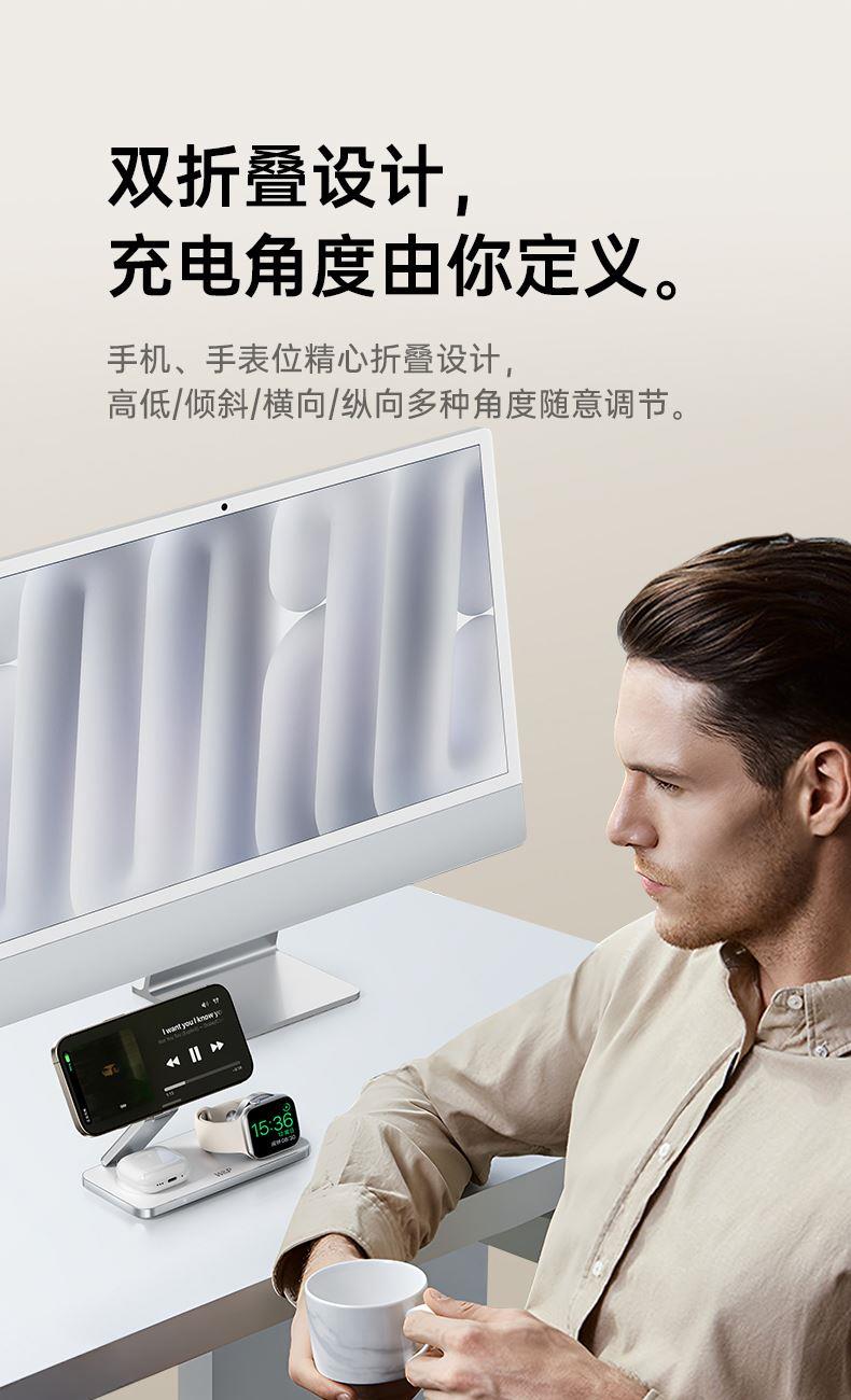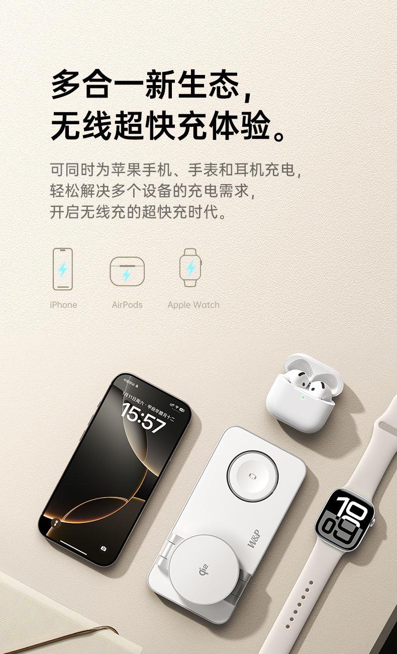 15W无线充电 同时为手机/苹果手表/耳机三部设备充电 小巧便携折叠设计 可升降支架,提高手机充电角度