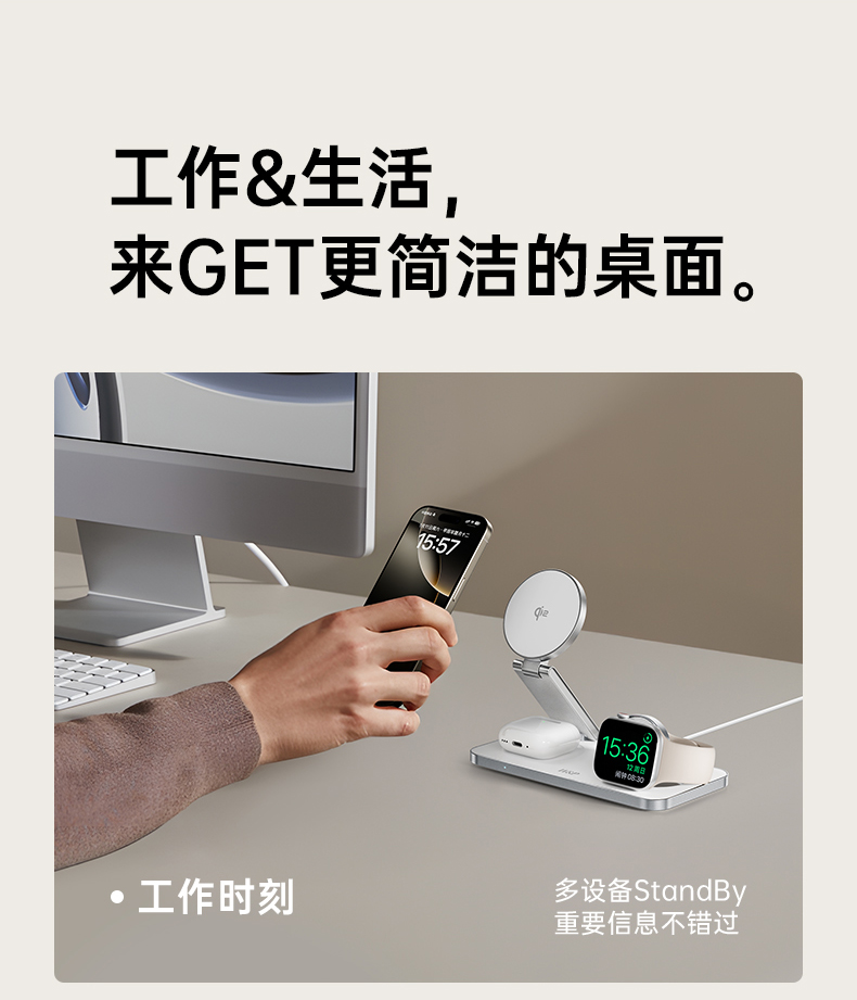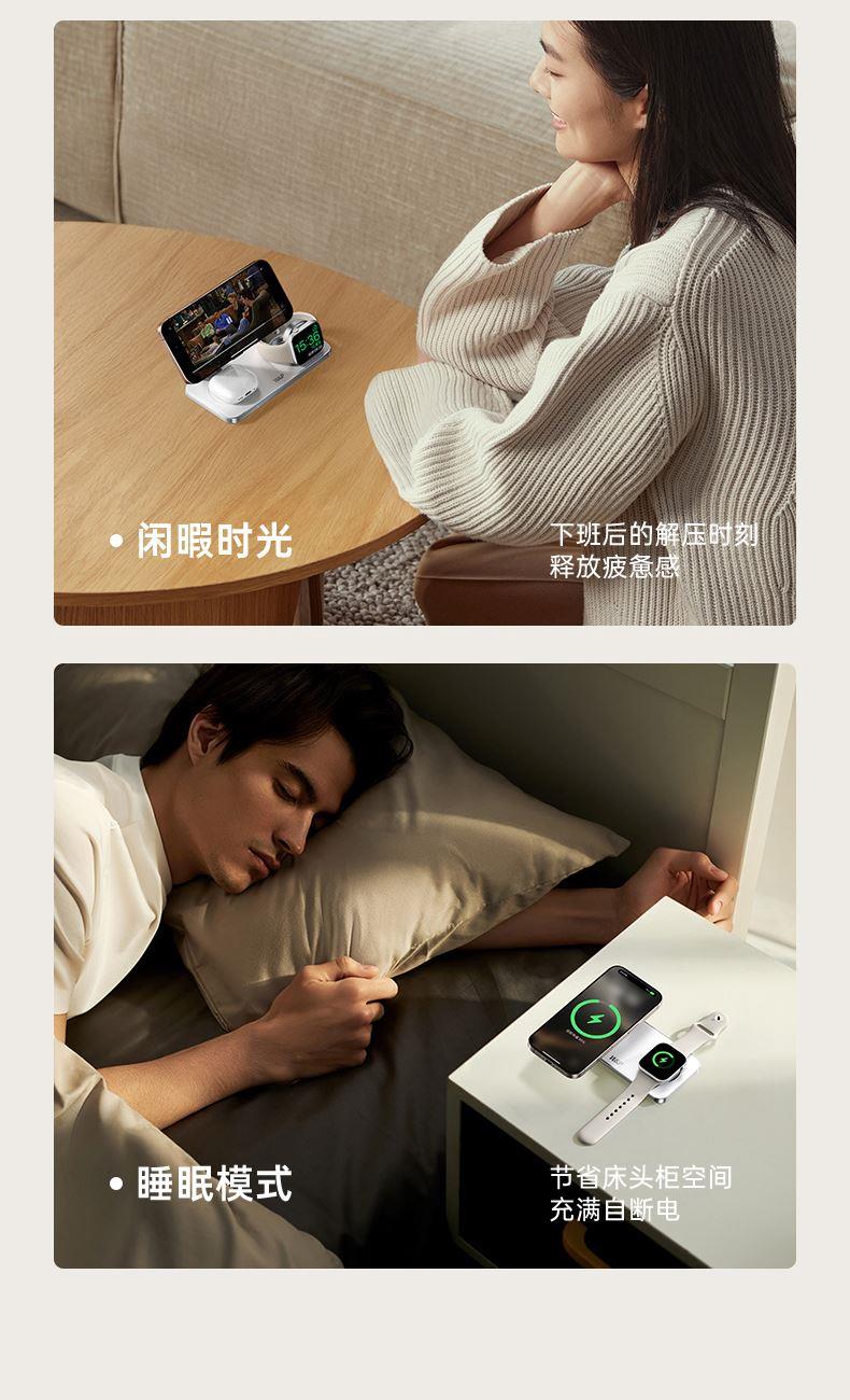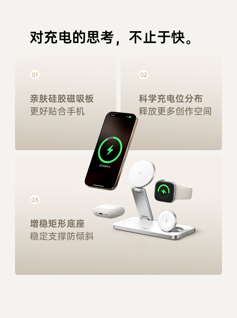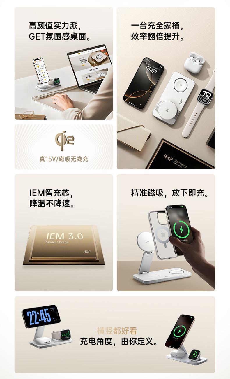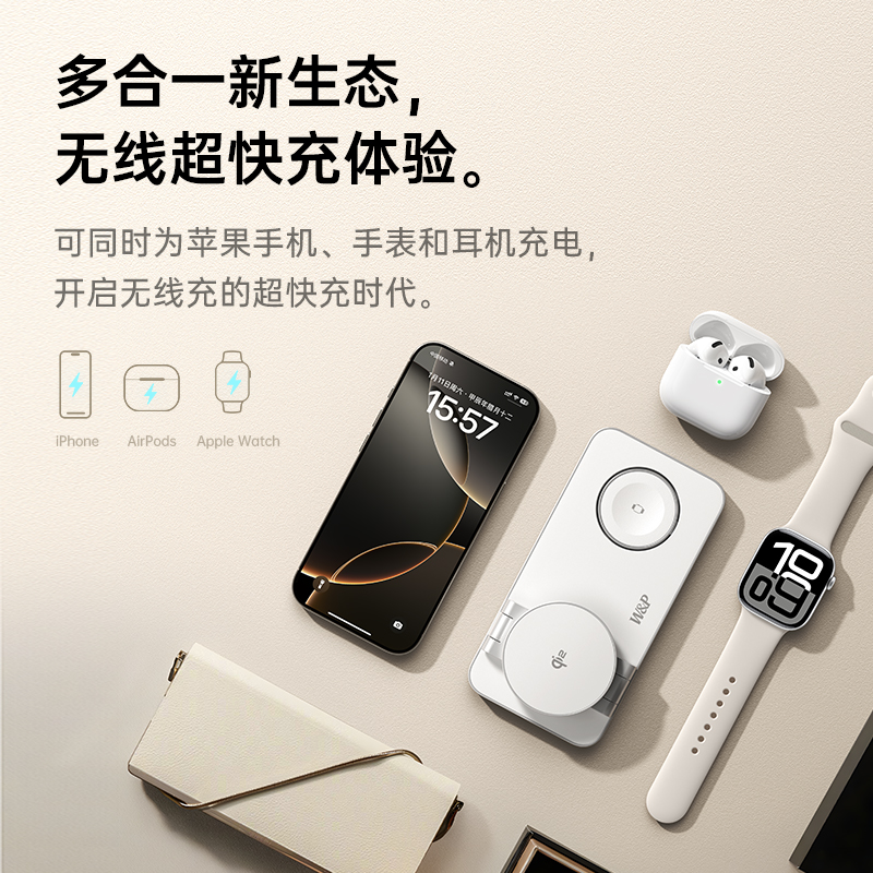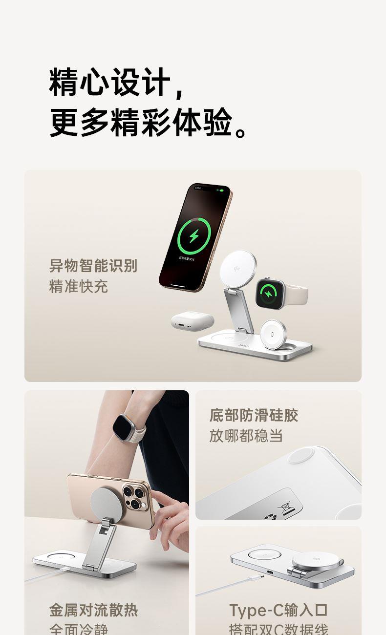 15W无线充电 同时为手机/苹果手表/耳机三部设备充电 小巧便携折叠设计 可升降支架,提高手机充电角度