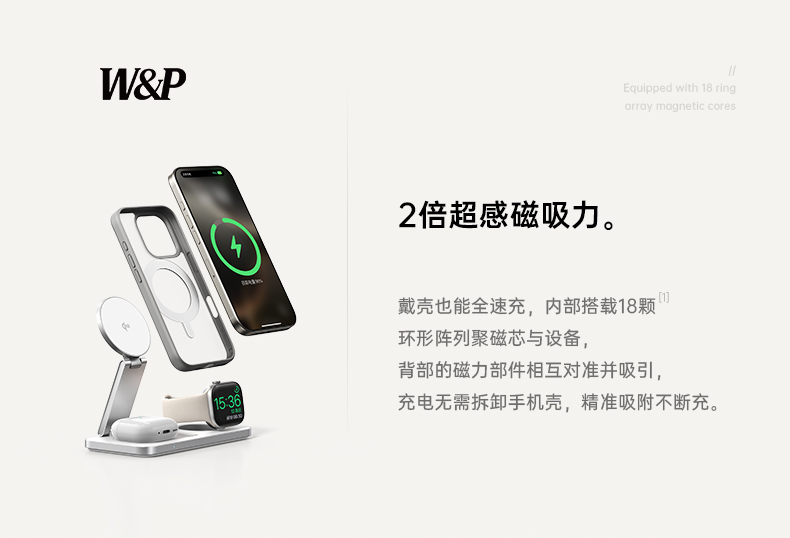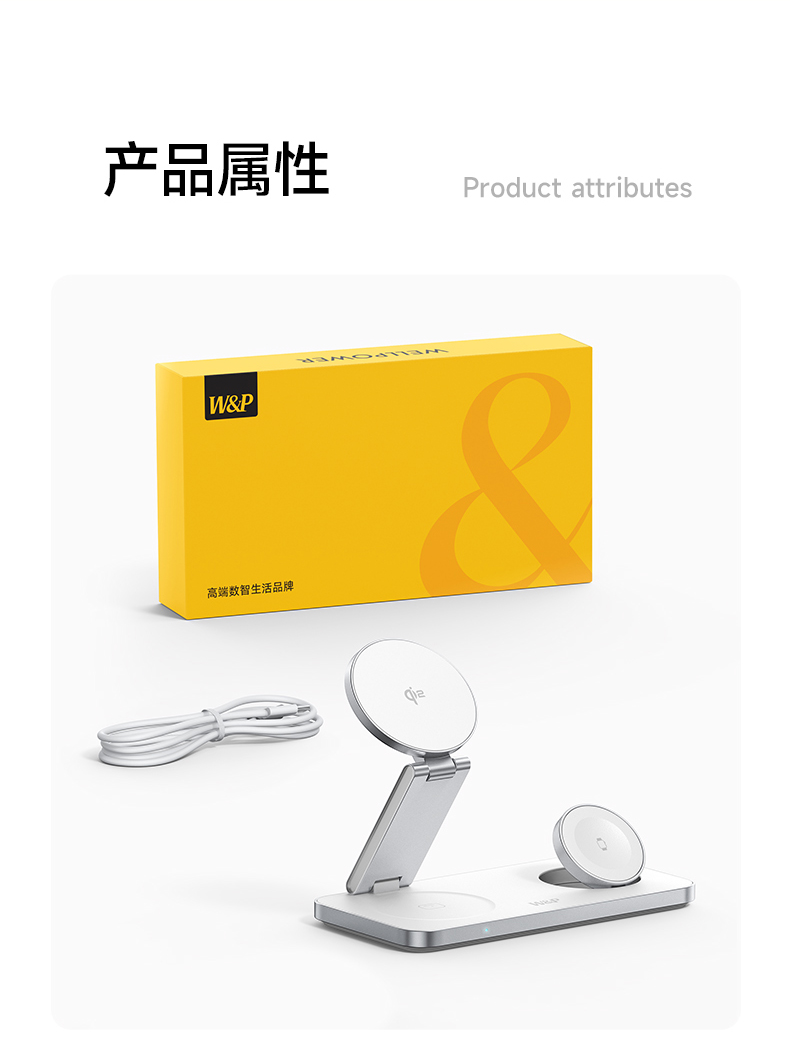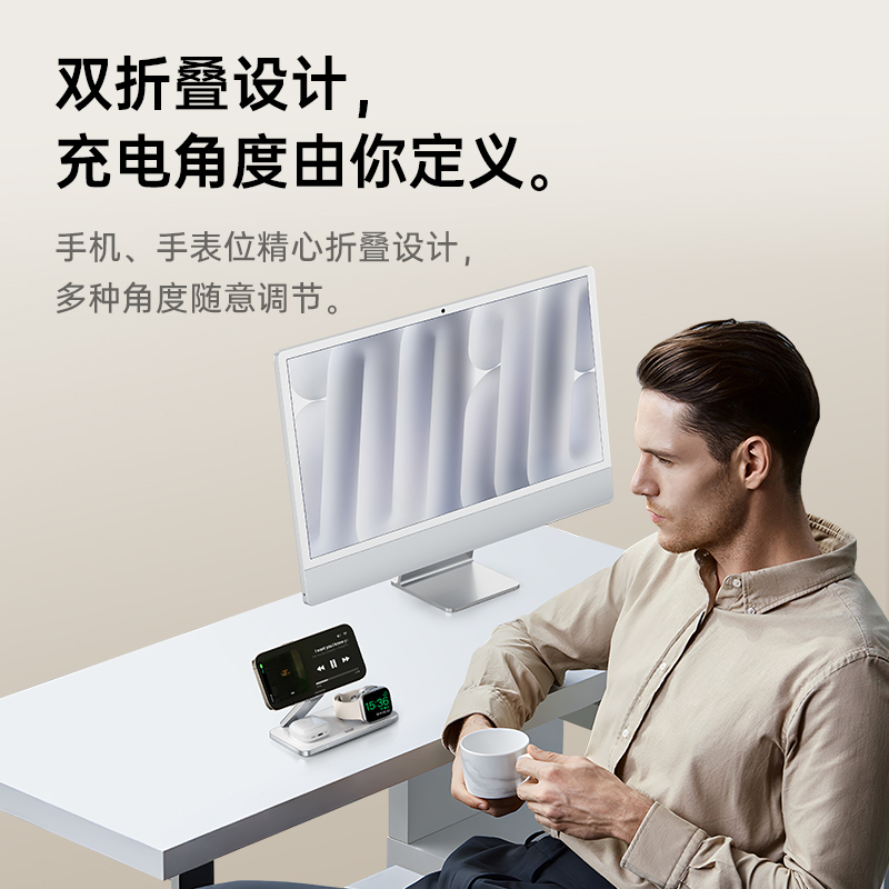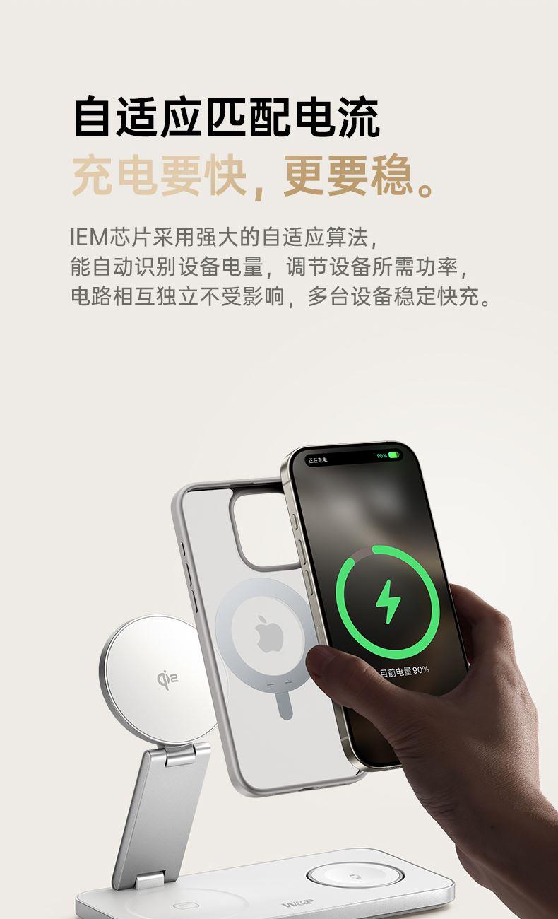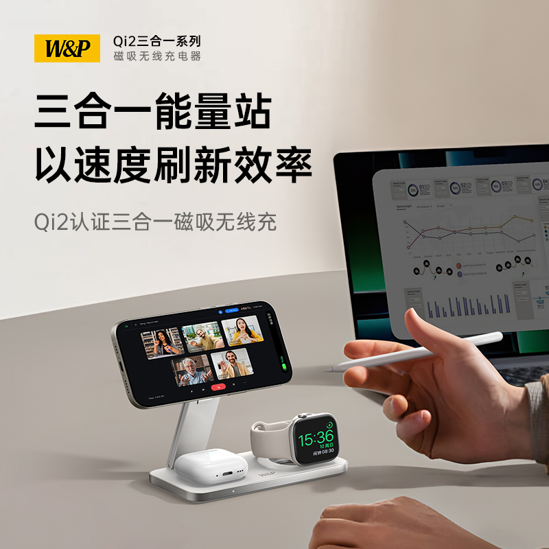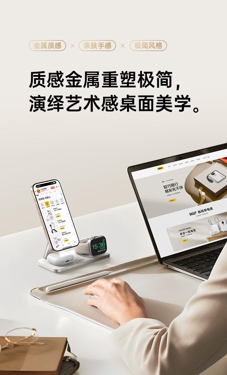 15W无线充电 同时为手机/苹果手表/耳机三部设备充电 小巧便携折叠设计 可升降支架,提高手机充电角度