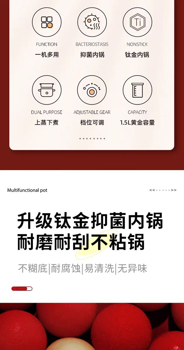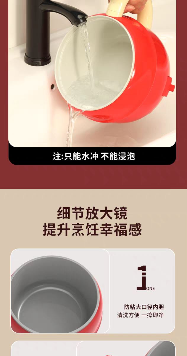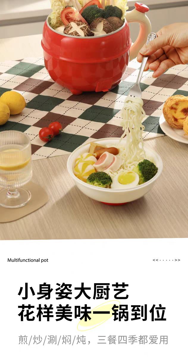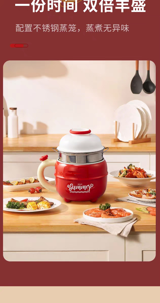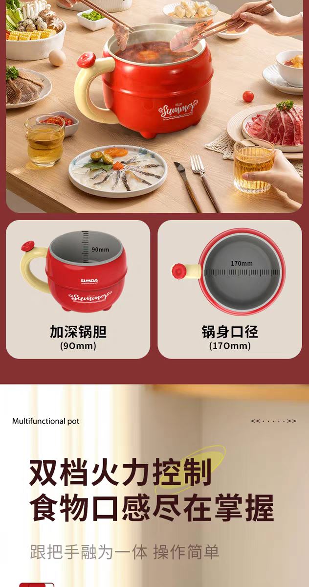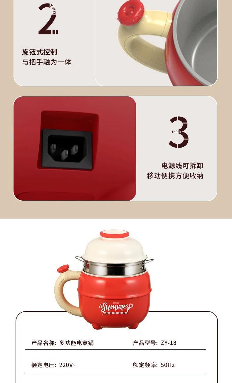 产品型号:ZY-18 产品尺寸:154*197*95mm 产品功率:800W 产品容量;1.5L 功能说明: 1、煎,炒,蒸,煮,涮,一锅玩转花样美食 2、800W大功率,快速升温, 3、不粘锅涂成,配食品级蒸笼 4、防干烧保护,自动断电,更安全5、1.5升超大容量,一锅美味,家人更喜欢6、不粘陶瓷釉内胆,PP塑料外壳,304不锈钢内盖 7、超高颜值,抖音网红款