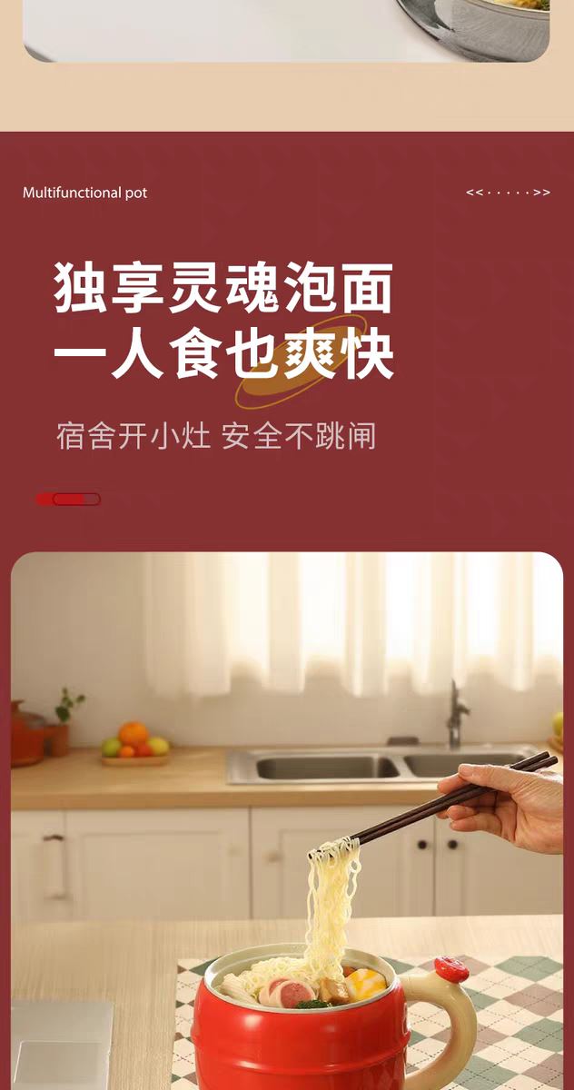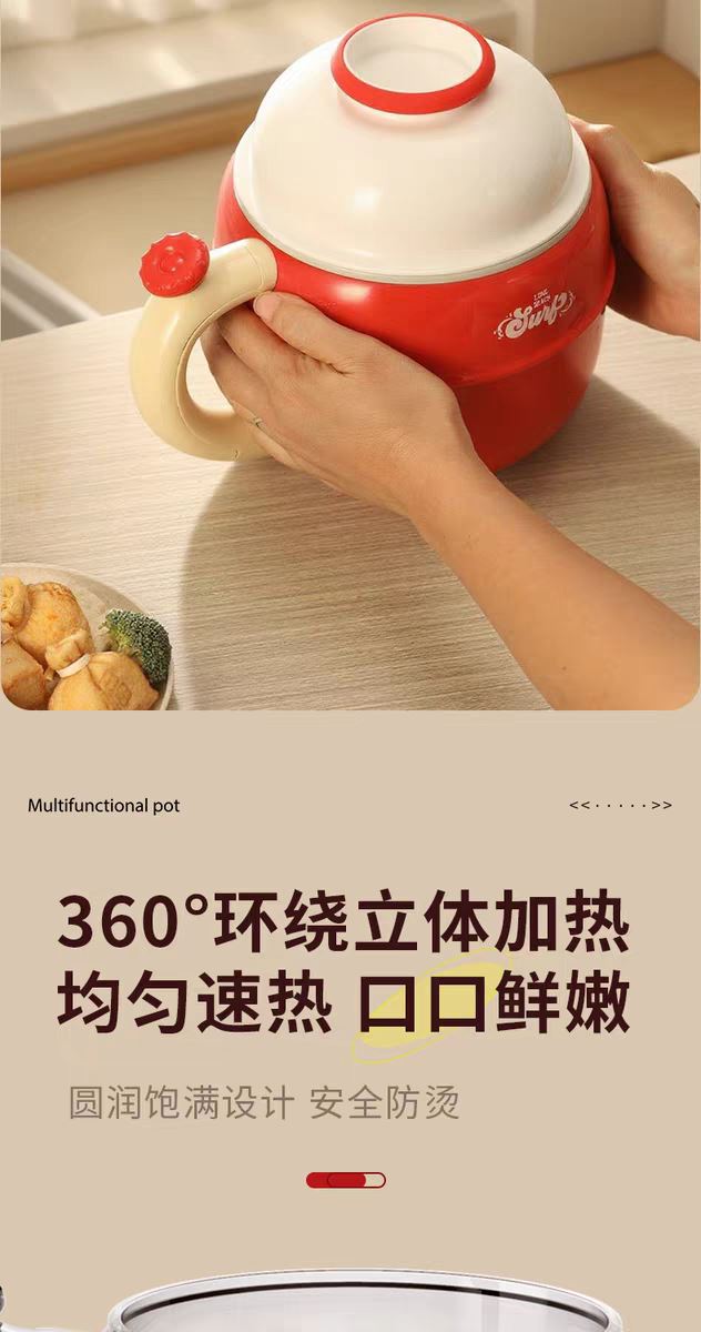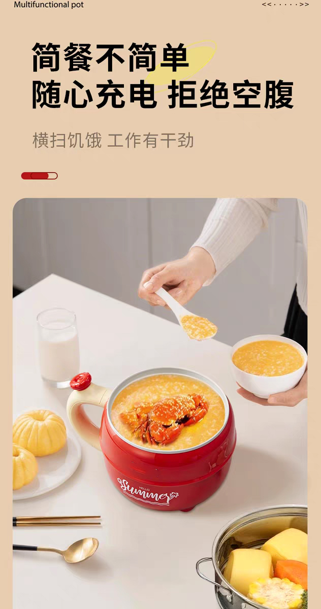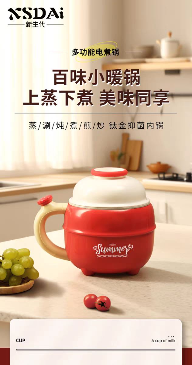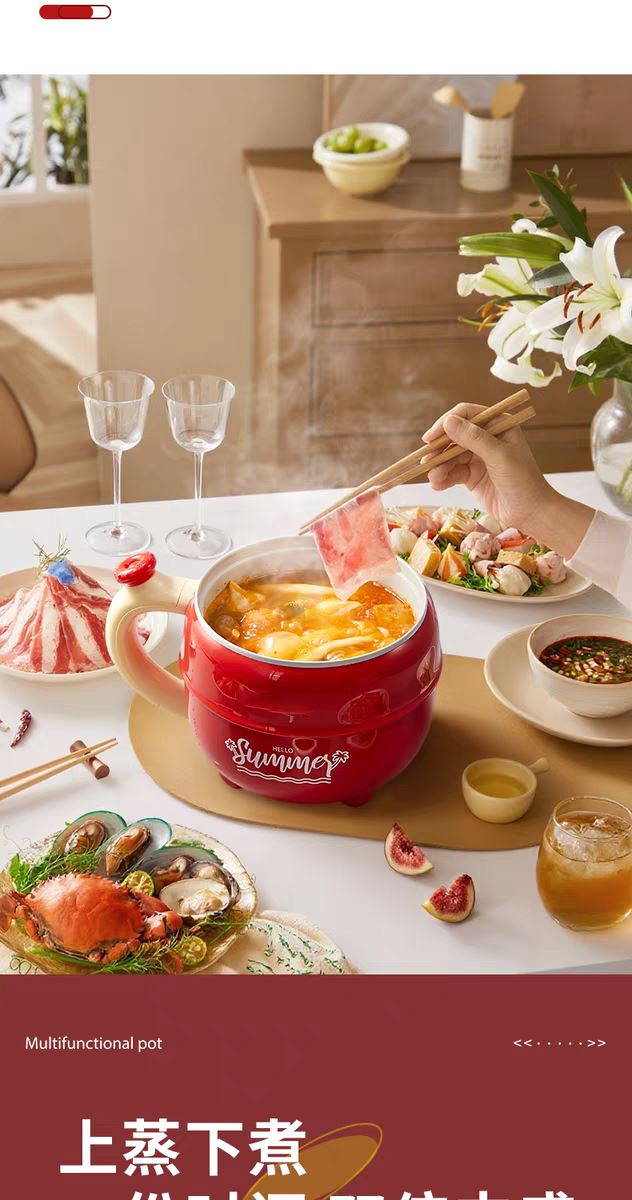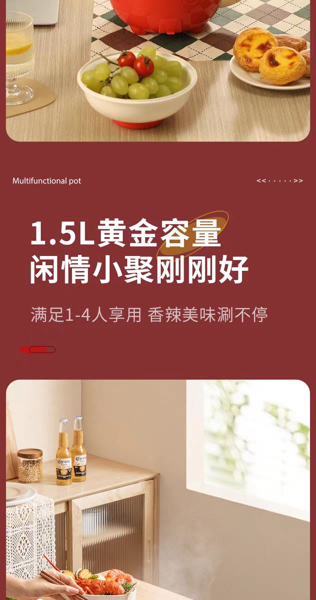 产品型号:ZY-18 产品尺寸:154*197*95mm 产品功率:800W 产品容量;1.5L 功能说明: 1、煎,炒,蒸,煮,涮,一锅玩转花样美食 2、800W大功率,快速升温, 3、不粘锅涂成,配食品级蒸笼 4、防干烧保护,自动断电,更安全5、1.5升超大容量,一锅美味,家人更喜欢6、不粘陶瓷釉内胆,PP塑料外壳,304不锈钢内盖 7、超高颜值,抖音网红款