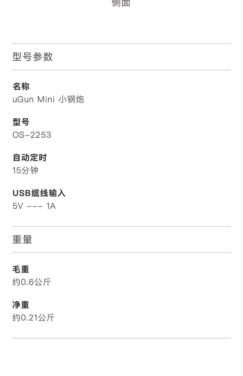消耗功率:5V-1AUSB输入 自动定时:10min 净重:约 200 克 毛重:约 350 克 1、轻巧便捷 ,轻盈随行 2、健身/徒步 活力充沛 3、4档位变速,动力强劲不卡顿 4、三个功能头替换