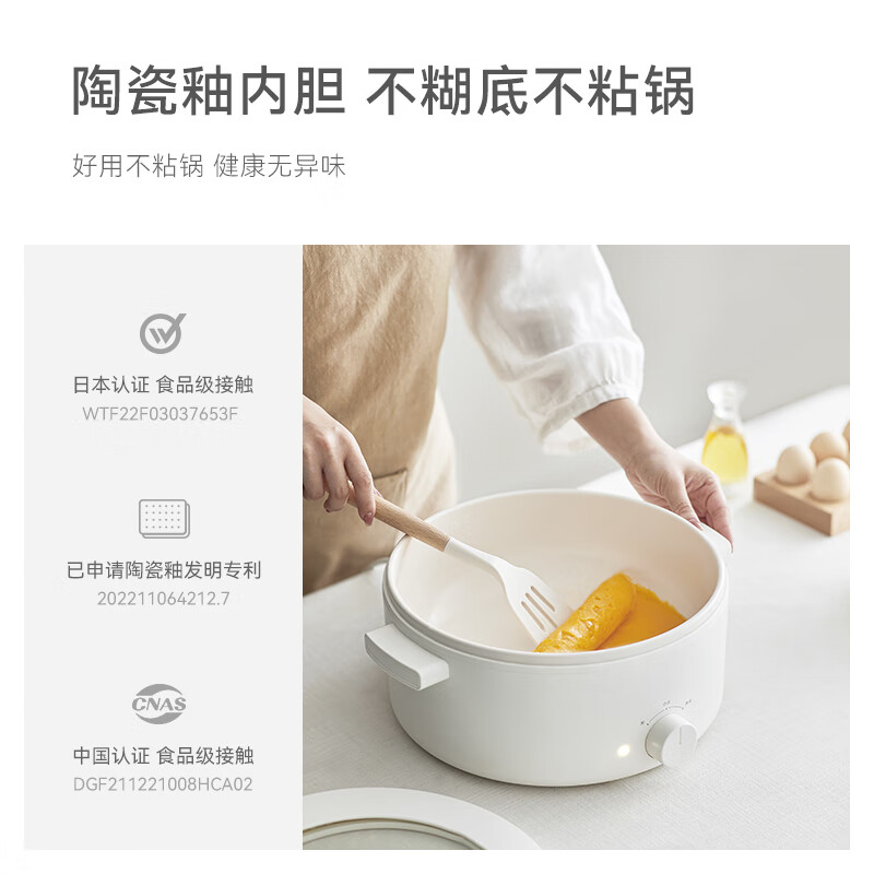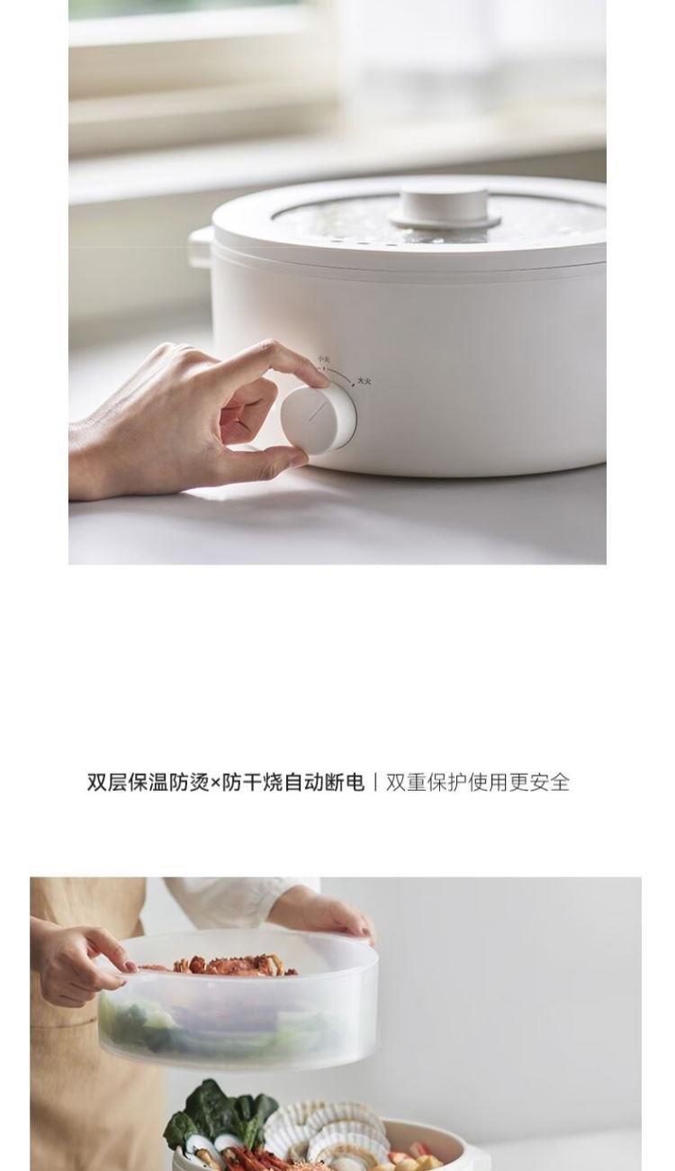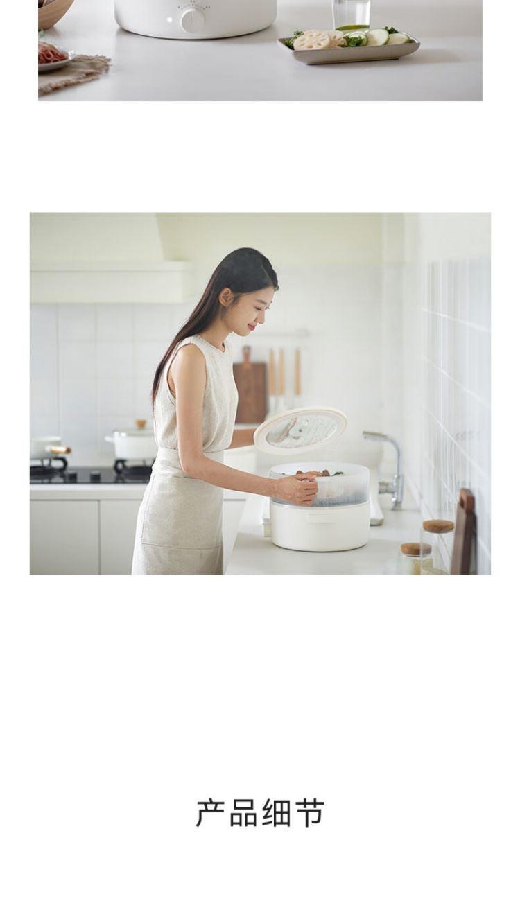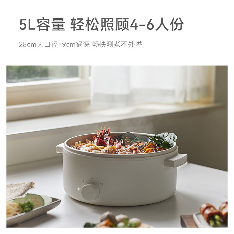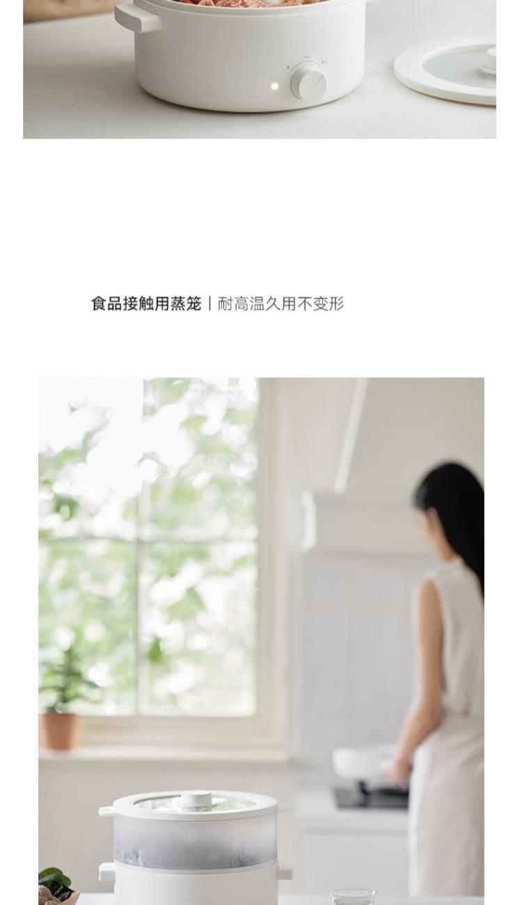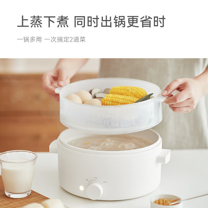 电煮锅:带蒸笼 颜色:陶白色 容量:5L 净重/毛重:2.17kg/2.94kg 额定功率:1400W 产品尺寸:342*290*153mm 条码:6977735711720 1. 聚能导热快,真正不糊底 2. 陶瓷釉内胆,安全易清洗,硬度8H 无惧钢丝刷 3. 28cm大口径,锅深9cm,翻炒从容 4. 360°整圈发热,温度稳定,防干烧自动断电 5. 上蒸下煮,高透明食品级PP蒸笼(耐温180度)