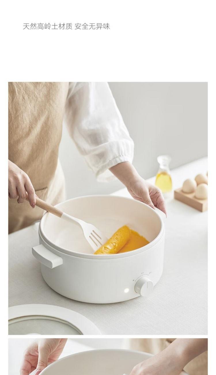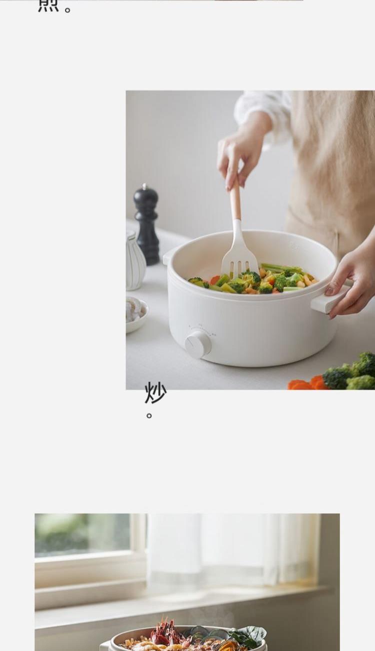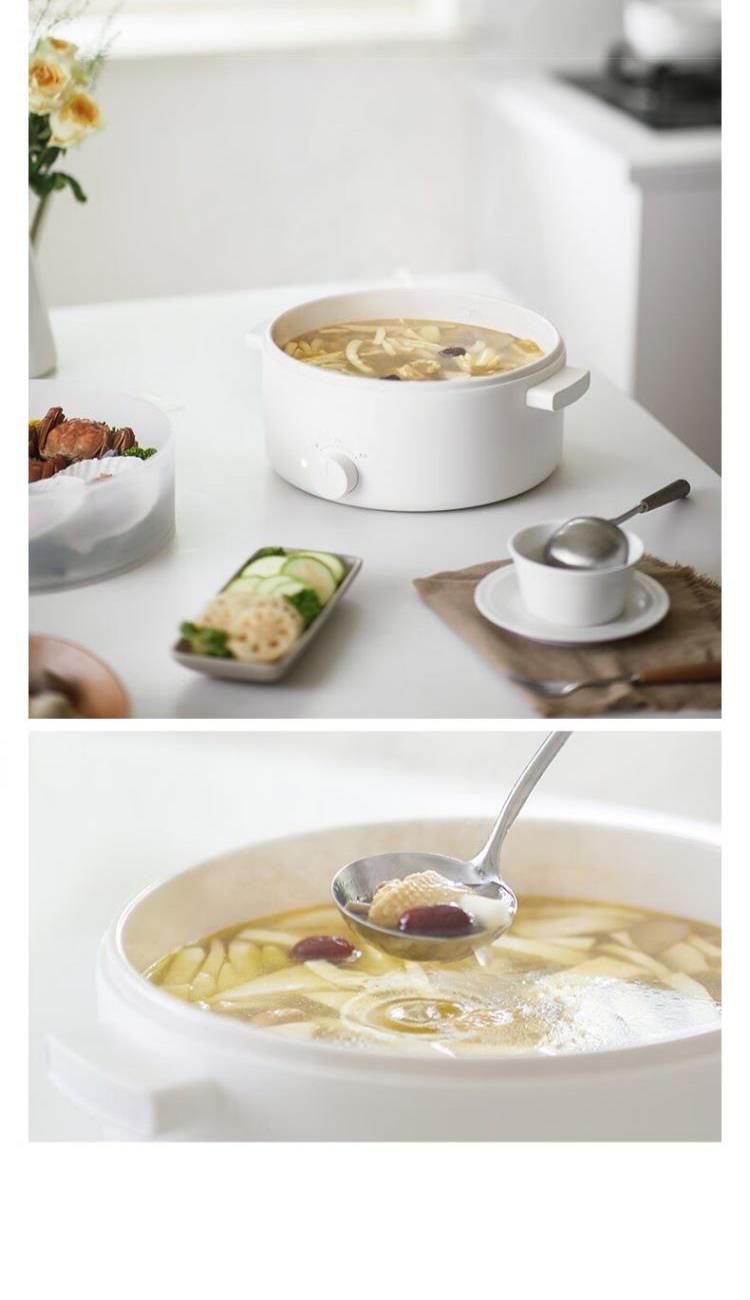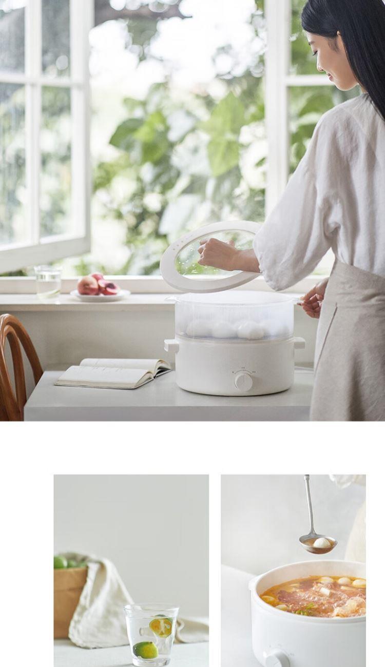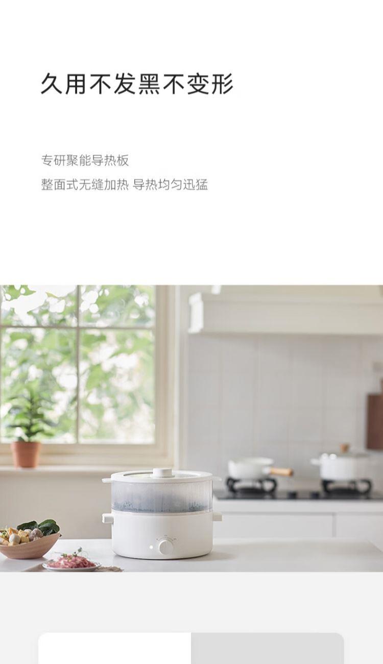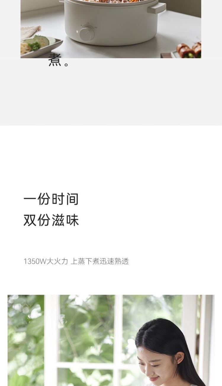 电煮锅:带蒸笼 颜色:陶白色 容量:5L 净重/毛重:2.17kg/2.94kg 额定功率:1400W 产品尺寸:342*290*153mm 条码:6977735711720 1. 聚能导热快,真正不糊底 2. 陶瓷釉内胆,安全易清洗,硬度8H 无惧钢丝刷 3. 28cm大口径,锅深9cm,翻炒从容 4. 360°整圈发热,温度稳定,防干烧自动断电 5. 上蒸下煮,高透明食品级PP蒸笼(耐温180度)