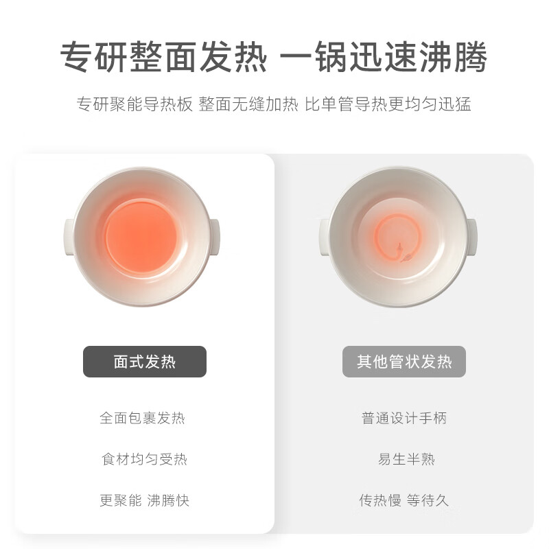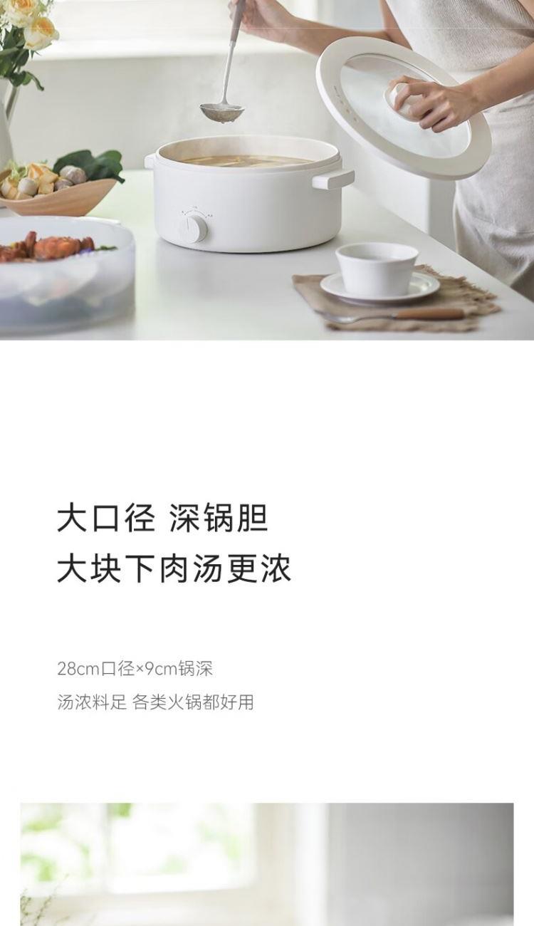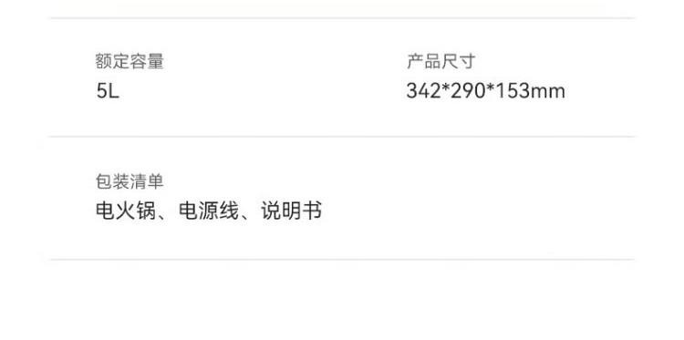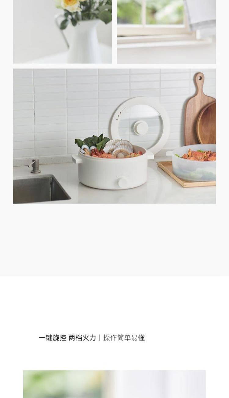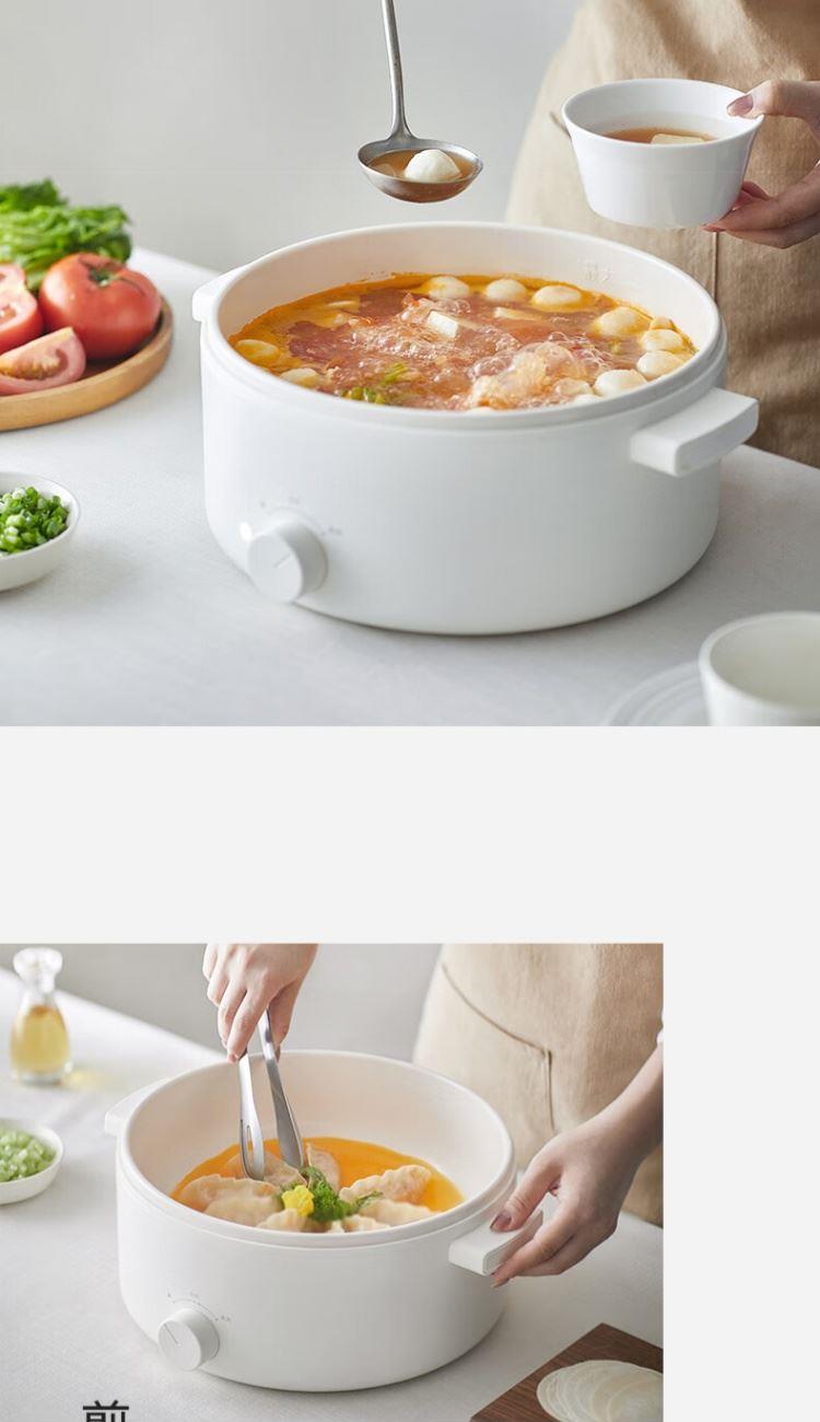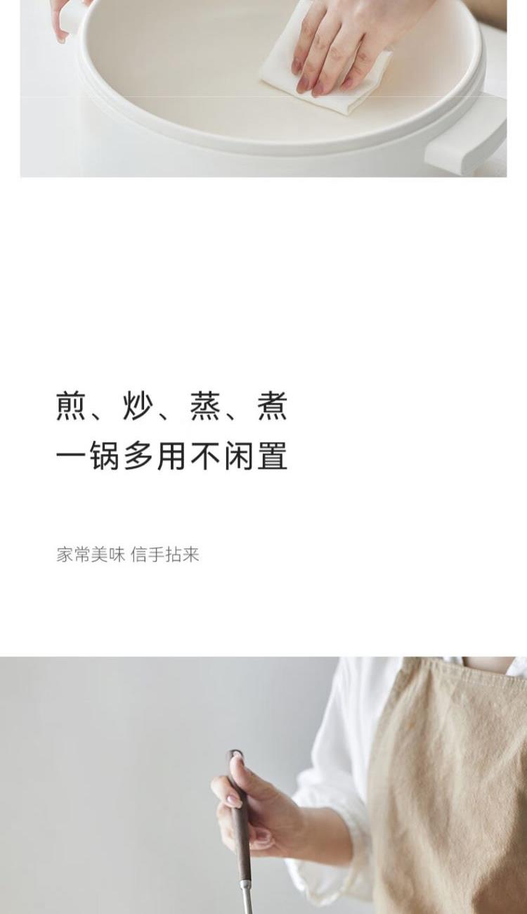 电煮锅:带蒸笼 颜色:陶白色 容量:5L 净重/毛重:2.17kg/2.94kg 额定功率:1400W 产品尺寸:342*290*153mm 条码:6977735711720 1. 聚能导热快,真正不糊底 2. 陶瓷釉内胆,安全易清洗,硬度8H 无惧钢丝刷 3. 28cm大口径,锅深9cm,翻炒从容 4. 360°整圈发热,温度稳定,防干烧自动断电 5. 上蒸下煮,高透明食品级PP蒸笼(耐温180度)