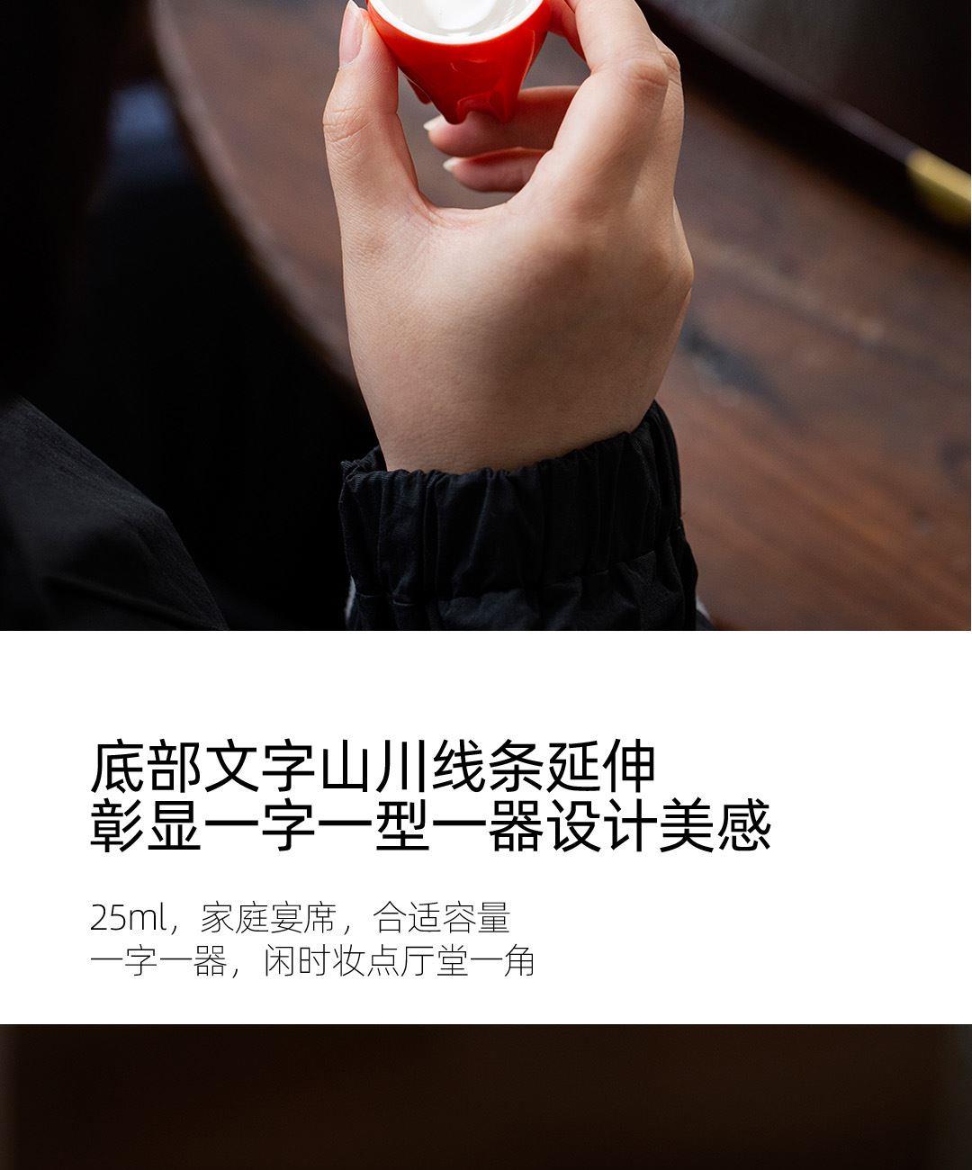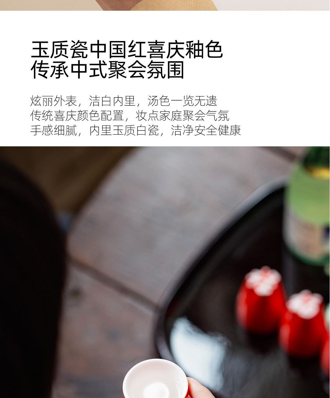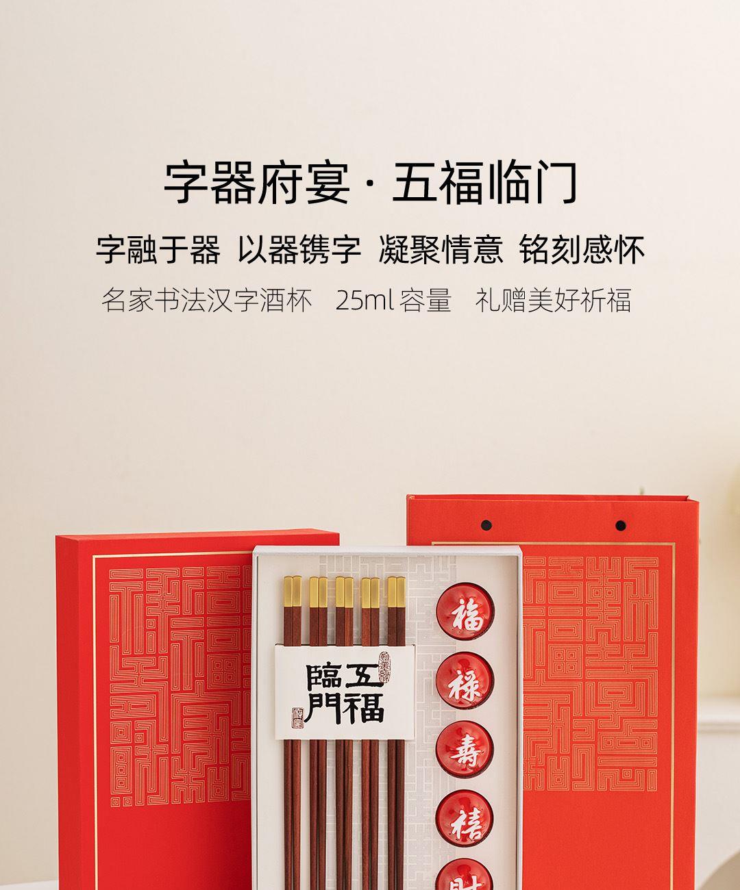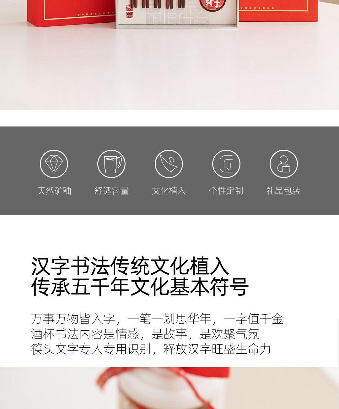 1:高等级高岭土,历经1300度以上高温烧制,不含铅和镉等重金属。 2:杯底书法源自书圣王羲之,手工塑形,一字一杯。 3:原木筷子,无漆无蜡,手工打磨个性定制,专人专筷,健康使用。。 4:包装采用特种雕金纸,大气美观,定制美观。 配置:吉意杯*5 (福禄寿禧财) 红檀中华筷*5 材质:白玉瓷胎 实木