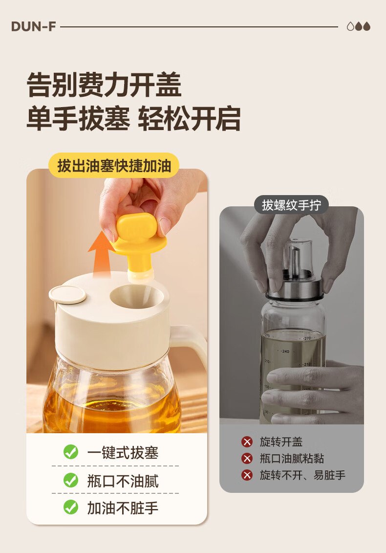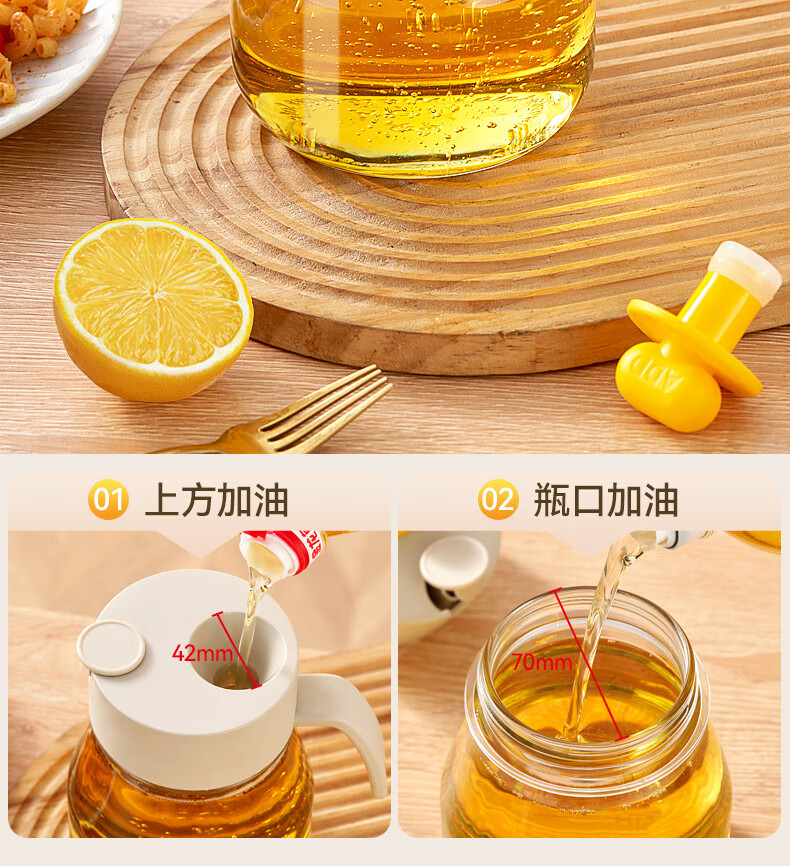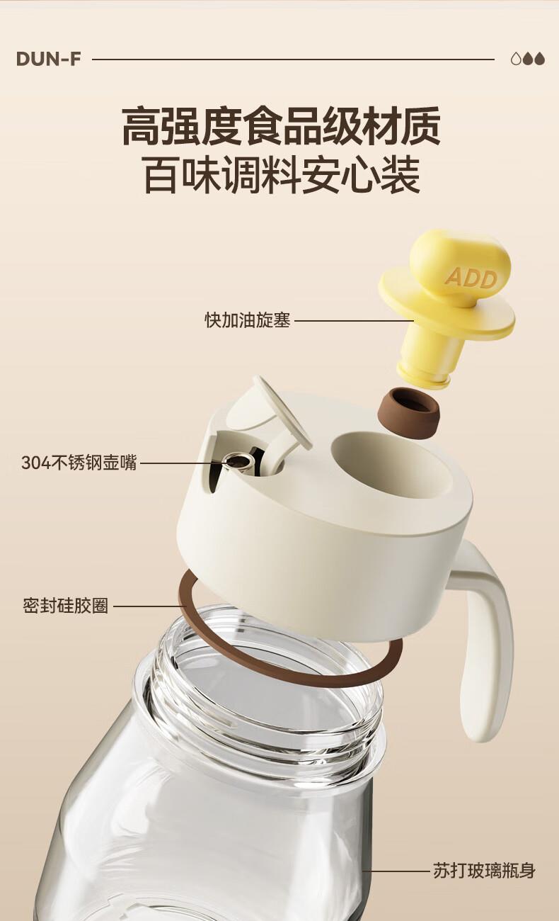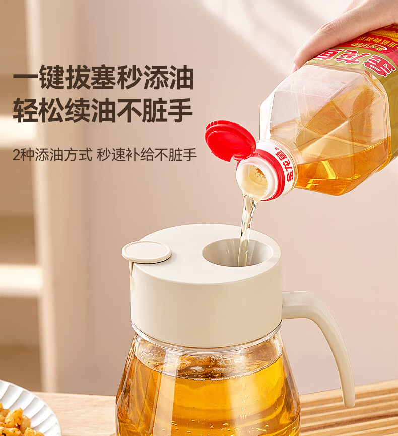 大容量墩墩油壶厨房省心之选 超大容量自动开合快捷加油 1000ml大容量,装满一次用整月 巨量装油,厨房续航无忧 一键拔塞秒添油轻松续油不脏手: 2种添油方式秒速补给不脏手 告别费力开盖单手拔塞 轻松开启 不锈钢壶嘴利落收油不挂油,倒完油自动回流直接流回瓶子里 耐高温 不变形防腐蚀,高强度食品级材质百味调料安心装,安全更耐用 采用加厚耐摔材质 70mm超宽瓶口清洗超轻松 大口径直冲无死角,手可直接伸入清洁