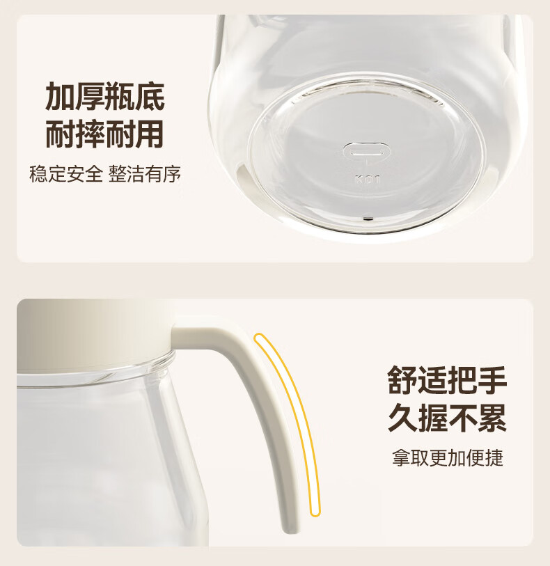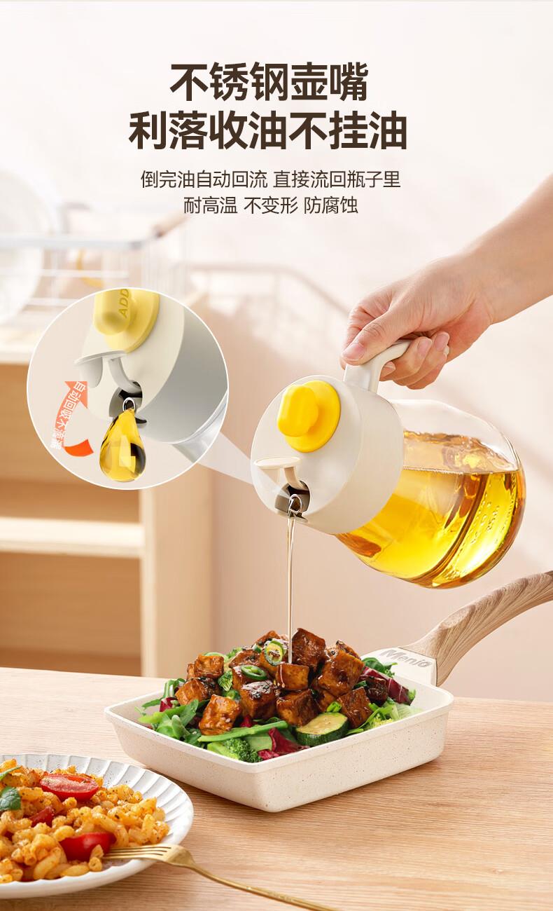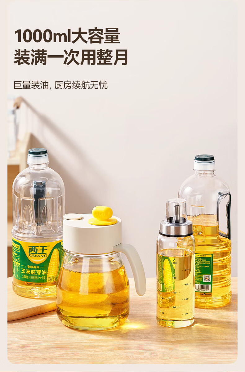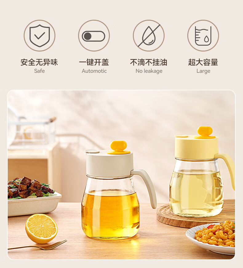 大容量墩墩油壶厨房省心之选 超大容量自动开合快捷加油 1000ml大容量,装满一次用整月 巨量装油,厨房续航无忧 一键拔塞秒添油轻松续油不脏手: 2种添油方式秒速补给不脏手 告别费力开盖单手拔塞 轻松开启 不锈钢壶嘴利落收油不挂油,倒完油自动回流直接流回瓶子里 耐高温 不变形防腐蚀,高强度食品级材质百味调料安心装,安全更耐用 采用加厚耐摔材质 70mm超宽瓶口清洗超轻松 大口径直冲无死角,手可直接伸入清洁