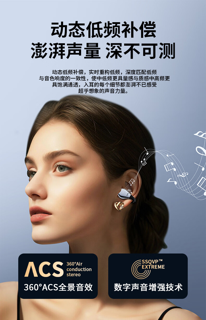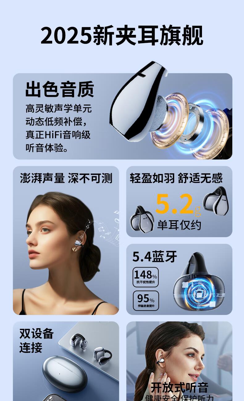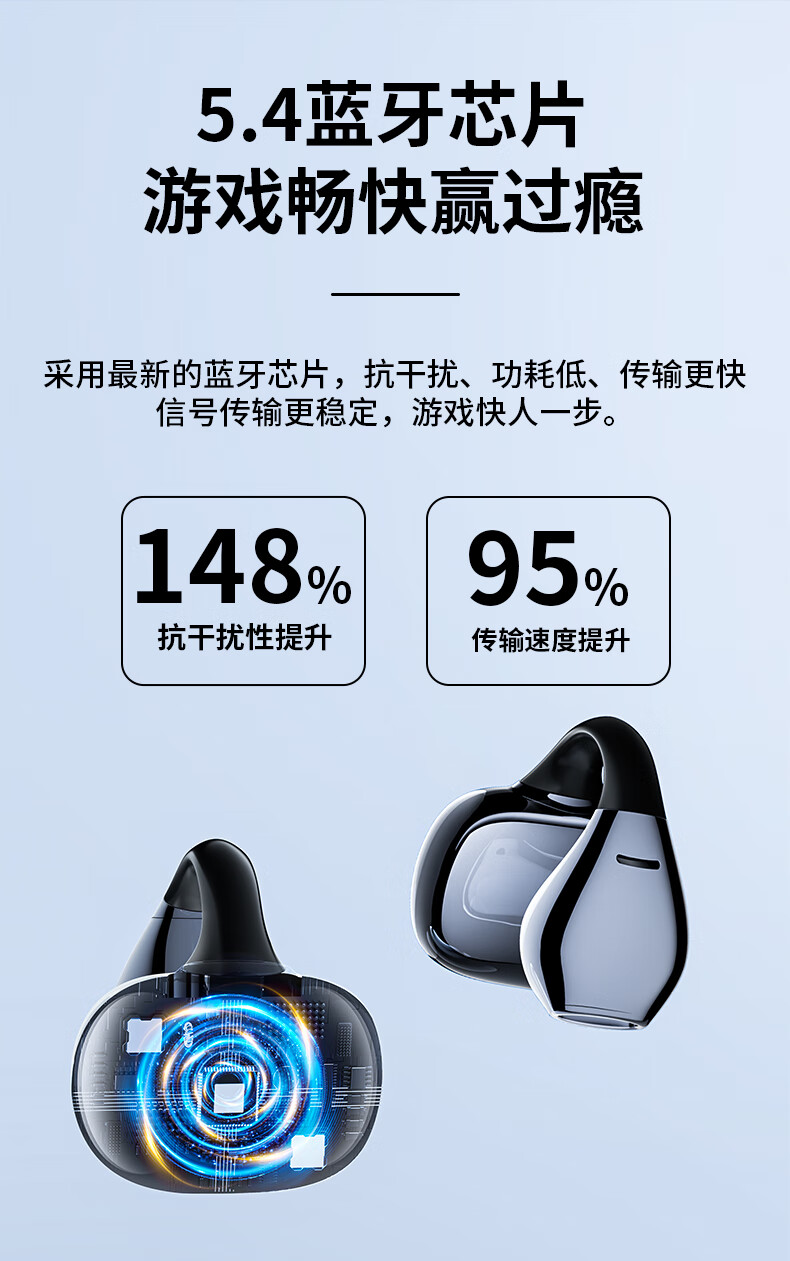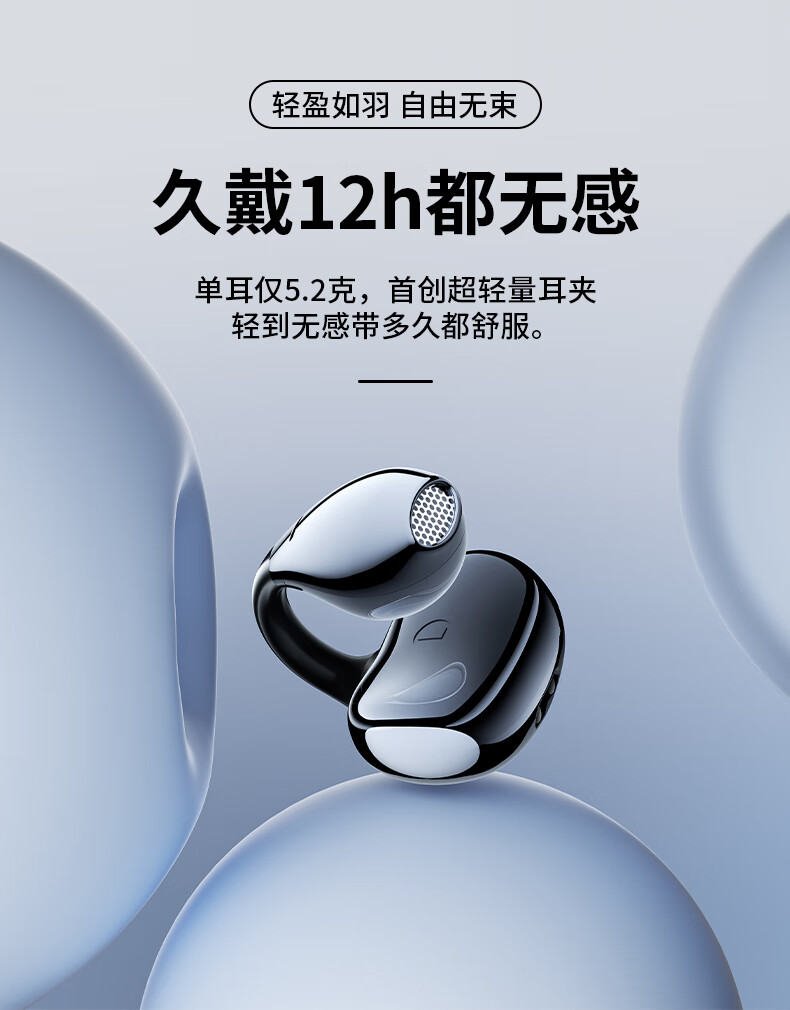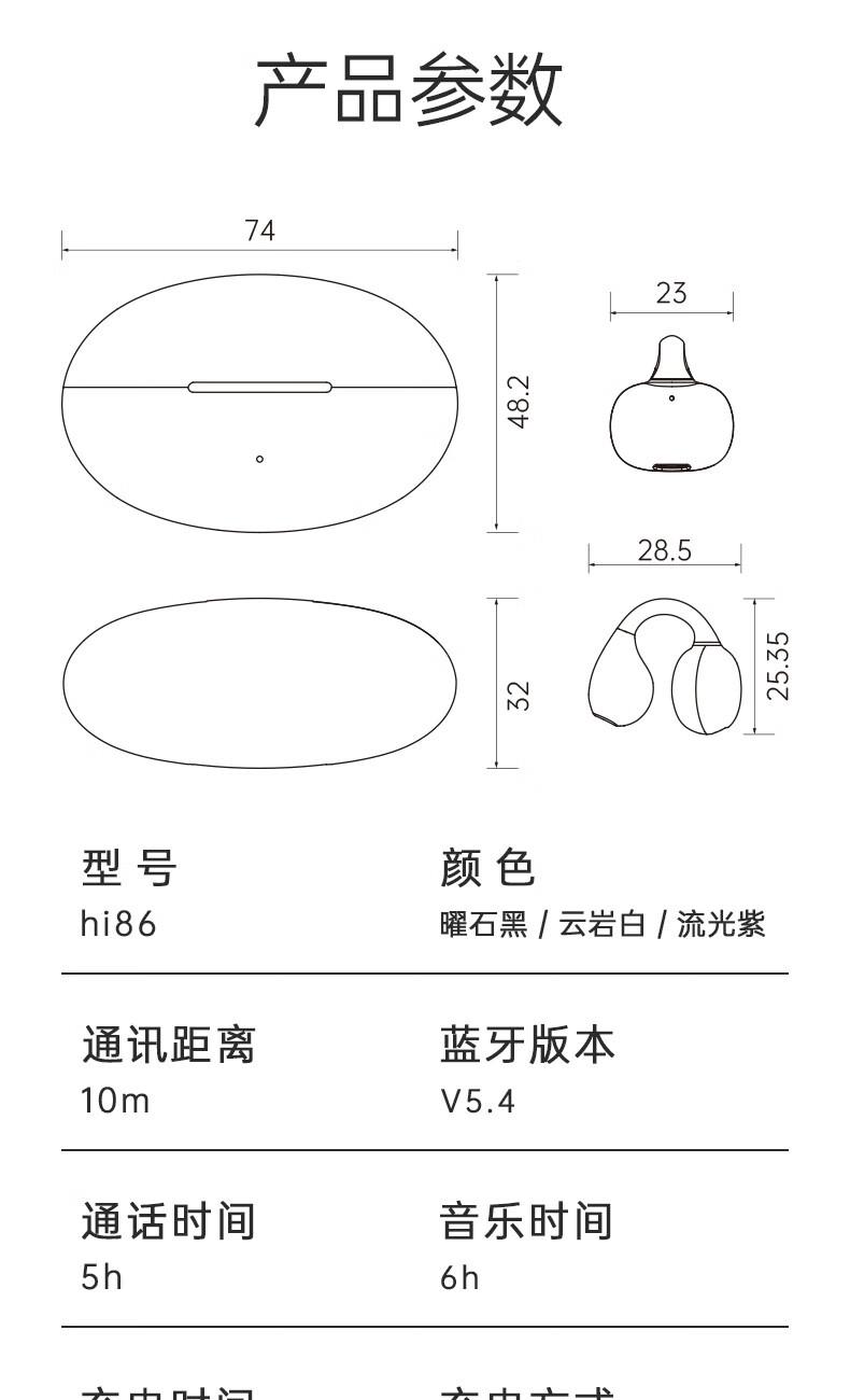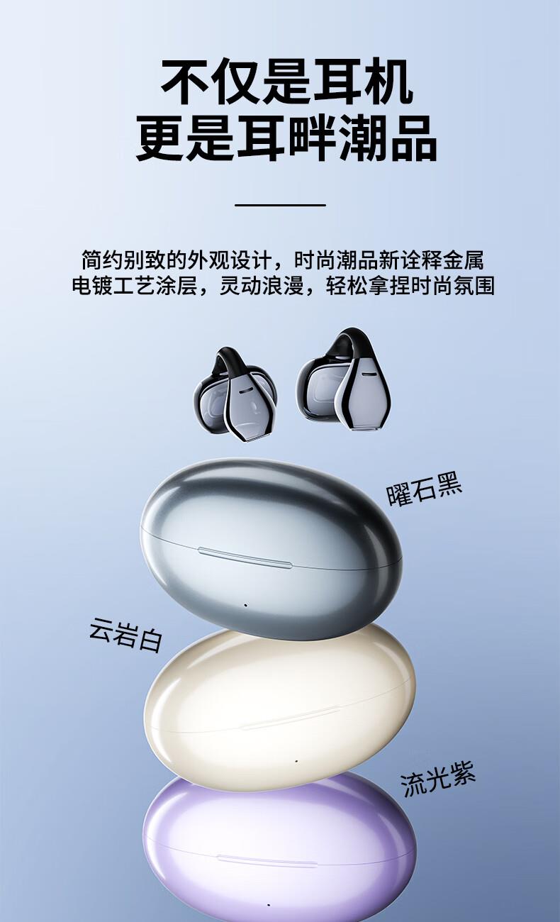 蓝牙版本:5.4 蓝牙芯片:RTL8753EFE(瑞昱)颜 色:黑色、紫色、肤色、玫瑰金 续航时间:单次充满使用5-6小时左右,充电仓电量可以给耳机充满2-3次左右。 待机时间:约200小时 防水等级:IPX5充电接口:TYPE-C接口电池容量:耳机:50mAh*2 耳机仓:400mAh 传输距离:10m(无障碍路段) 产品特点:重低音,高音表现出色,芯片调校很好,对标华为FreeClip的平替顶配