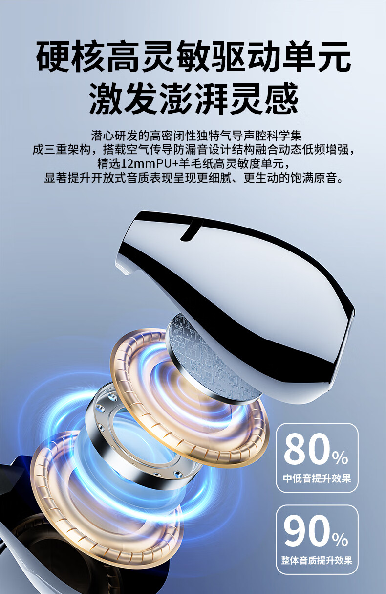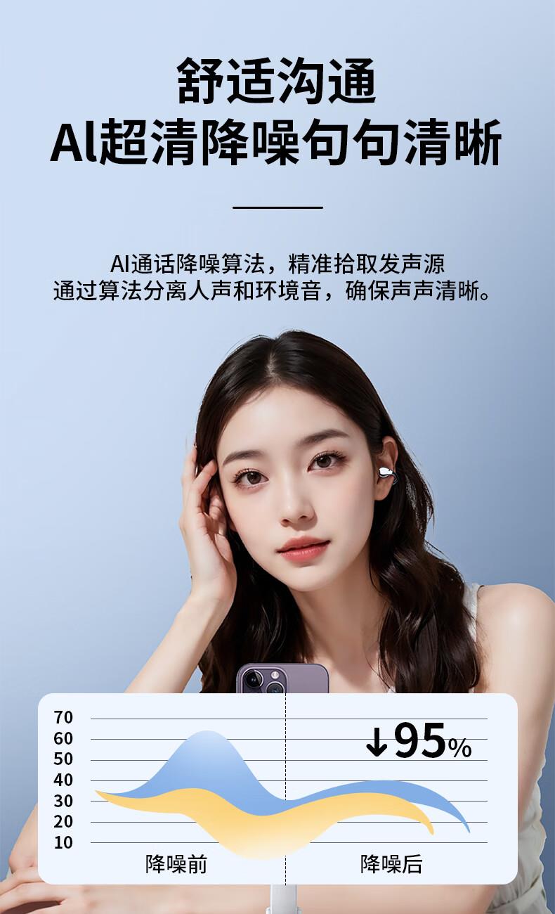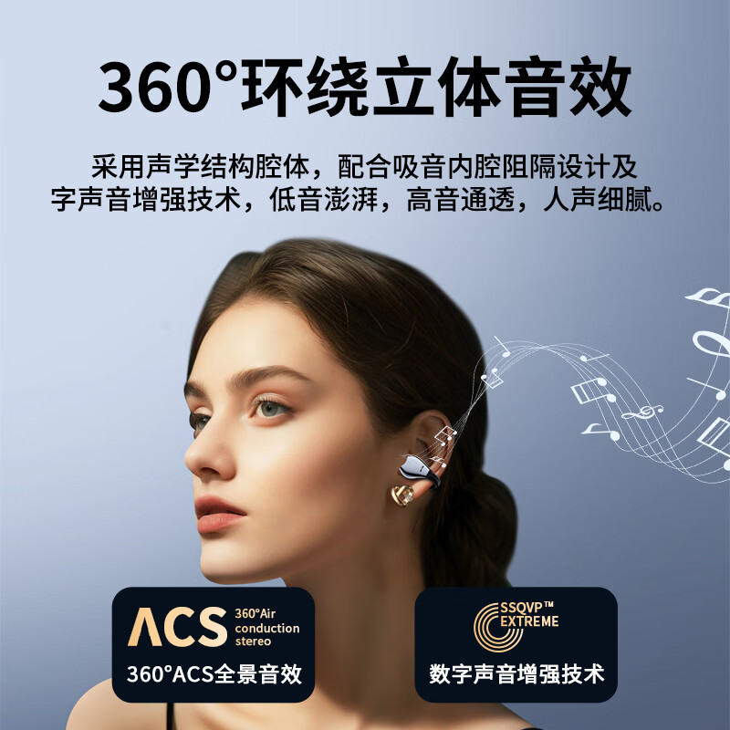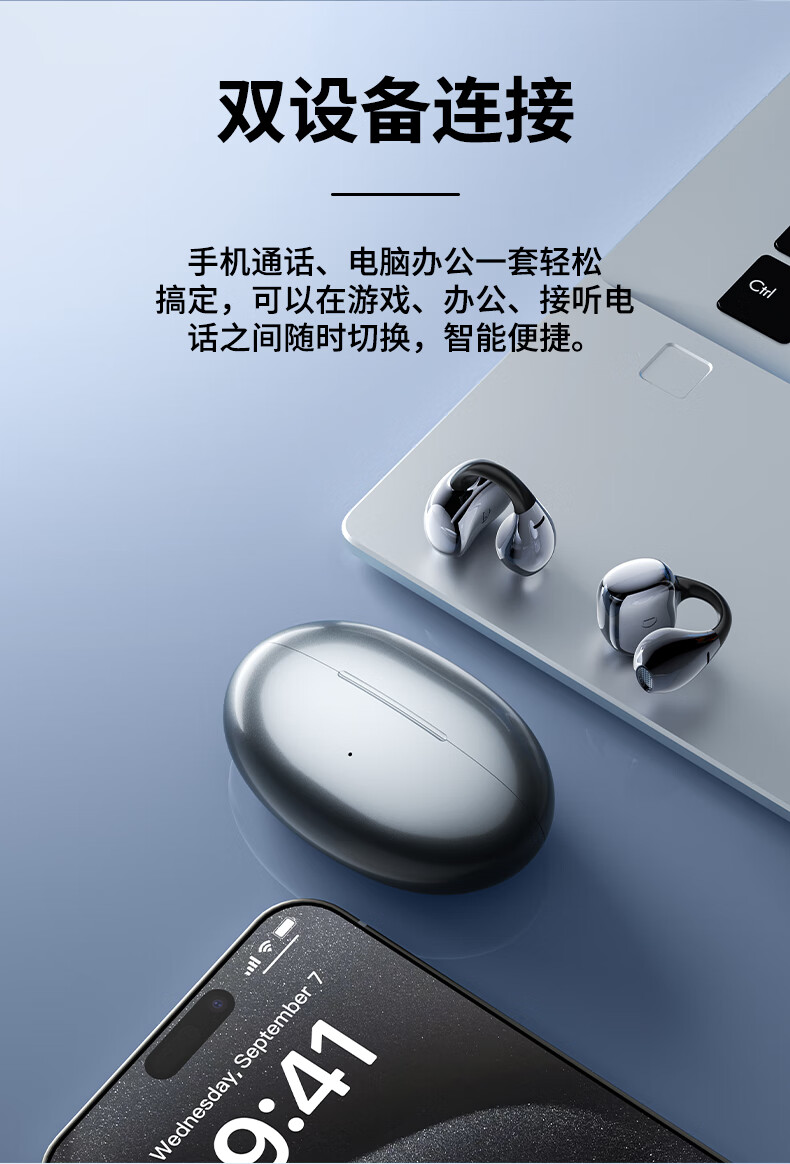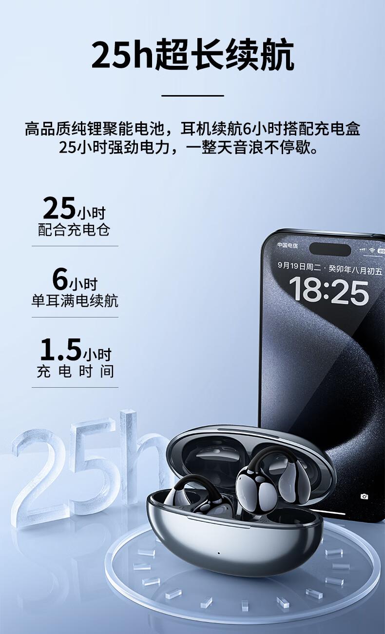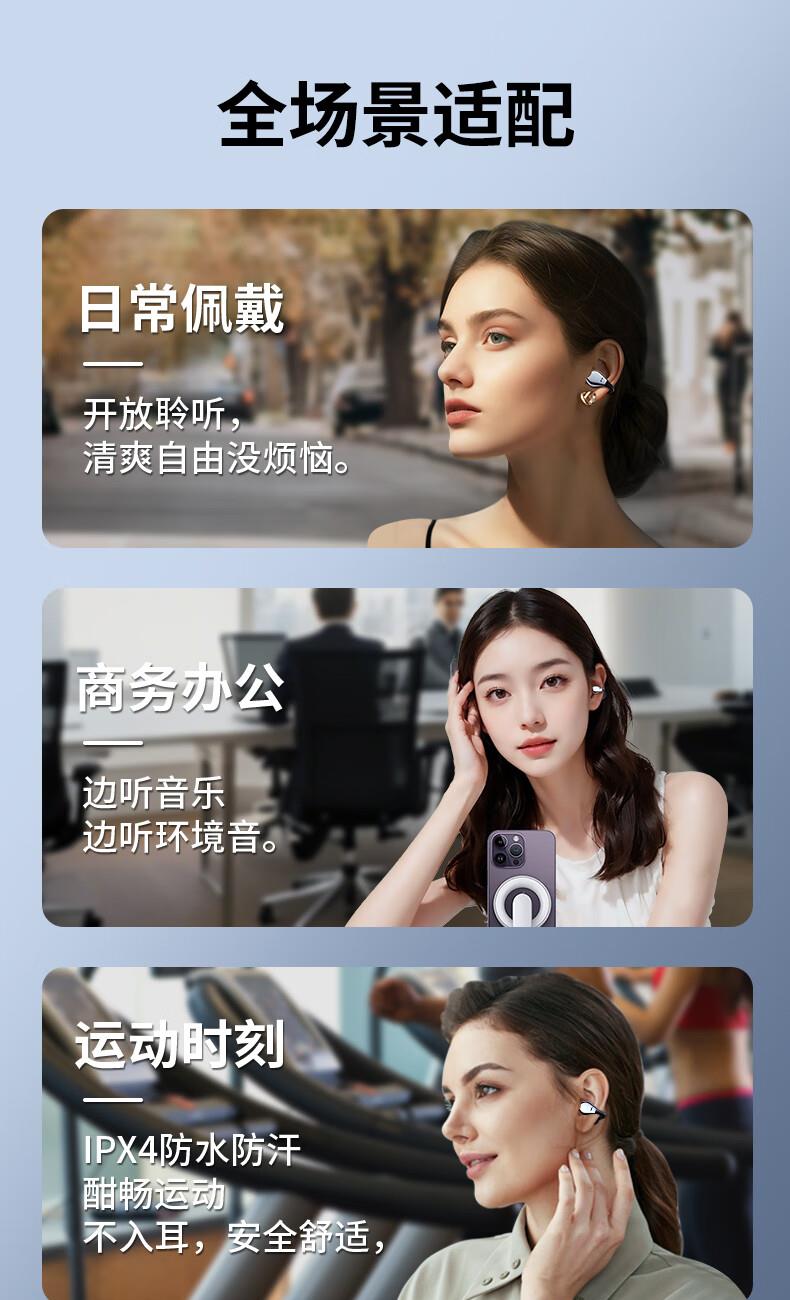 蓝牙版本:5.4 蓝牙芯片:RTL8753EFE(瑞昱)颜 色:黑色、紫色、肤色、玫瑰金 续航时间:单次充满使用5-6小时左右,充电仓电量可以给耳机充满2-3次左右。 待机时间:约200小时 防水等级:IPX5充电接口:TYPE-C接口电池容量:耳机:50mAh*2 耳机仓:400mAh 传输距离:10m(无障碍路段) 产品特点:重低音,高音表现出色,芯片调校很好,对标华为FreeClip的平替顶配