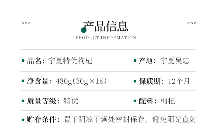 品 名:宁夏特优枸杞 净含量:480g(30gX16) 质量等级:特优 产地:宁夏吴忠 保质期:12个月 配料:枸杞 贮存条件:置于阴凉干燥处密封保存,避免阳光直射