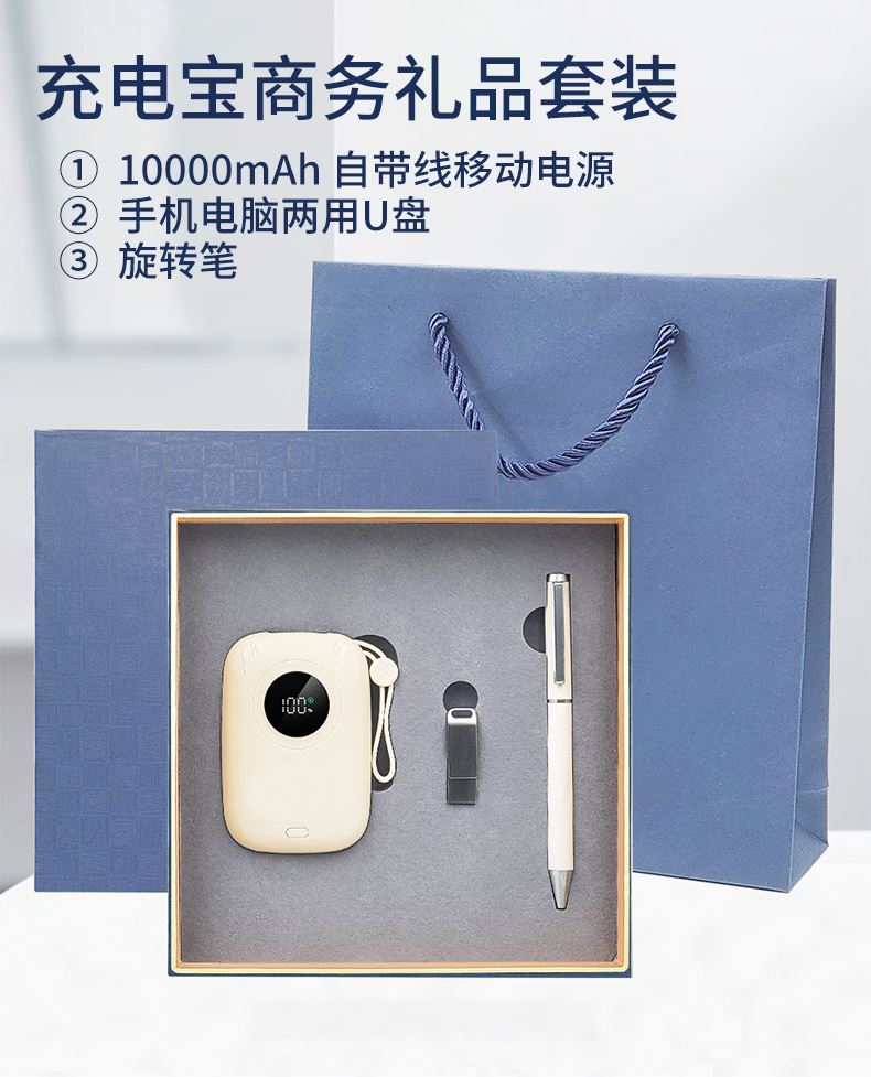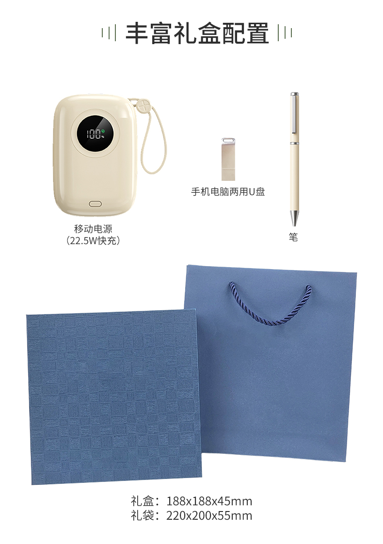 礼盒配置: 1、22.5W超级快充10000mAh自带线移动电源 2、旋转手机电脑两用16G U盘(Type-C/USB) 3、金属烤漆签字笔 4、包装盒尺寸:188x188x45mm 5、手提袋尺寸:199x220x55mm 6、重量:28kg/箱 芯片芯片涨价幅度太大,所有带U盘的报价之前,请先确认;
