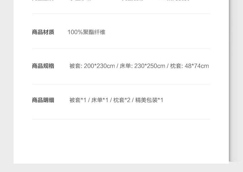 材质:聚酯纤维 被套:220cm×240cm×1 床单:270cm×245cm×1 枕套:48cm×74cm×2