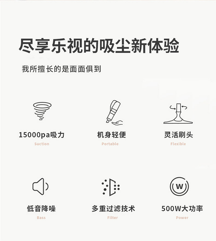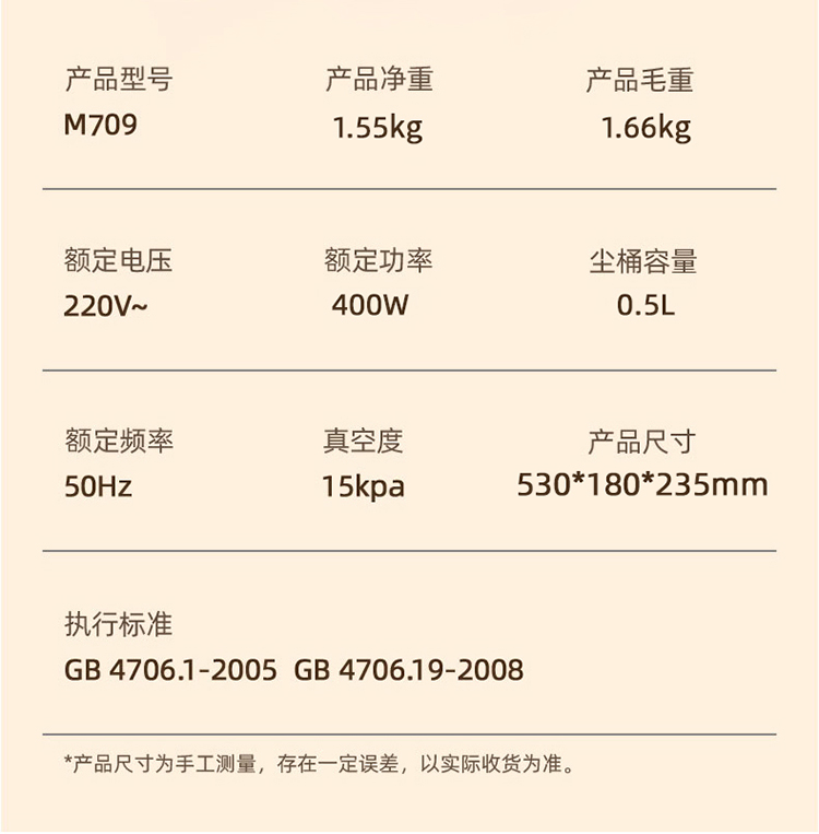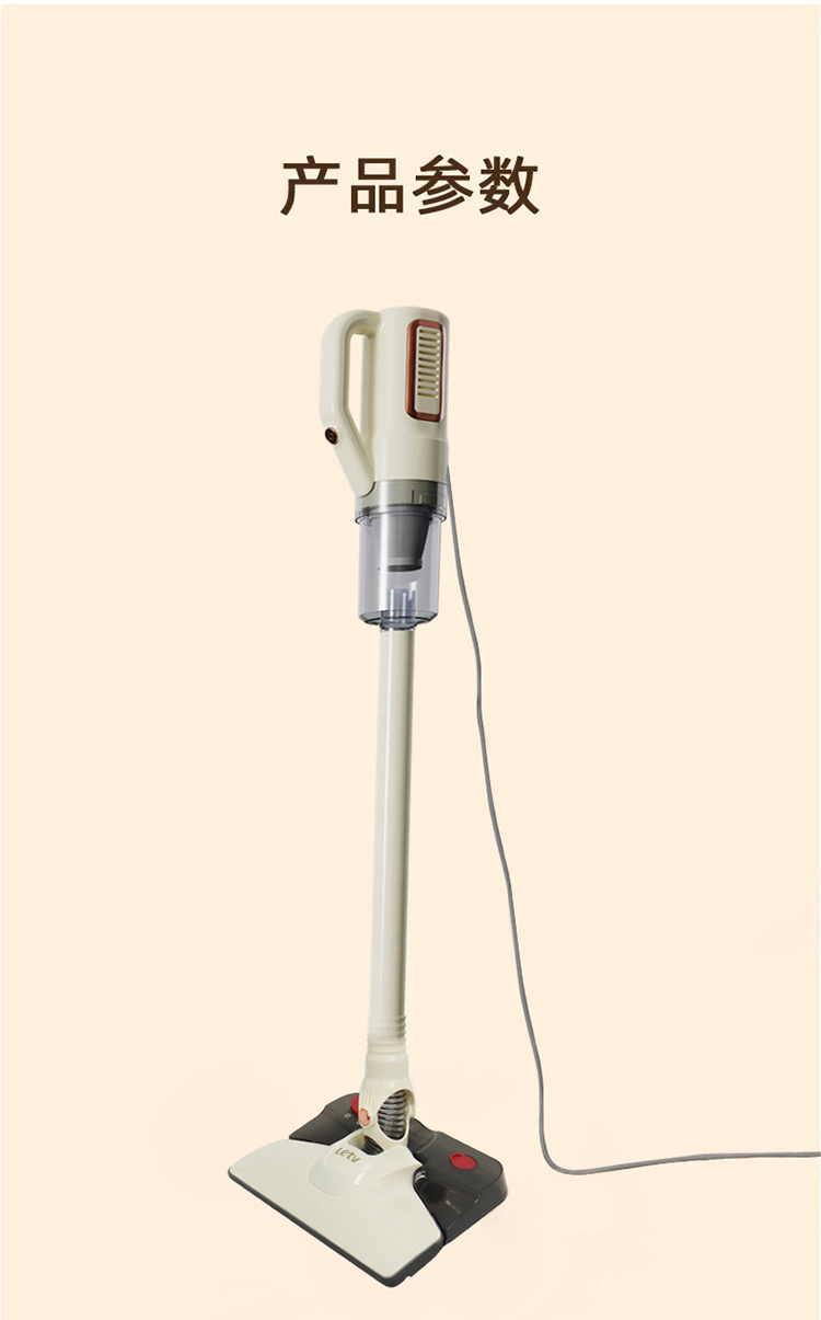 产品净重:1.55kg 产品毛重:1.66kg额定电压:220V~ 额定功率:400W 尘桶容量:0.5L 真空度:15kpa 产品尺寸:330*180*235mm 包装尺寸:530*180*235mm 1、机身轻便。 2、灵活刷头。 3、多重过滤技术。 4、一键开关 操控便捷。 5、紧密线型散热口 均匀散热。
