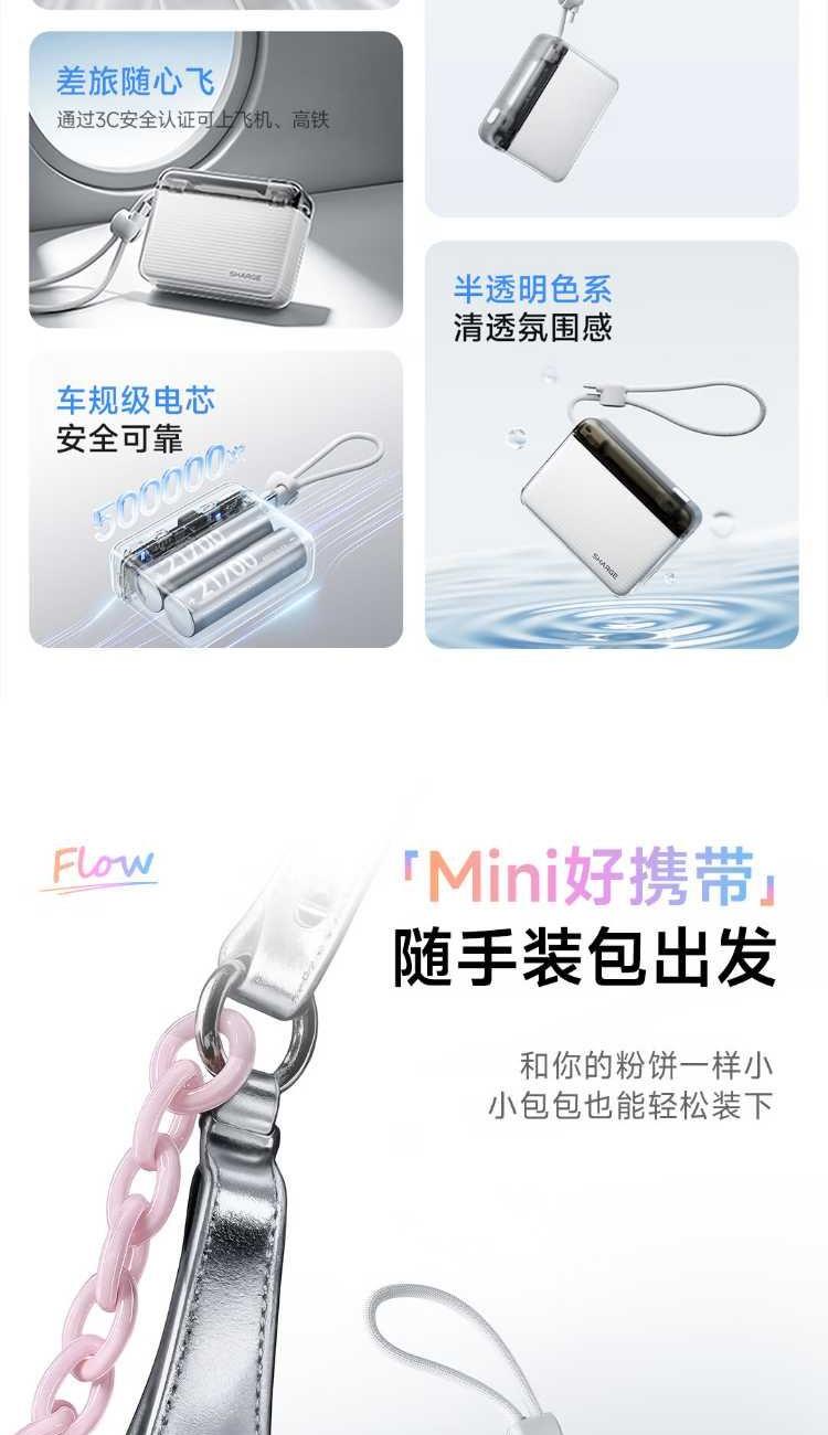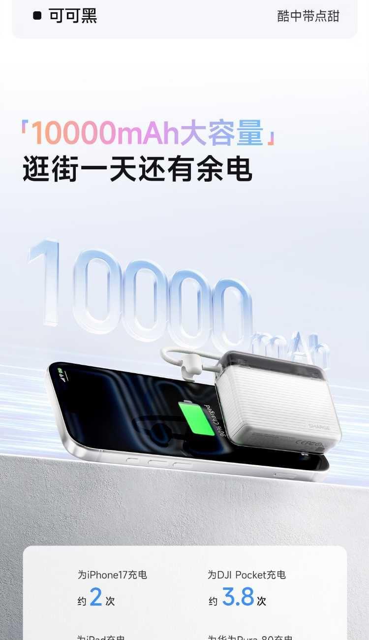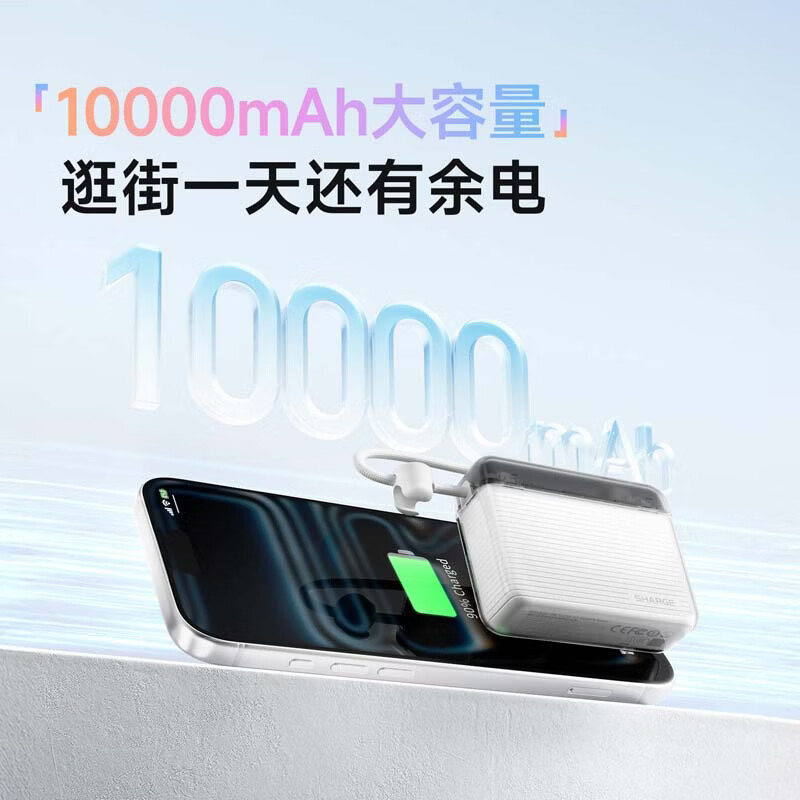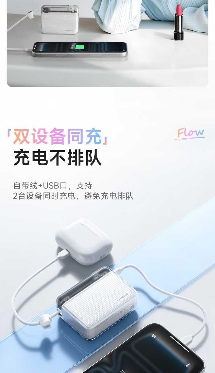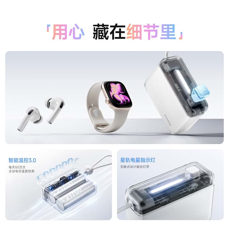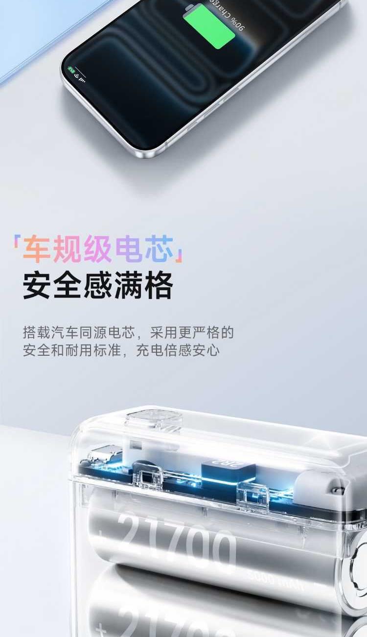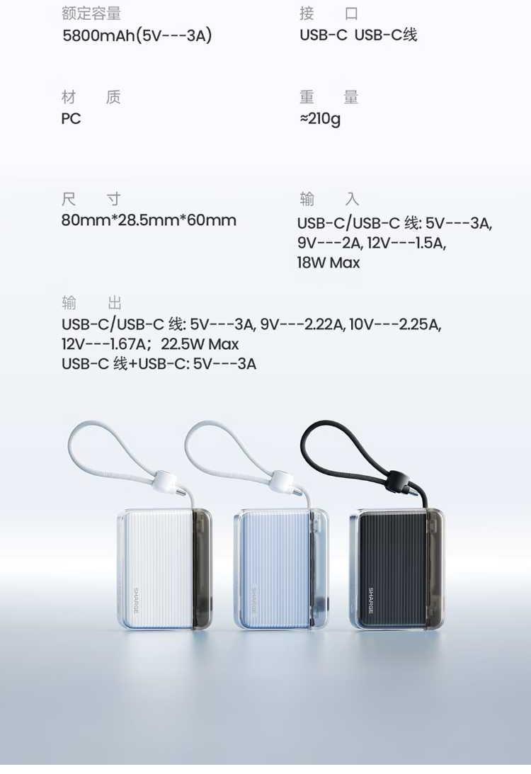 型号:P4 材质:防火PC(V0级) 容量:10000mAh 输出:USB-C线/口:22.5W (Max) USB-C线+USB-C口:5V⎓3A 颜色:黑色/白色/蓝色 接口类型:USB-C线,USB-C口 产品尺寸:8*6*2.85cm 包装尺寸:13.3*12.6*3.7cm 10000mAh,升级自带挂绳C线 升级22.5W快充,3C安全认证 C线+C口 双输出,同时充两台设备 冰感透明外壳设计,21700车规级电芯 星轨灯条电量灯设计,电量显示更加优雅