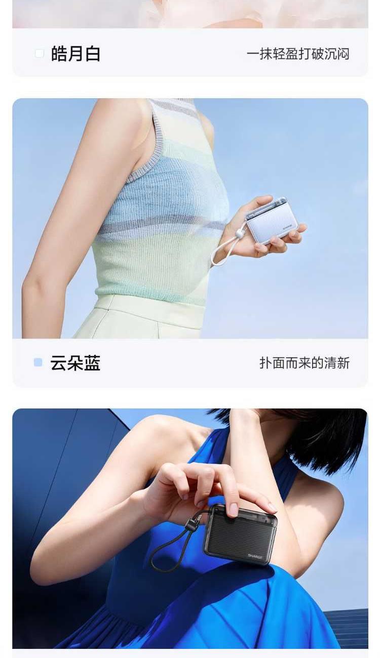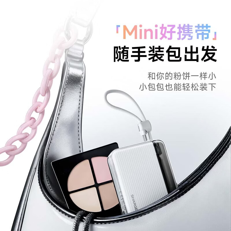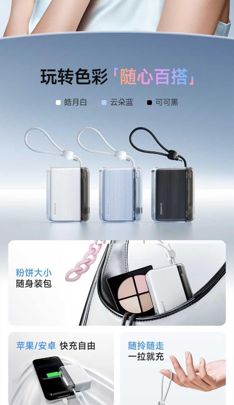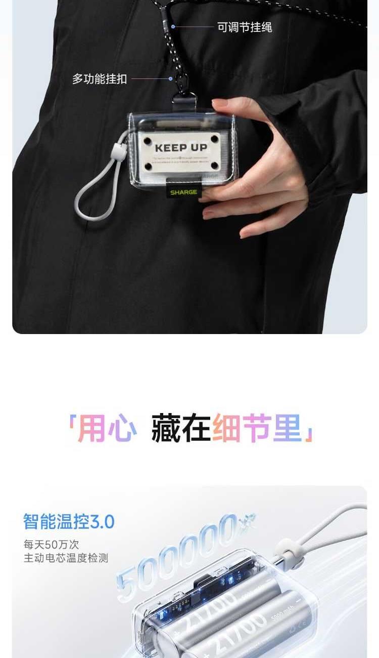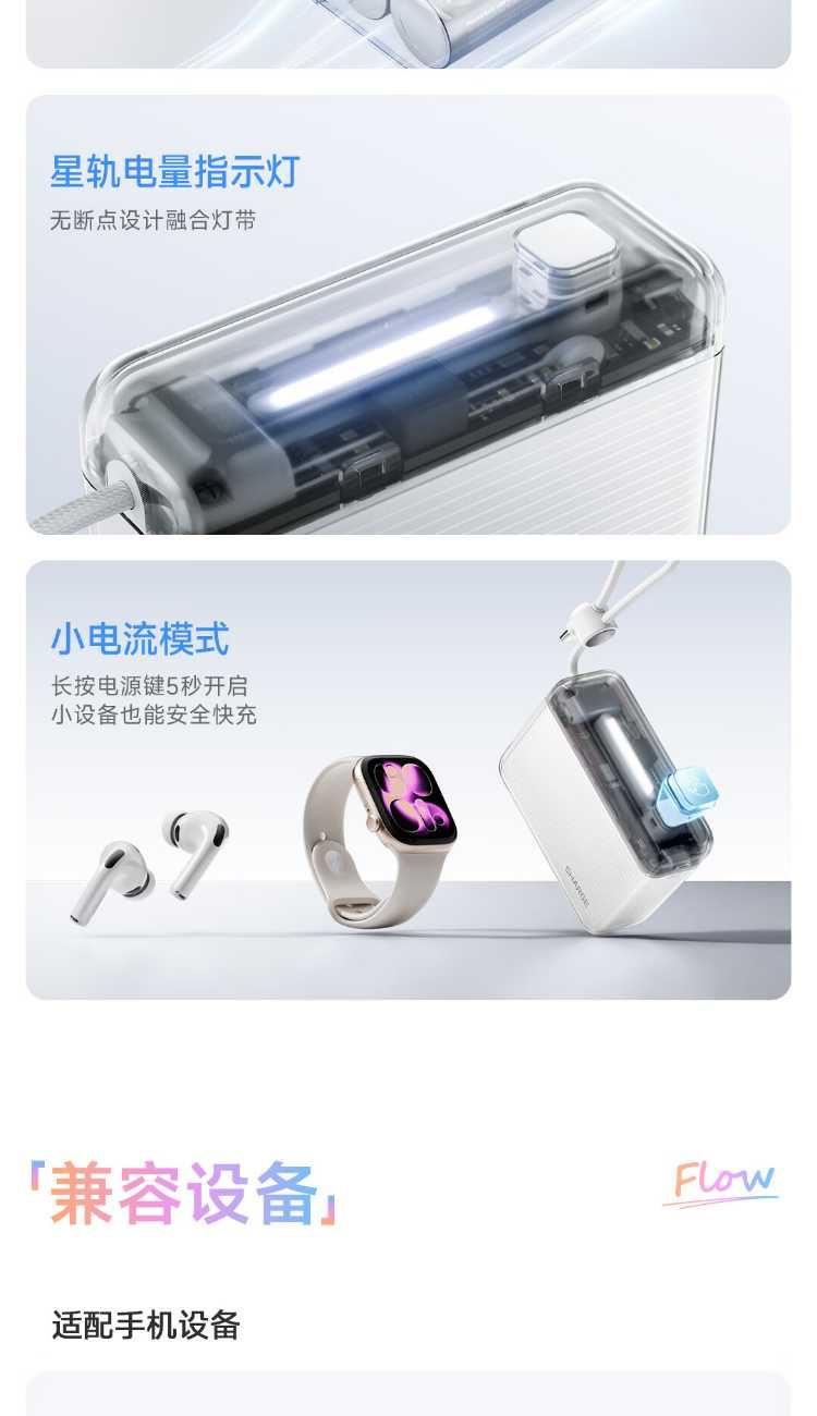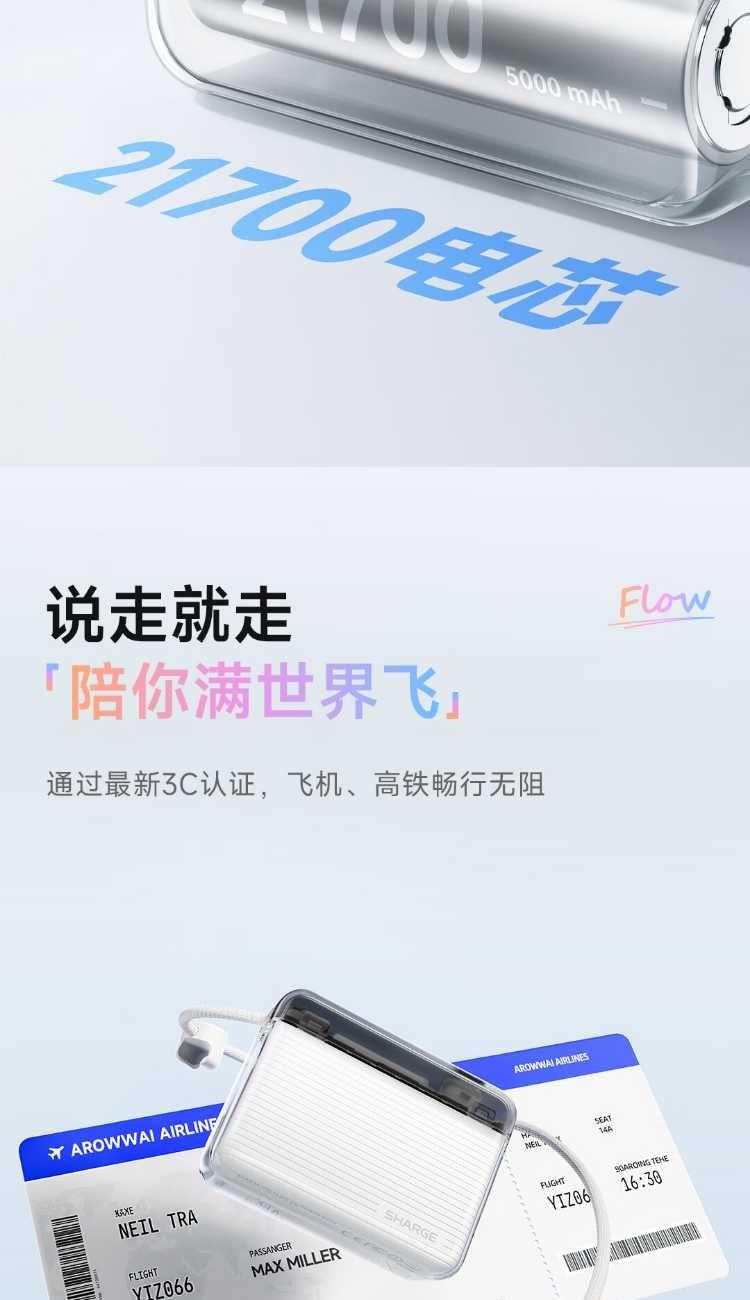 型号:P4 材质:防火PC(V0级) 容量:10000mAh 输出:USB-C线/口:22.5W (Max) USB-C线+USB-C口:5V⎓3A 颜色:黑色/白色/蓝色 接口类型:USB-C线,USB-C口 产品尺寸:8*6*2.85cm 包装尺寸:13.3*12.6*3.7cm 10000mAh,升级自带挂绳C线 升级22.5W快充,3C安全认证 C线+C口 双输出,同时充两台设备 冰感透明外壳设计,21700车规级电芯 星轨灯条电量灯设计,电量显示更加优雅
