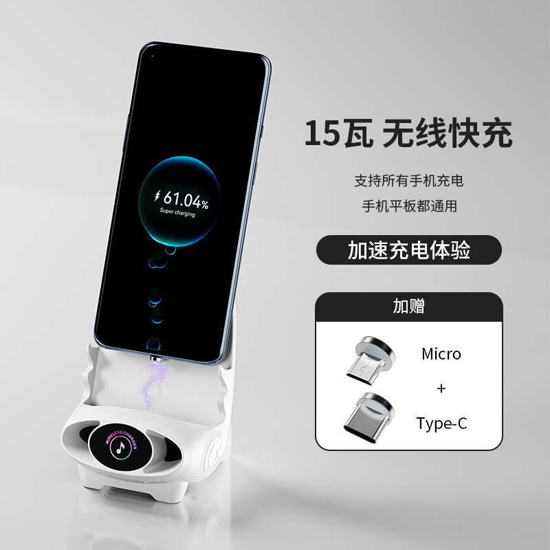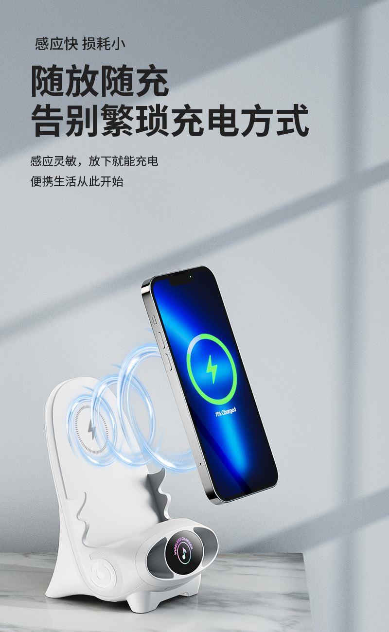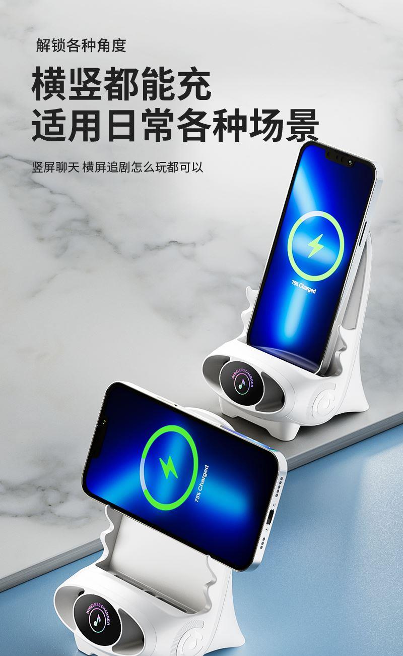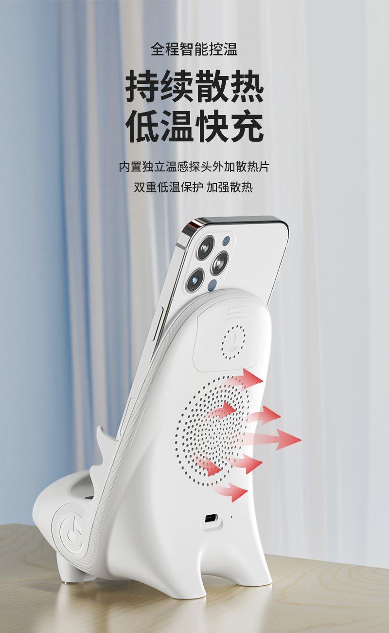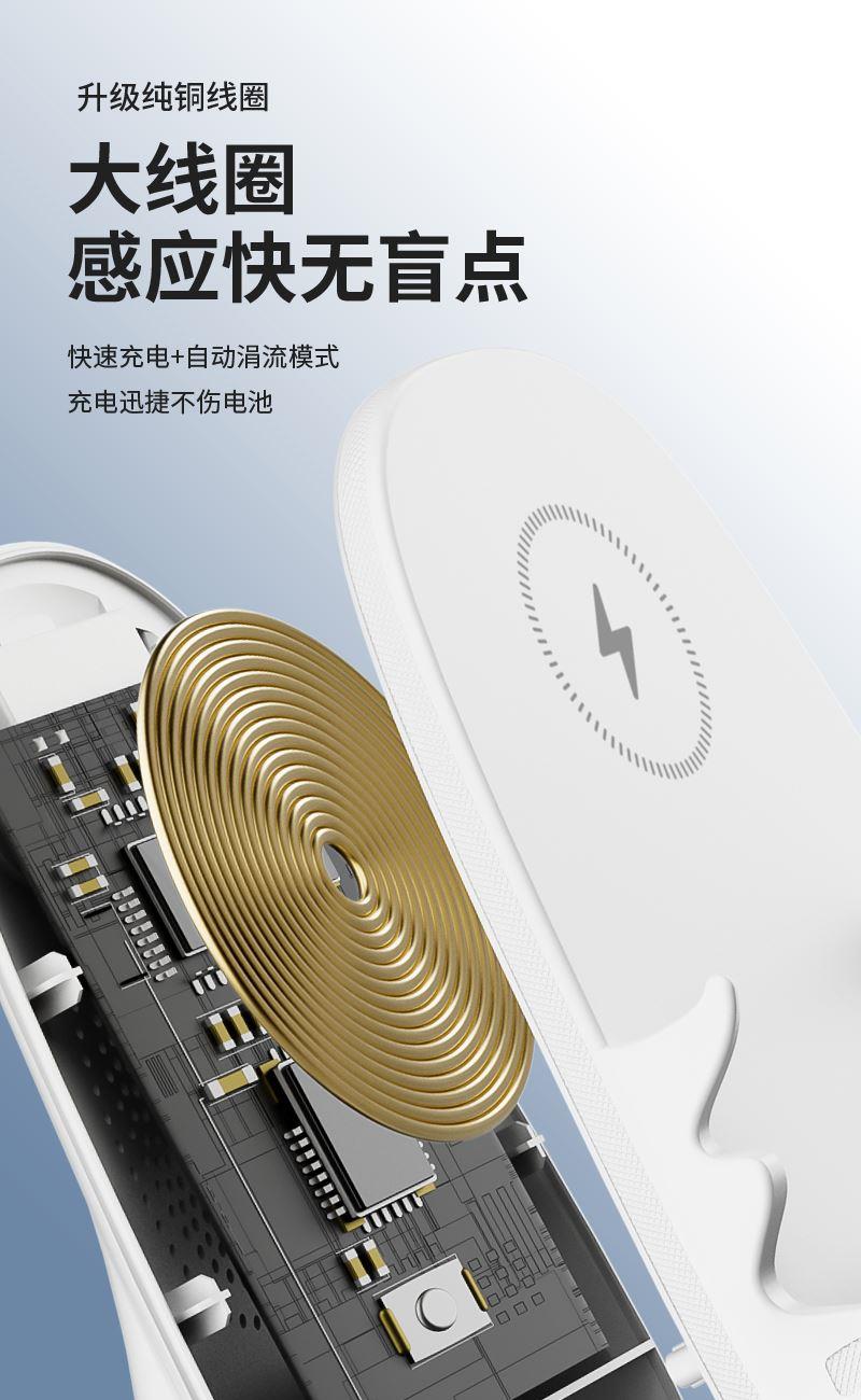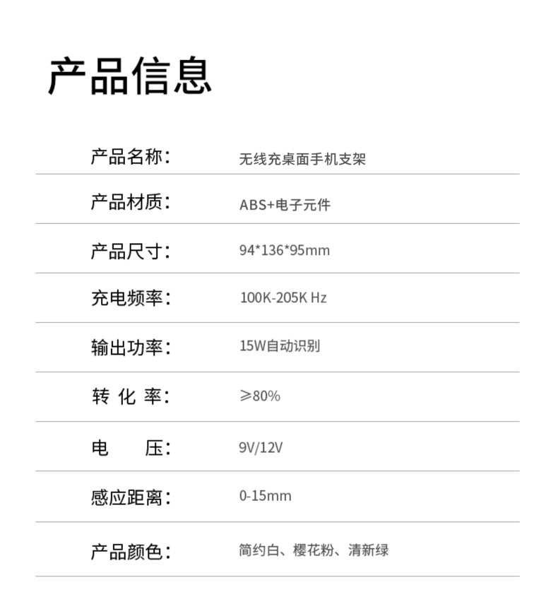 产品规格:9.4*9.57*13.6.cm 材 质:ABS+PC+金属支架+电子元件 输出功率:5W-15W自动识别 电 流:5V/2A-9V/1.67A 颜 色:白色 粉色 蓝色 产品净重:135g 适用机型:支持无线充的手机 产品特点 双重低温保护 加强散热 三角稳固原理 防晃不倾倒 升级纯铜线圈 感应快无盲点 支持双模式充电 15W无线快充+磁吸充 既是支架也能充电 支持4.5-11英寸手机平板设备
