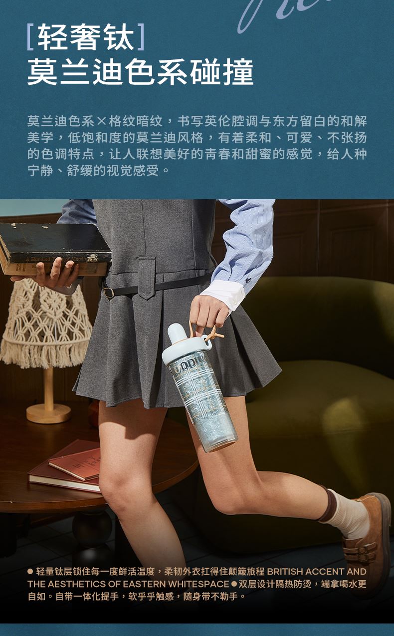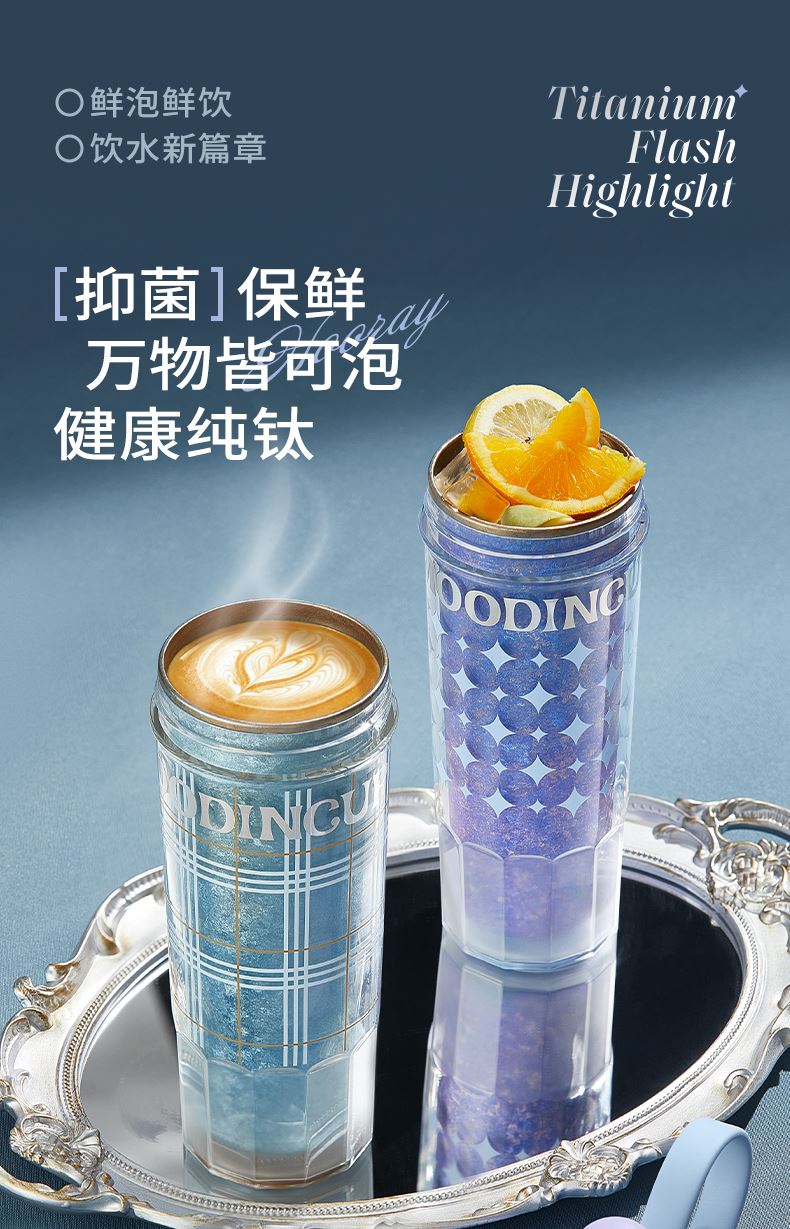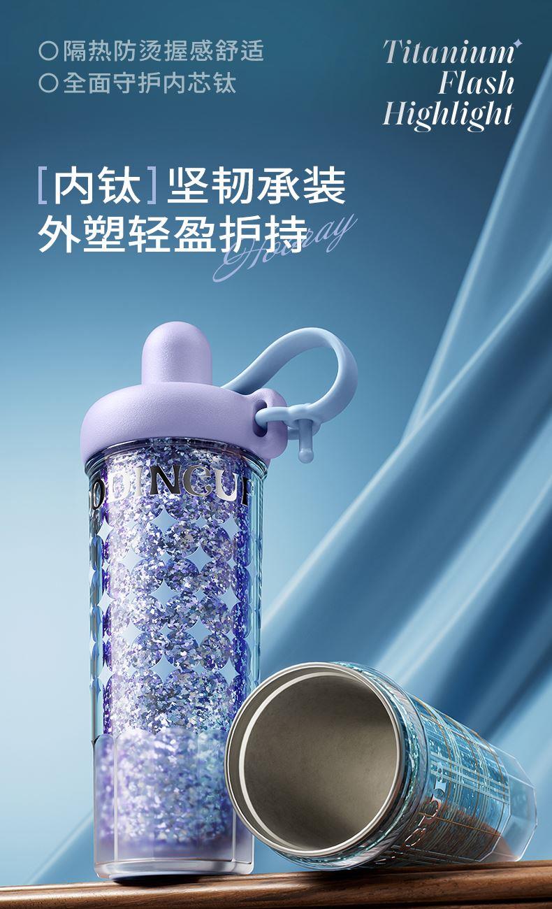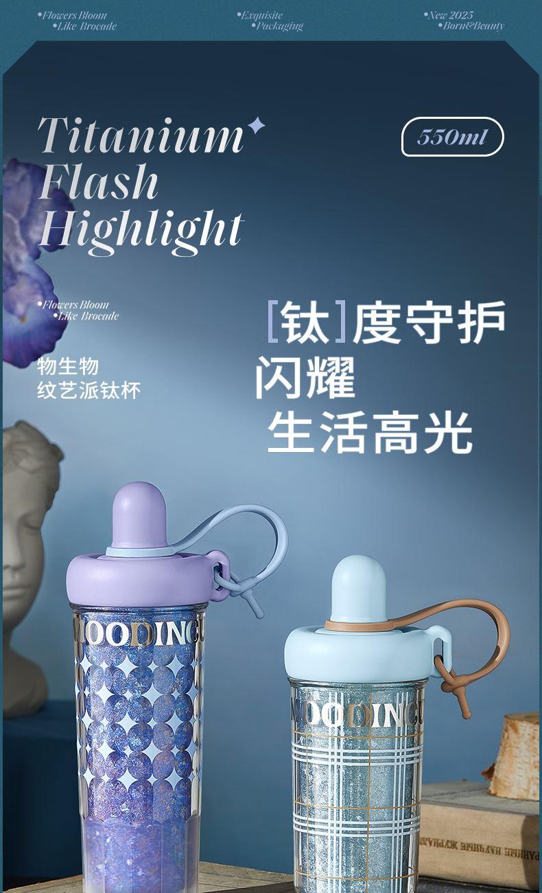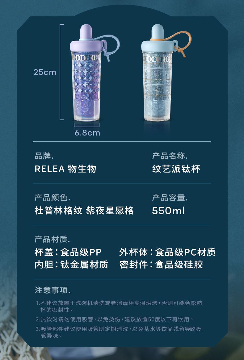 型号:JV012532-0550 颜色:杜普林格纹(蓝) 紫夜星愿格(紫) 材质:杯盖:pp 外杯体:pc 内胆:钛金 容量:550ml 1:纯钛内胆锁鲜 2一体式吸管盖防尘锁温防丢失