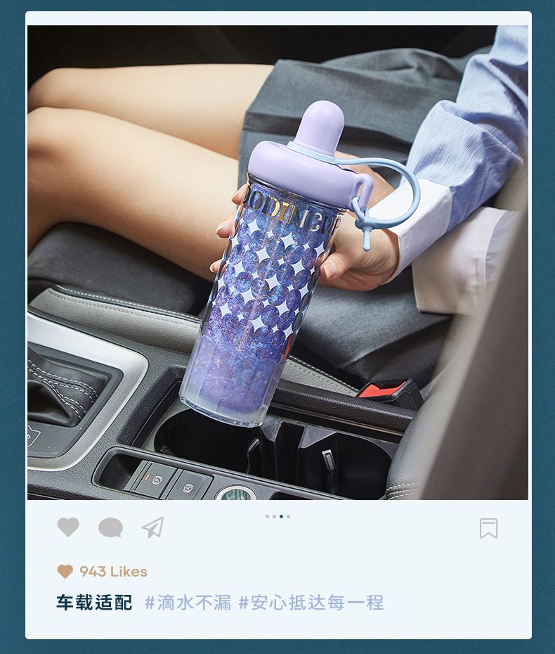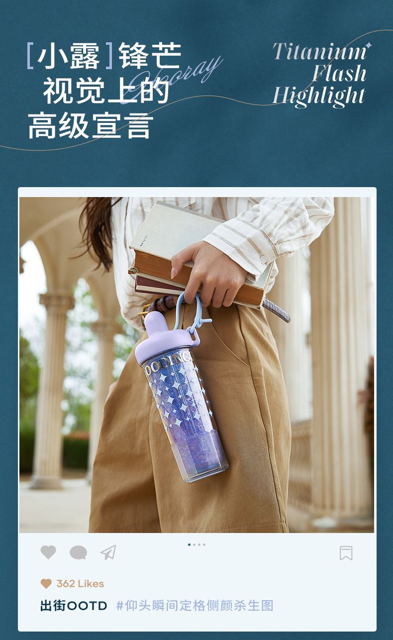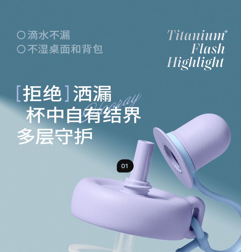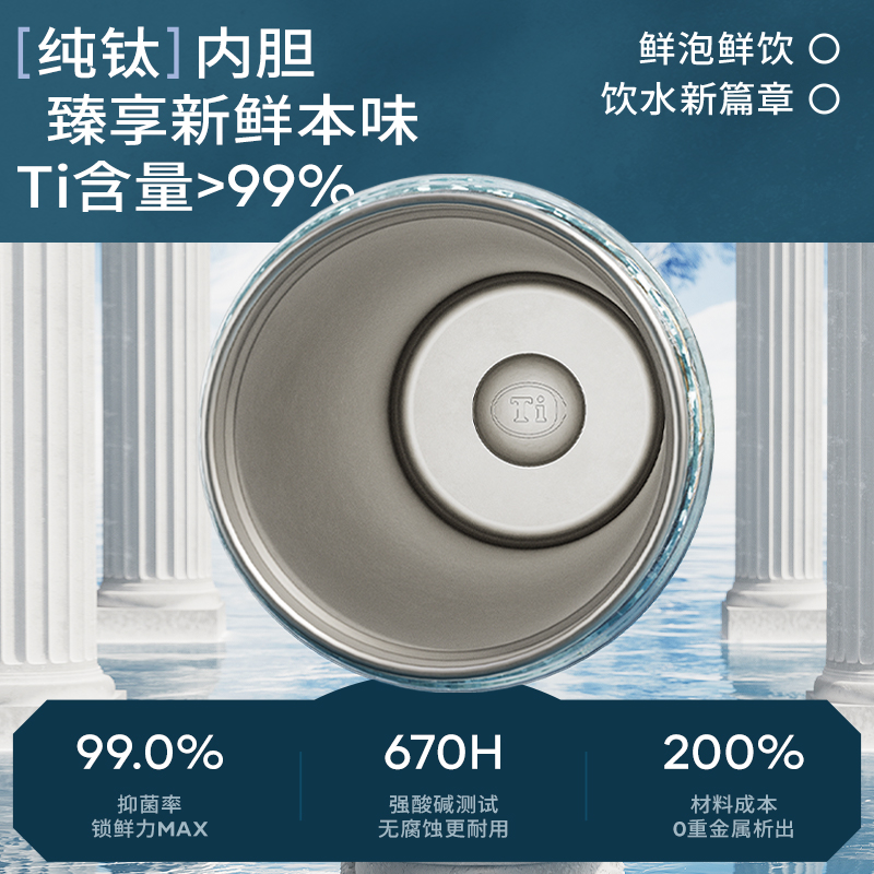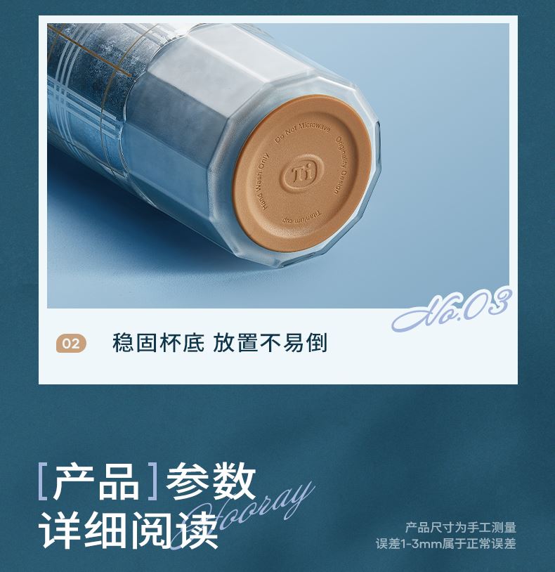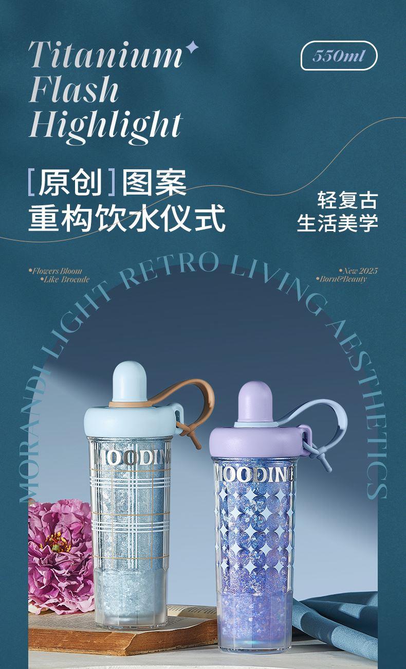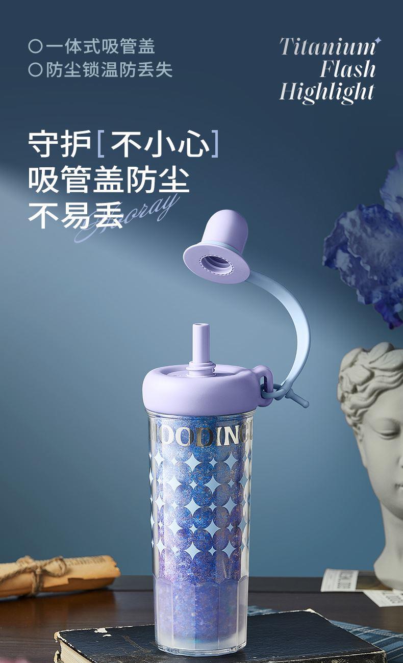 型号:JV012532-0550 颜色:杜普林格纹(蓝) 紫夜星愿格(紫) 材质:杯盖:pp 外杯体:pc 内胆:钛金 容量:550ml 1:纯钛内胆锁鲜 2一体式吸管盖防尘锁温防丢失