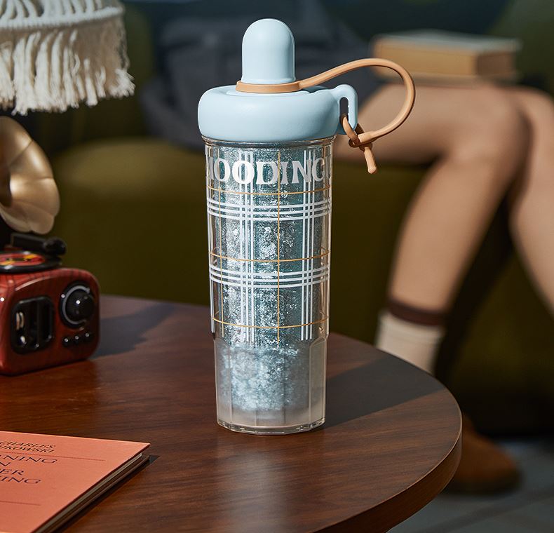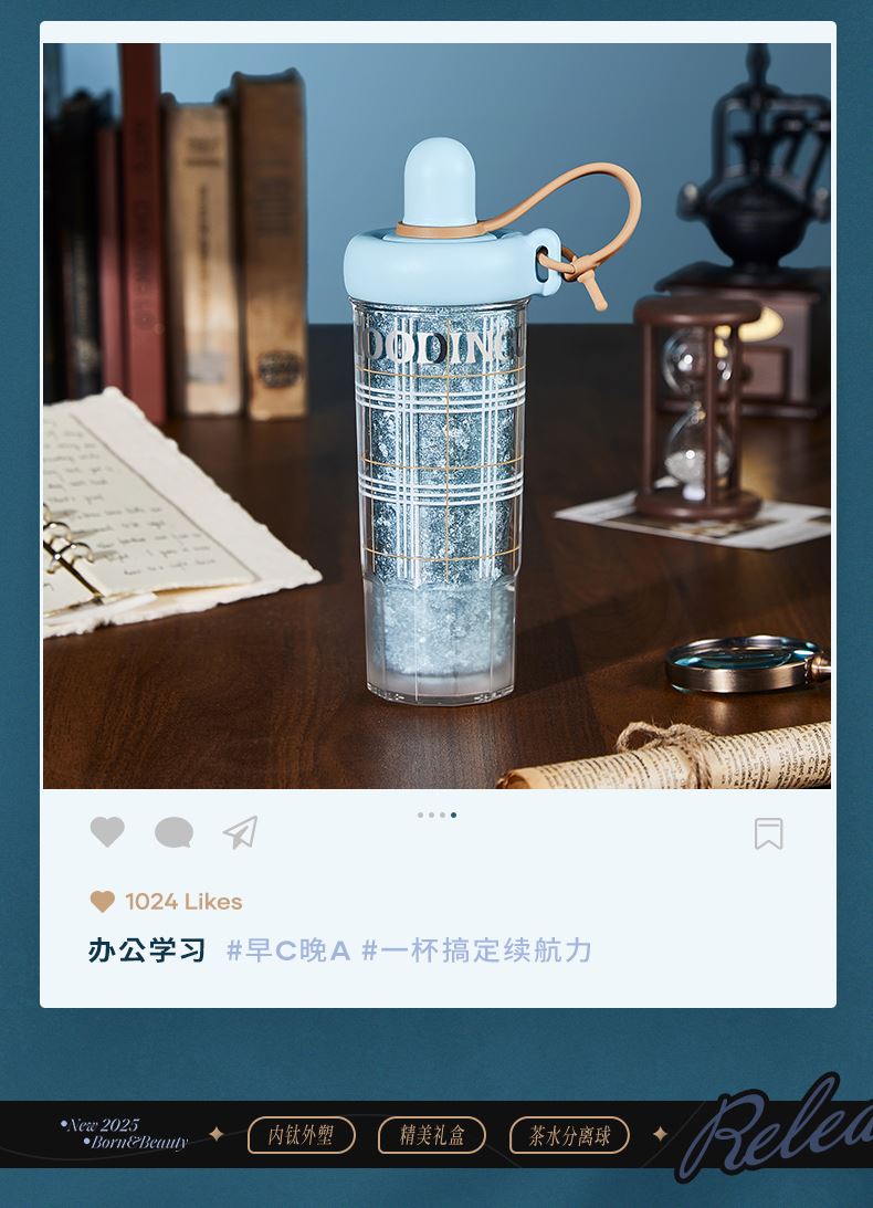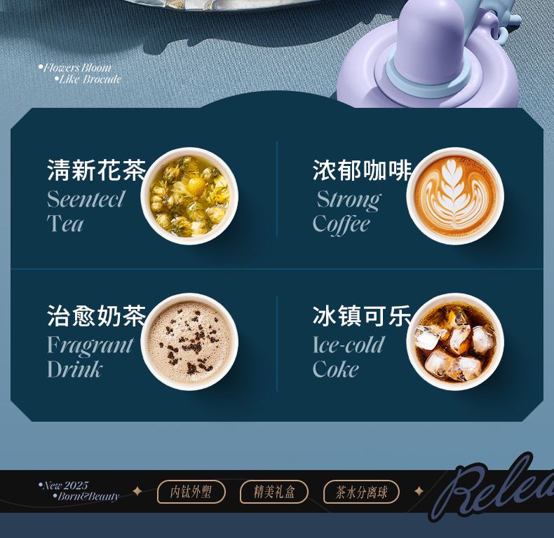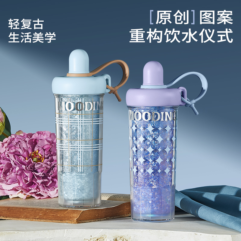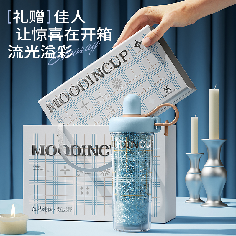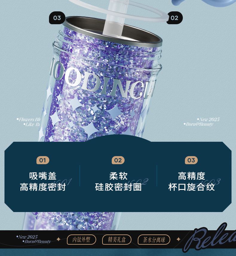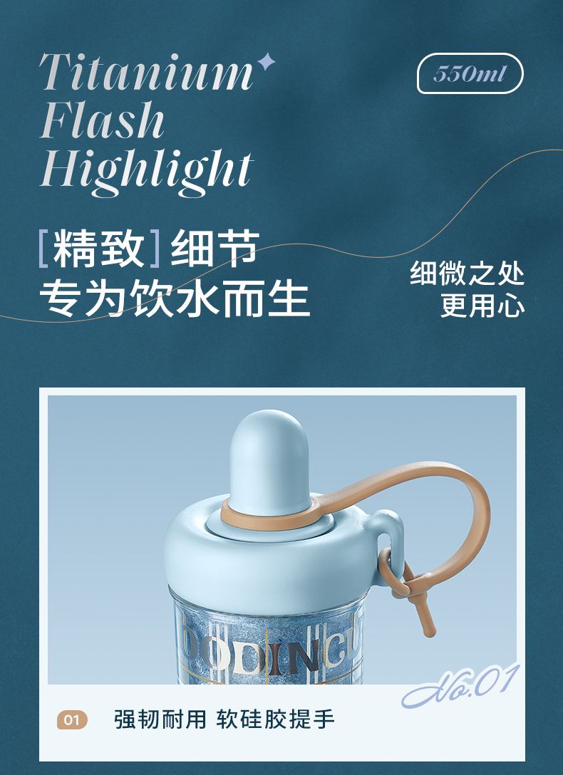 型号:JV012532-0550 颜色:杜普林格纹(蓝) 紫夜星愿格(紫) 材质:杯盖:pp 外杯体:pc 内胆:钛金 容量:550ml 1:纯钛内胆锁鲜 2一体式吸管盖防尘锁温防丢失