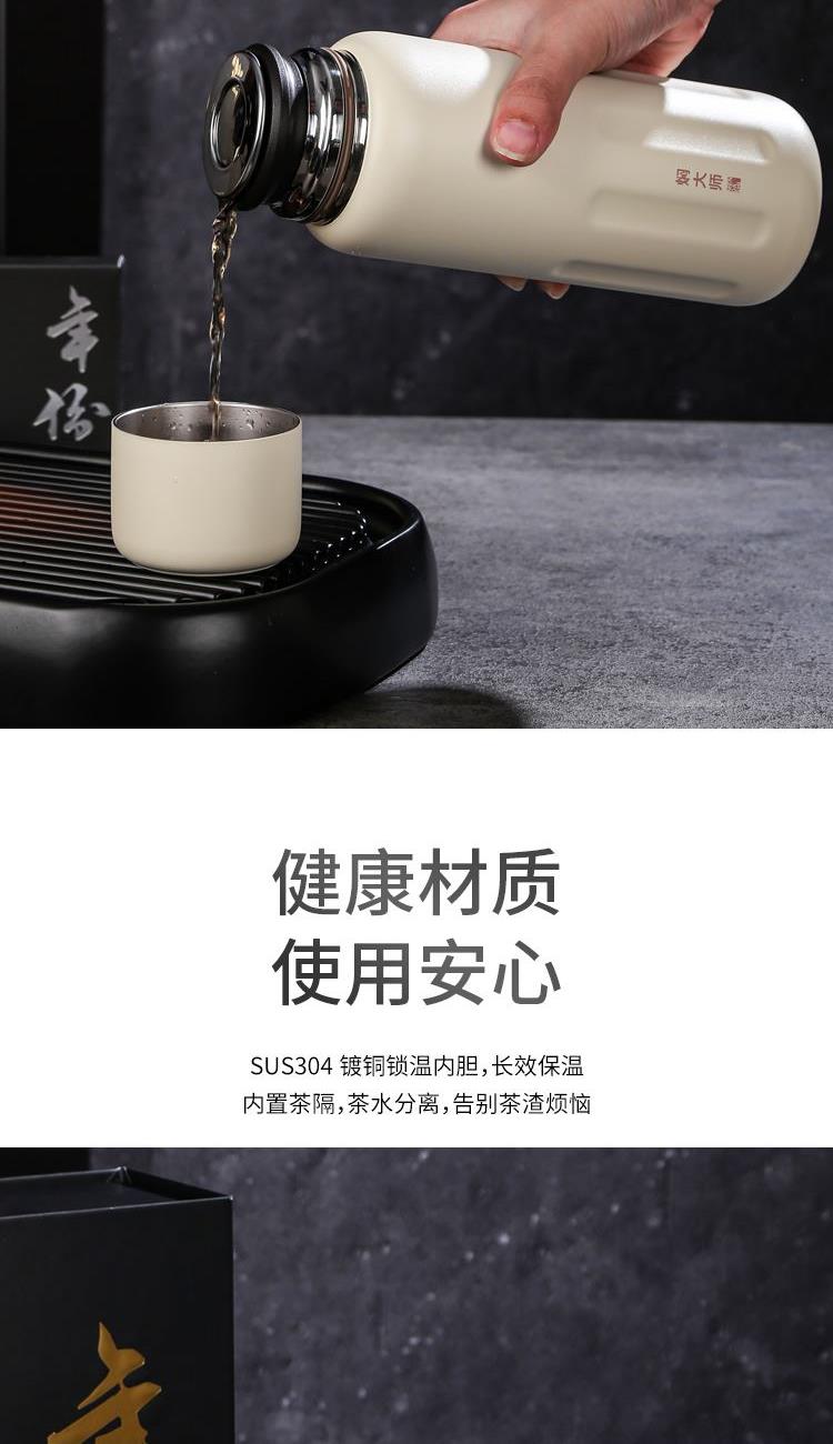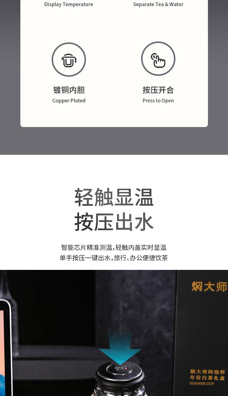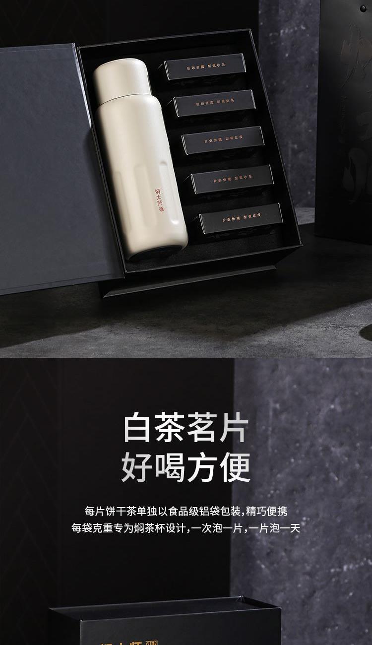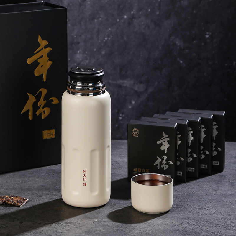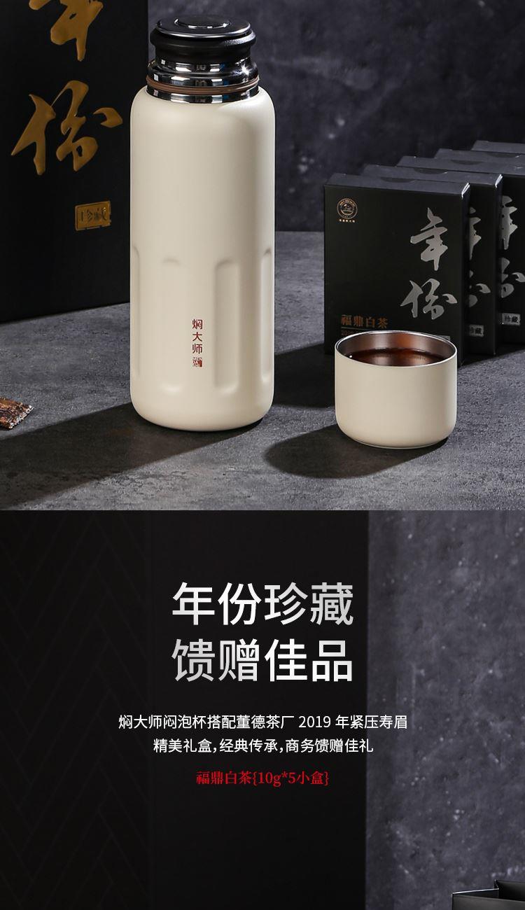 安全材质,健康守护 智能温显,随心掌控 一级寿眉,品质之选 闷泡随行,茶香随心 多用茶盅,茶趣盎然 外壳材质:奥氏体型不锈钢06Cr19Ni10(304) 内胆材质:奥氏体型不锈钢06Cr19Ni10(304) 茶隔材质:奥氏体型不锈钢06Cr17Ni12Mo2(316) 外 件:聚丙烯PP(食品接触用) 密 封 圈:食品接触用硅胶 保温效力:室温25℃条件下95℃满水测试24h≥41℃ 配 置:304不锈钢闷泡杯+316不锈钢茶隔+10G福鼎白茶*5 彩盒尺寸:180*100*280mm 装 箱 数:12只 茶叶参数: 产品:寿眉(紧压白茶) 产品类型:紧压寿眉 产品配料:2019年一级寿眉 净含量/规格:10g(2g"5袋)*5盒 贮存条件:密封、避光、防潮、防异味 产地:福建省宁德市福鼎市 生 产 商:福建省董德茶业有限公司