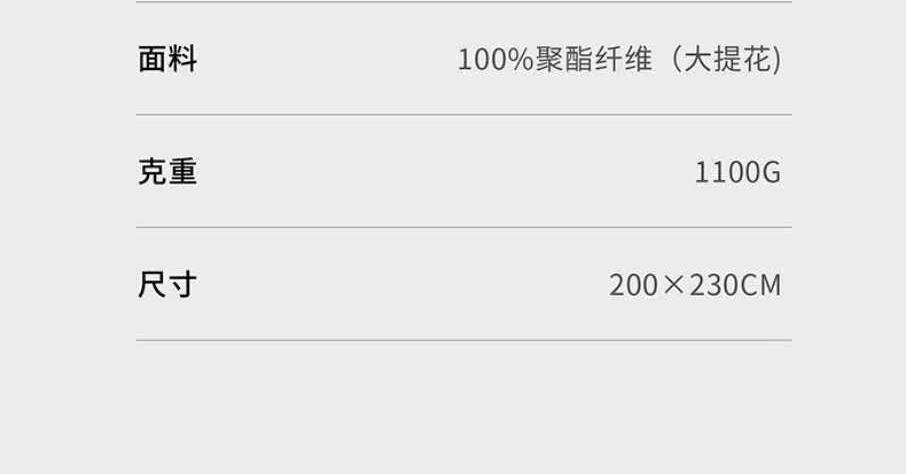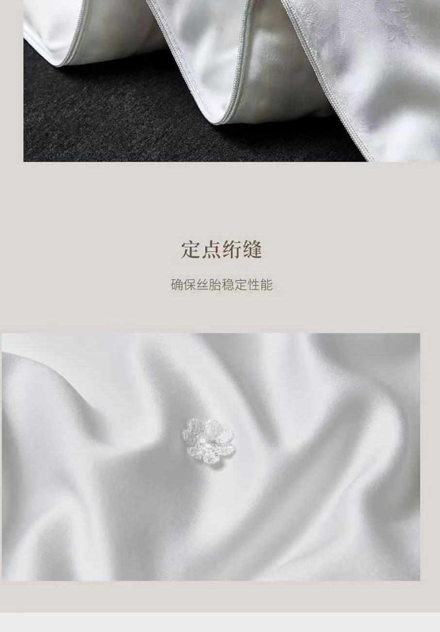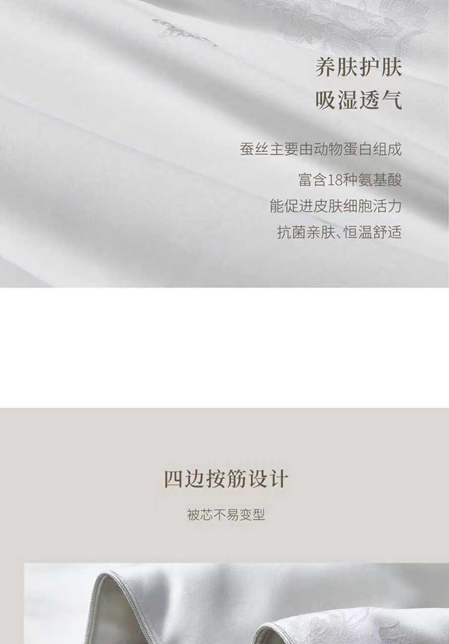 规格:200*230cm 面料:全涤提花面料 填充物: 桑蚕丝(绢制丝) 填充:1100g 包装:无纺布袋 1、选用优质提花面料:搭配经典素色小提花,让您从视觉上获得舒适体验,同时提花面料更贴合被套。 2、优质填充:采用0污蚕丝、有机丝源、天然健康;蚕丝内部中空,纤维重量更轻,无压迫感,透气性优良,柔滑质感带来舒适睡眠; 3、靠究细节:四边按筋设计使被芯不易变型,被面多个订点绗缝确保丝胎稳定性能。天然柔和,婴幼儿接触无刺激
