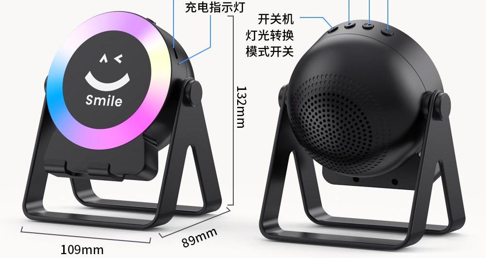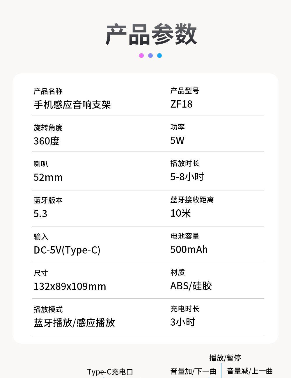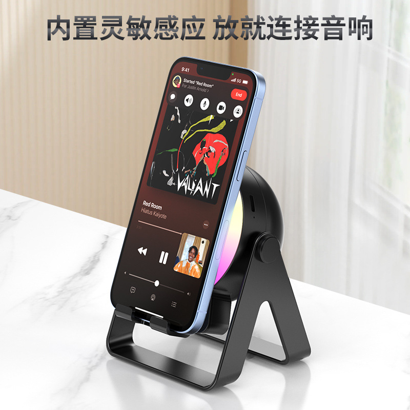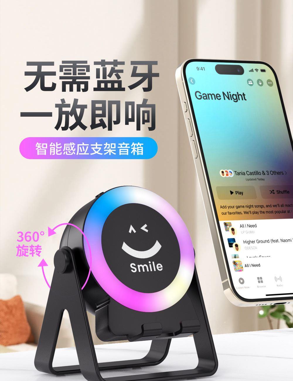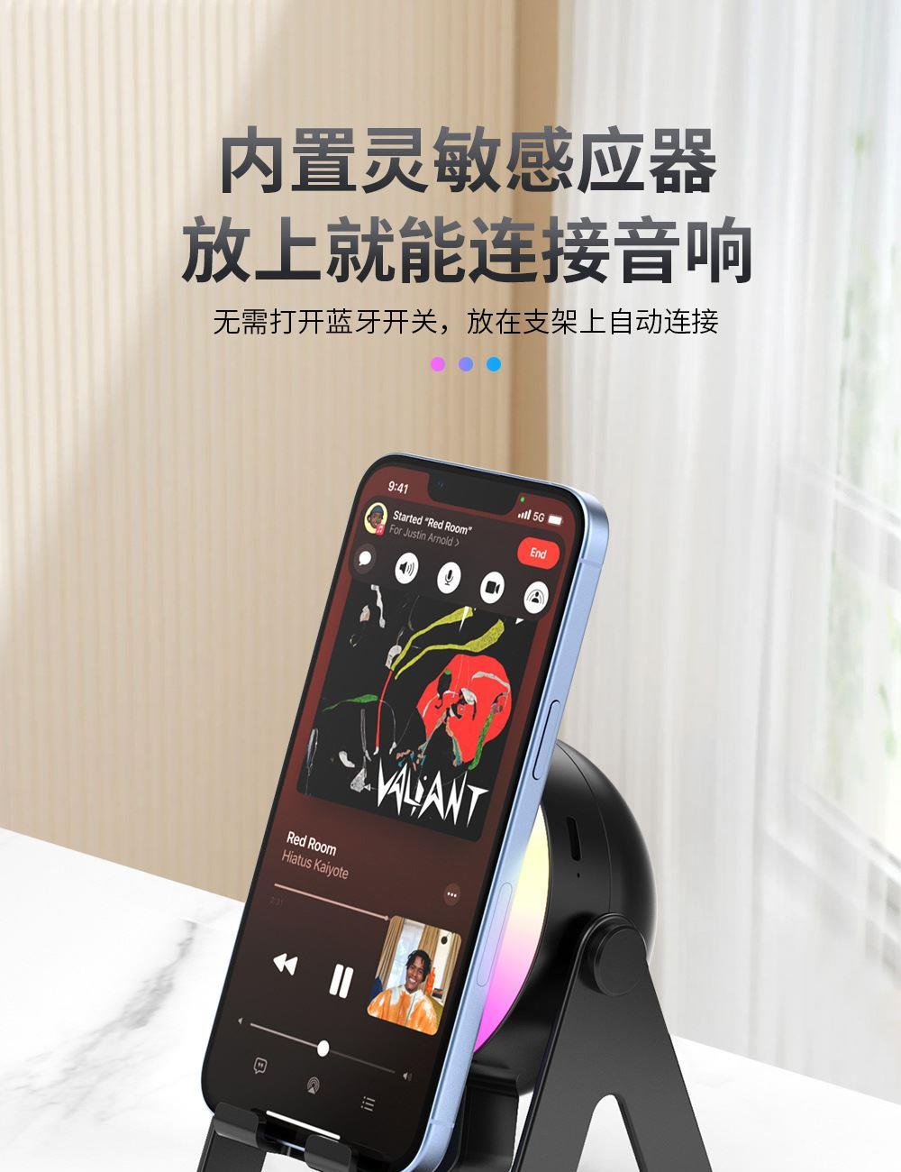 电池容量:500毫安 输入电压:DC5V 蓝牙版本:5.3 产品尺寸:132*89*109mm 产品重量:250g 产品颜色:黑色 感应连接+蓝牙连接+手机支架+LED氛围灯多合一 声音感应式连接,无需蓝牙放上自动连接 蓝牙5.3连接,10米远距离连接 52mm扩音单元,HIFI9D全景音效 多模式LED动态炫彩氛围灯 500mAh容量电池,可充电可插电使用