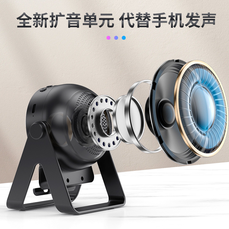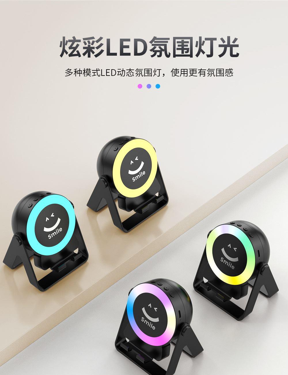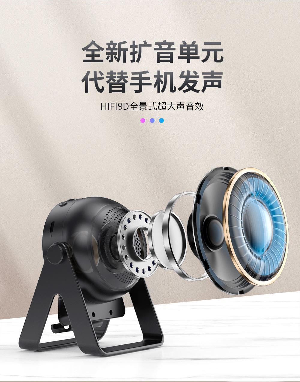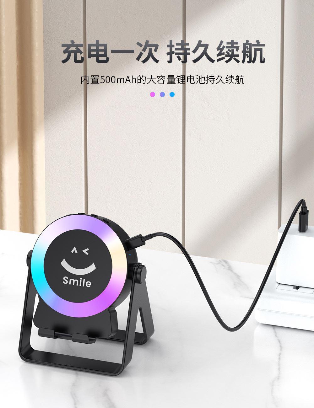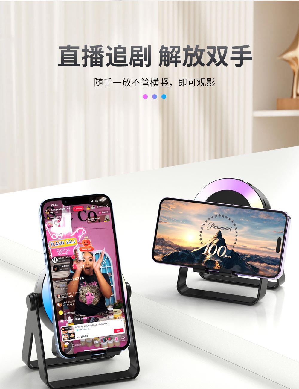 电池容量:500毫安 输入电压:DC5V 蓝牙版本:5.3 产品尺寸:132*89*109mm 产品重量:250g 产品颜色:黑色 感应连接+蓝牙连接+手机支架+LED氛围灯多合一 声音感应式连接,无需蓝牙放上自动连接 蓝牙5.3连接,10米远距离连接 52mm扩音单元,HIFI9D全景音效 多模式LED动态炫彩氛围灯 500mAh容量电池,可充电可插电使用