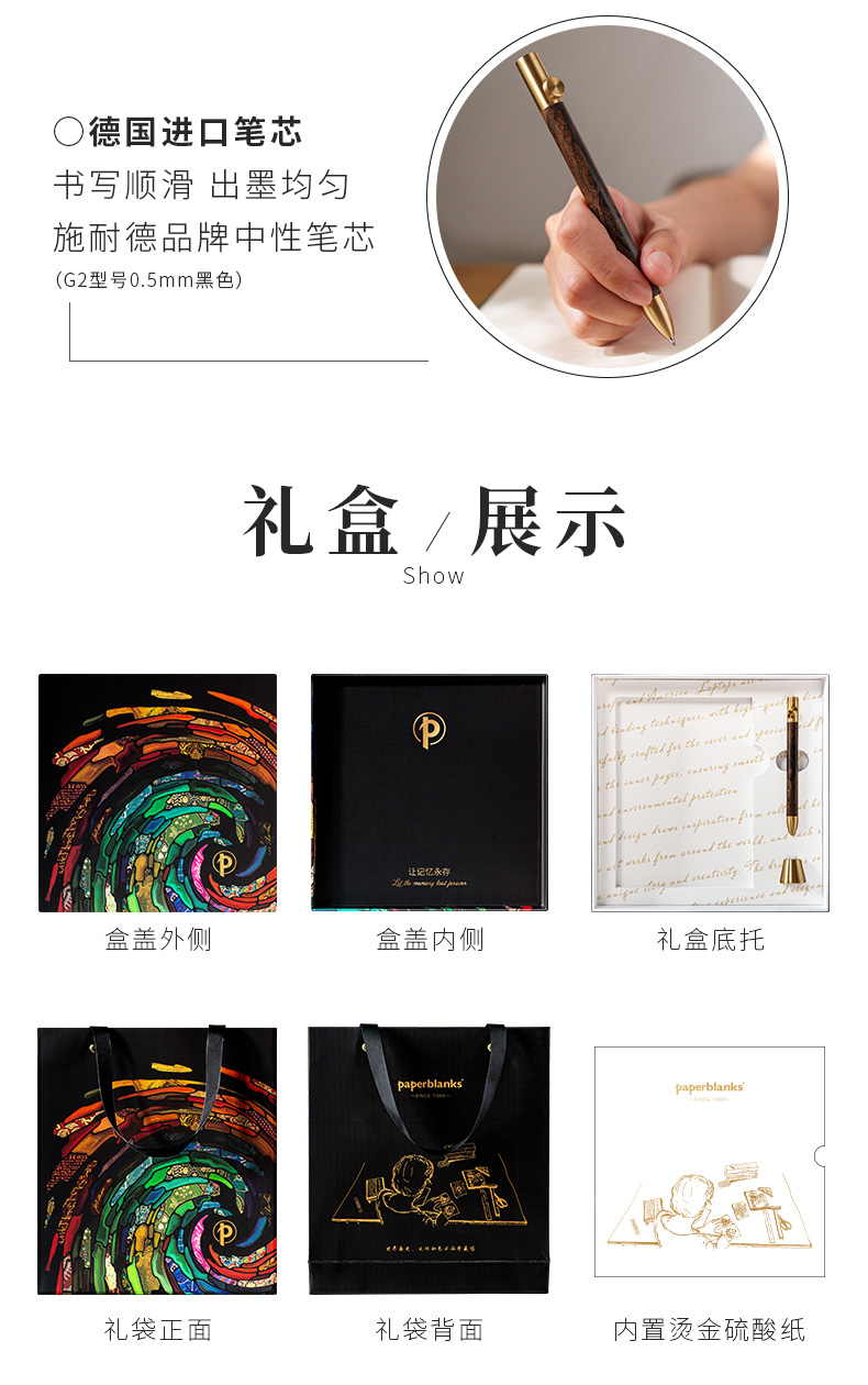 礼盒组件:黑柿木水性笔1只、黄铜笔座1个、中本笔记本、天地盖礼盒、彩色礼袋