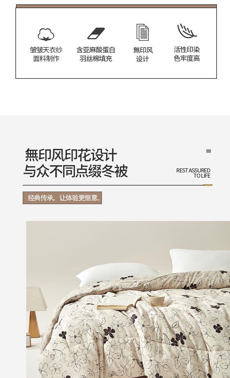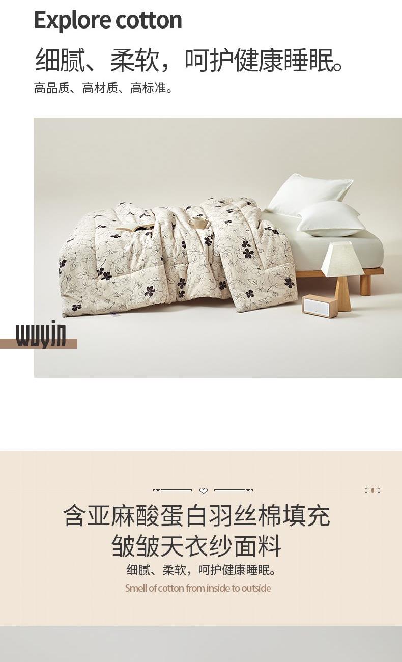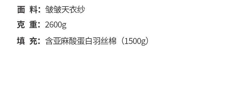 规 格:200×230(±2)cm 克 重:2600g 面 料:皱皱天衣纱 填 充:含亚麻酸蛋白羽丝棉(1500g) 皱皱天衣纱面料,细腻、柔软,亲肤,呵护健康睡眠。 含亚麻酸蛋白羽丝棉填充-植物品,健康更贴心的呵护。 高品质、高材质、高标准,一款对生活高度负责的产品