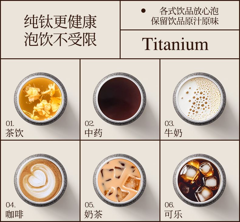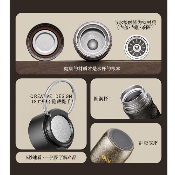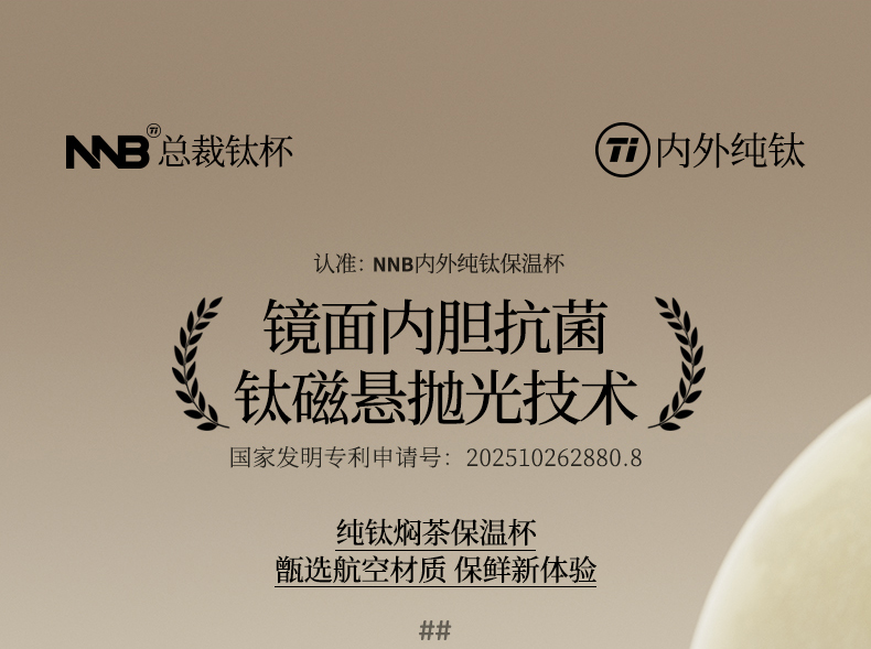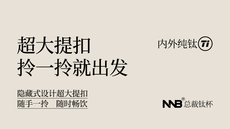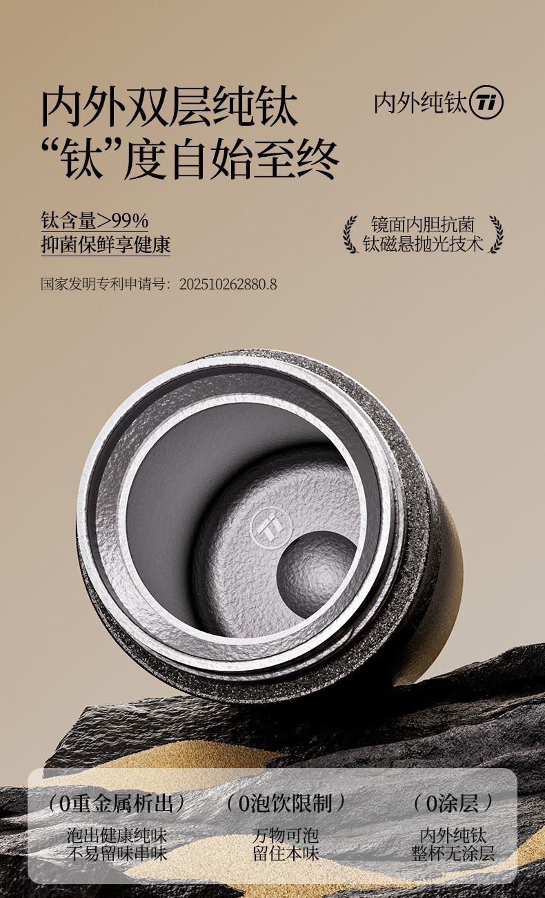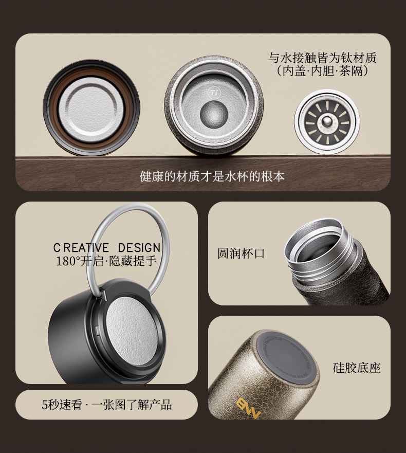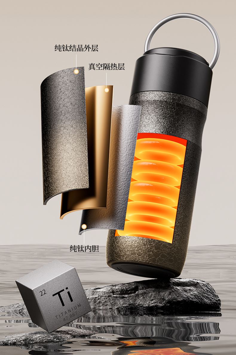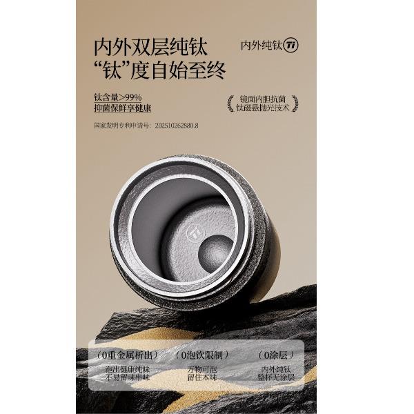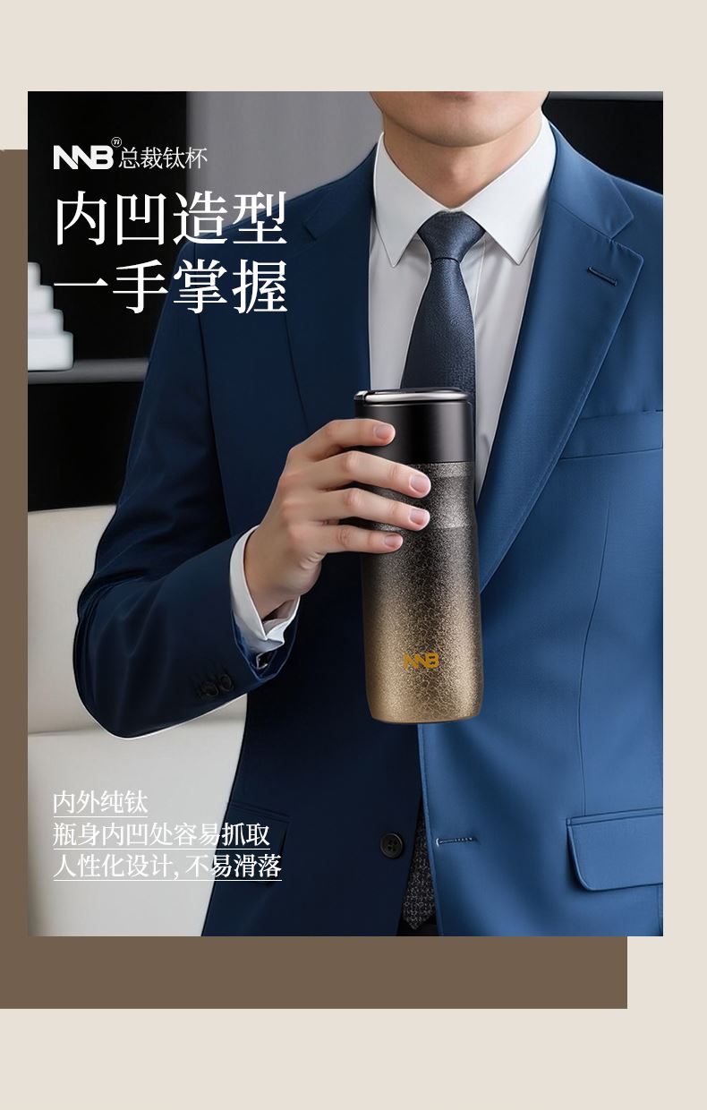 产品规格: 品 牌:NNB/牛牛杯 容 量:500ml 尺 寸:6.4*7.1*19.8cm 内 胆:纯钛(TA1) 外 壳:纯钛(TA1) 杯 盖:PP聚丙烯 密封图:硅橡胶 包 装:彩盒/礼盒 产品特点: ✅ 99.5%高纯度钛材,耐酸碱抗腐蚀 ✅ 双层真空锁温技术,6-8h保温锁冷 ✅ 钛磁悬镜面抛光技术 ✅ 执行标准:QB/T 5612-2021《钛杯》
