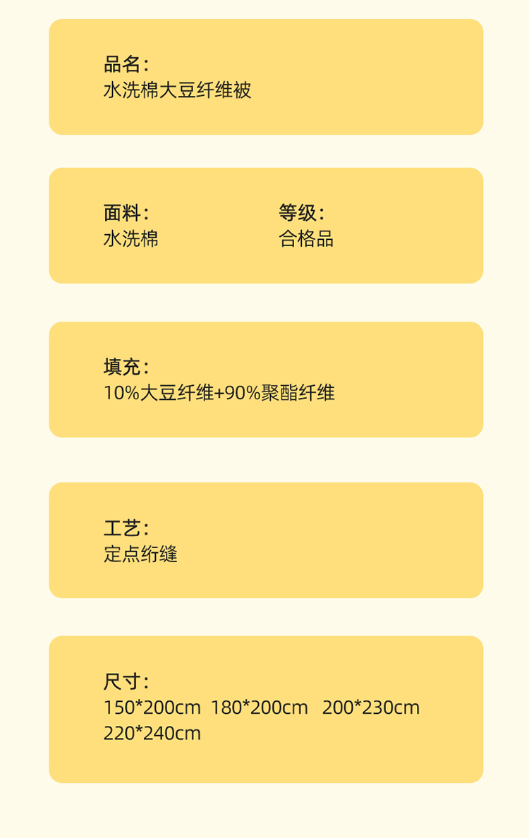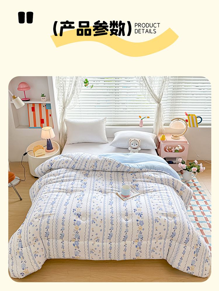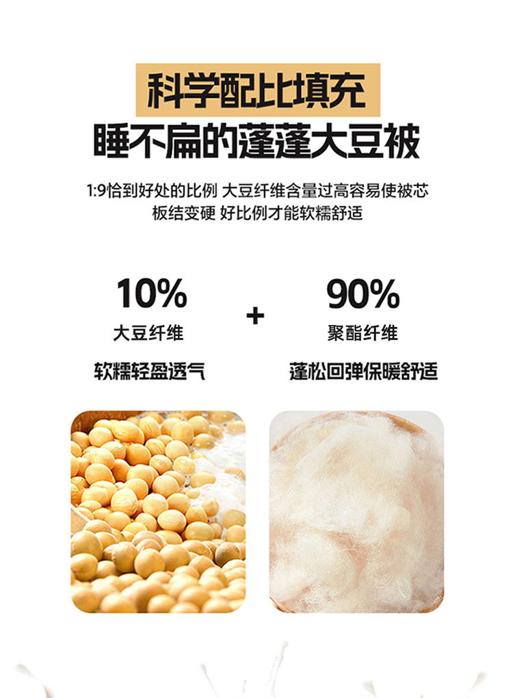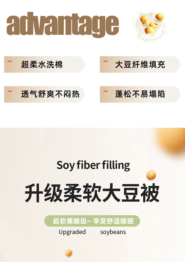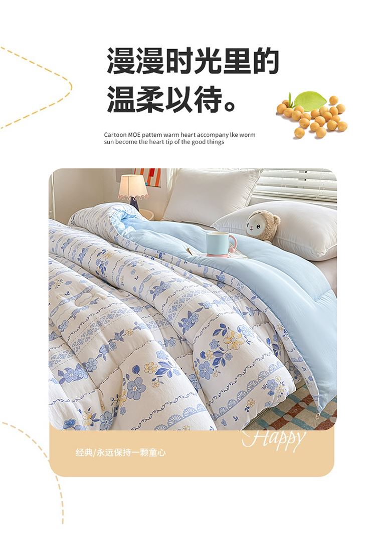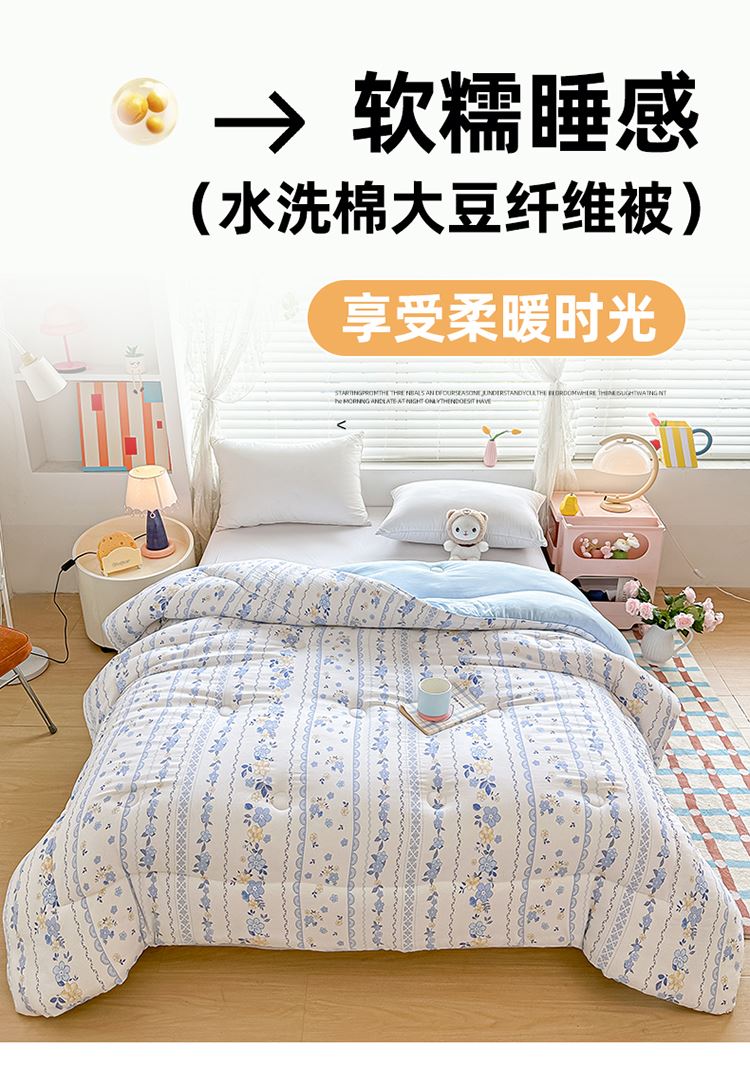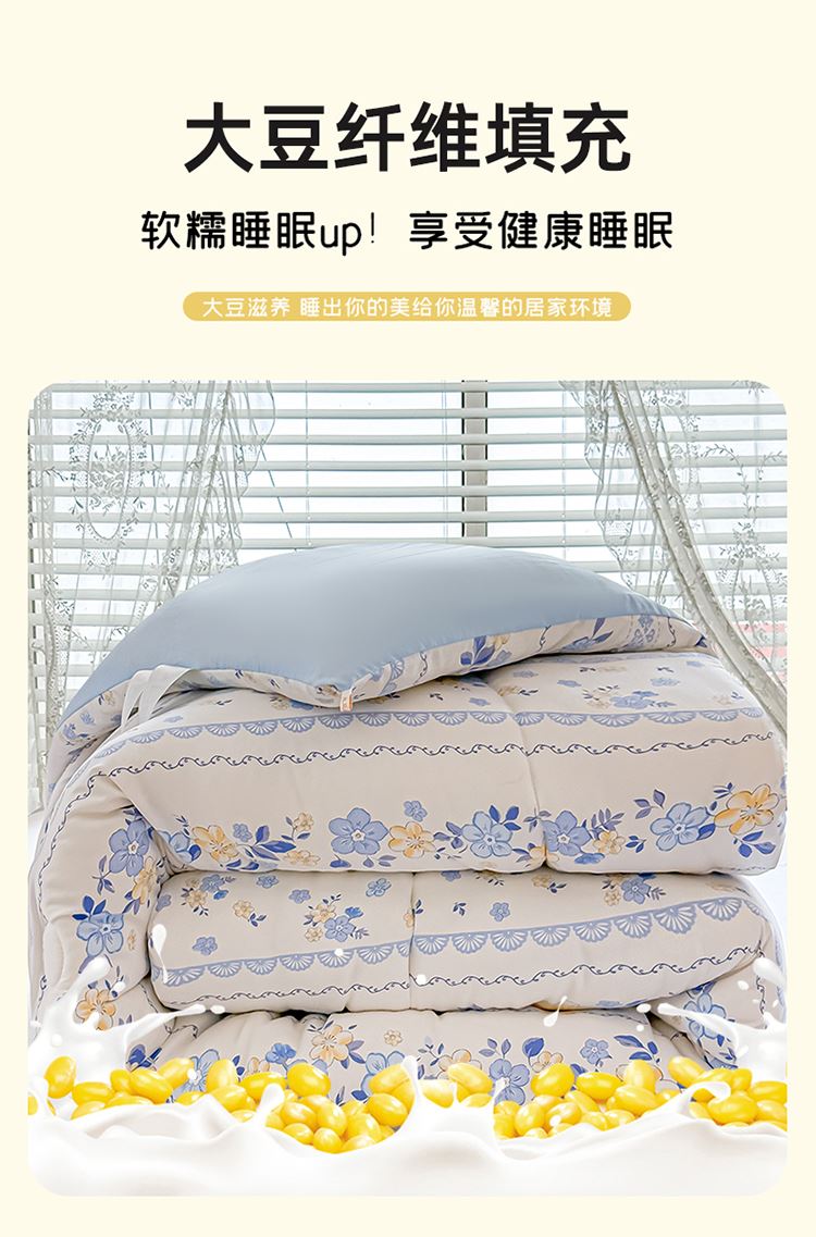 1:适合裸睡,手感舒适细腻软糯透气性好,陪伴你一天好心情 睡眠质量up!会呼吸更透气 2:大豆纤维填充软糯睡眠up!享受健康睡眠 3:健康舒适纤维,大豆蛋白加工制成媲美羊绒的柔软触感,棉的保暖性,绵软不易结团 4尺寸 :200*230cm 重量:约2.5kg 包装: 彩盒