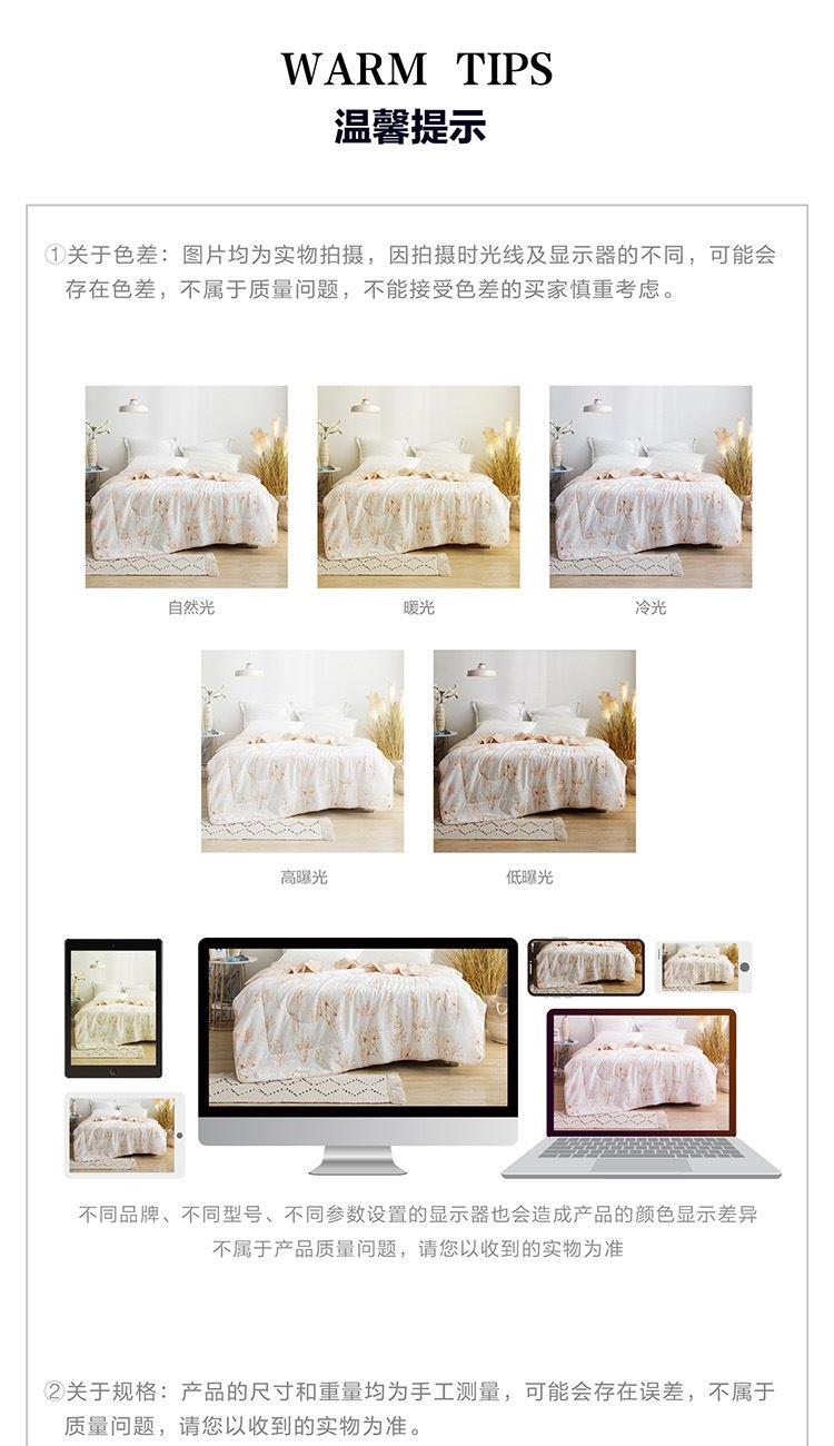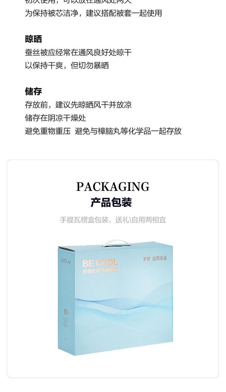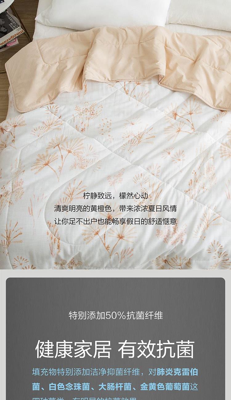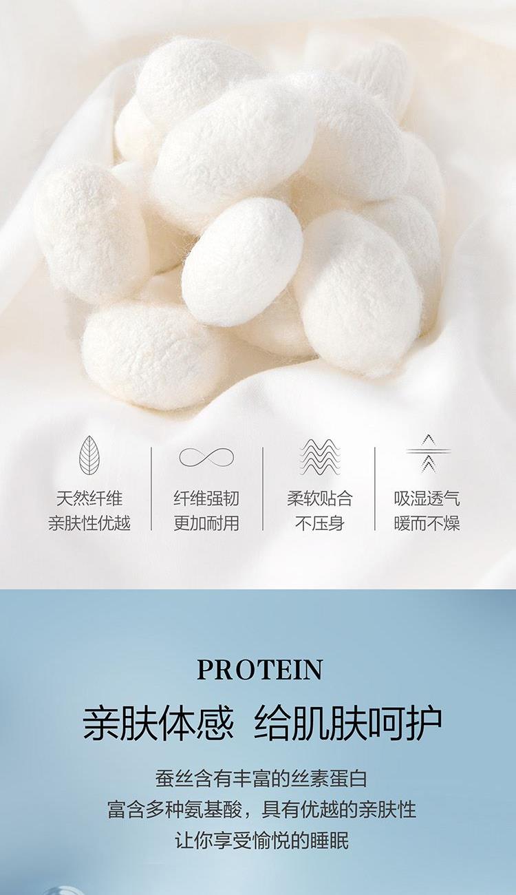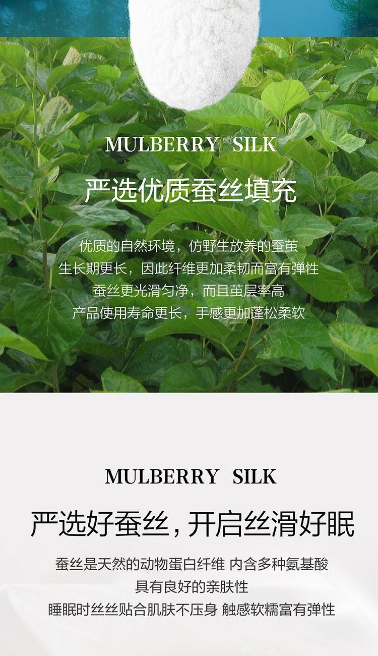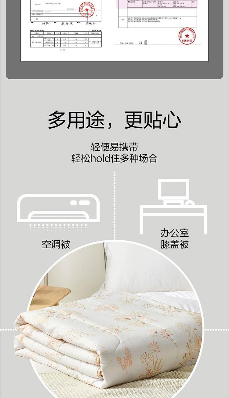面料:聚酯纤维 规格:150cm*200cm 填充材质:50%柞蚕丝(中长丝绵)+50%聚酯纤维 填充重量:240g