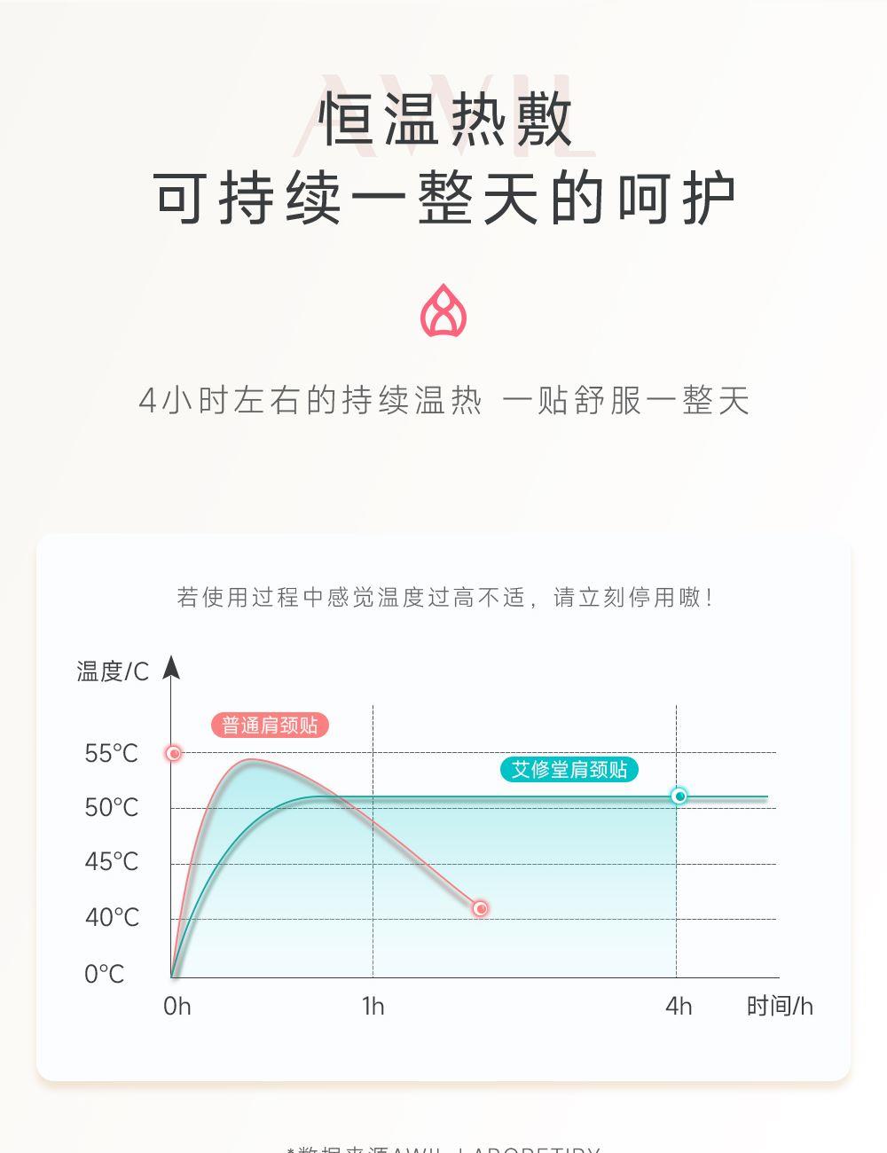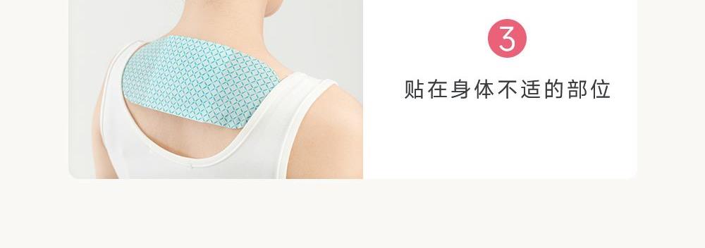 1、使用方便,随贴随走; 2、三分钟见效,42度恒温持续发热8小时,无刺激; 3、疏通经络,化瘀,迅速缓解改善肩颈腰腿疼痛,哪儿痛贴哪儿。